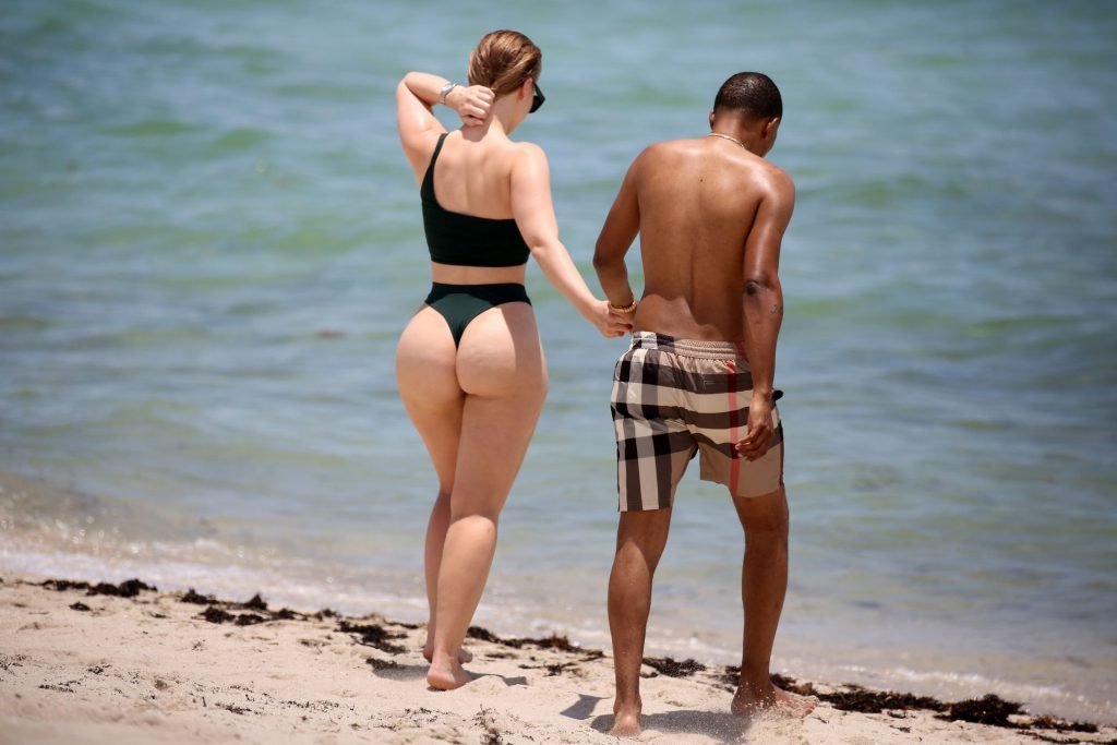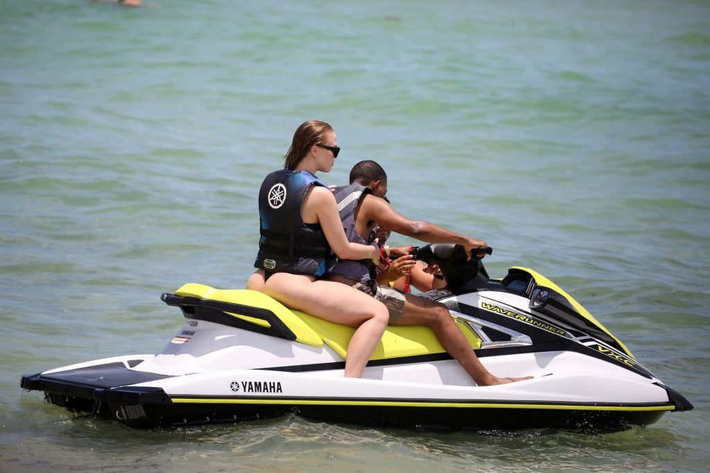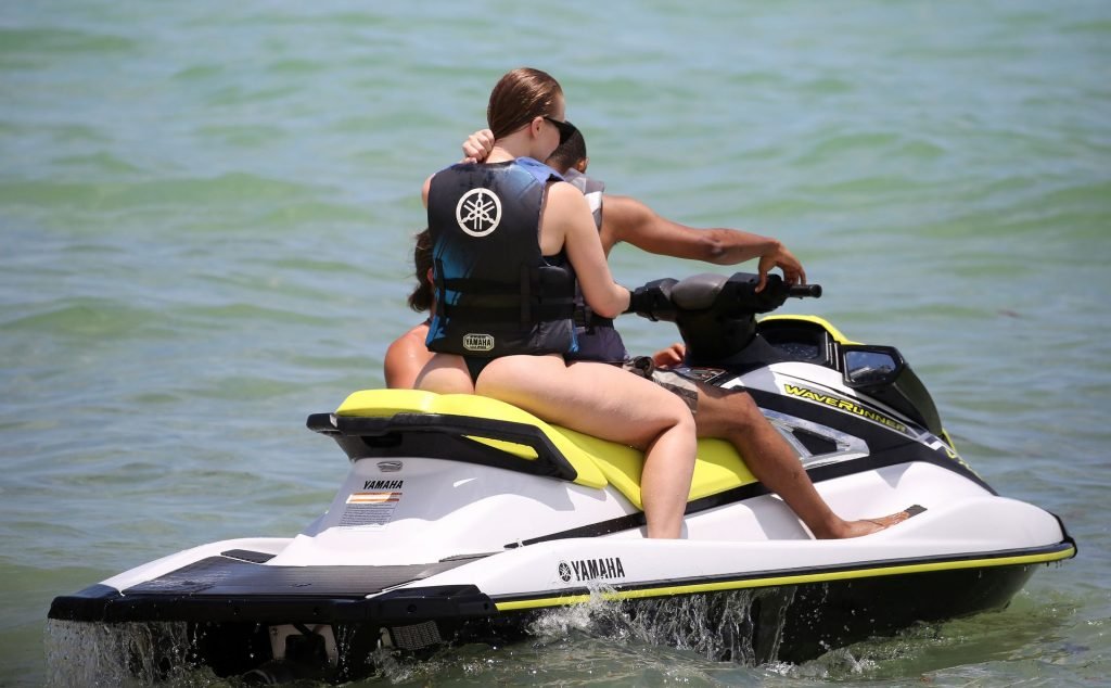 La créatrice de maillots de bain Bianca Elouise met en valeur ses courbes dans un maillot de bain Chanel transparent avant de faire une promenade en jet ski à Miami, 11/07/2019.