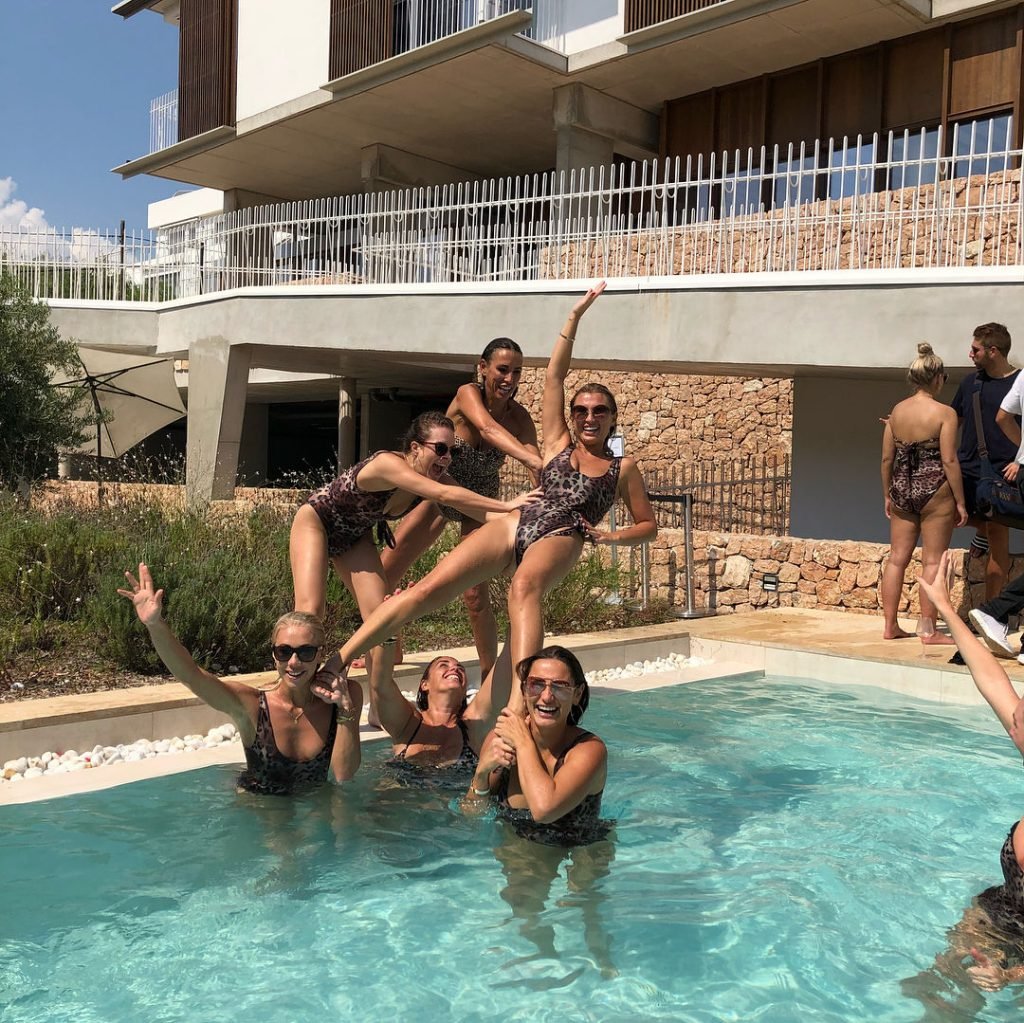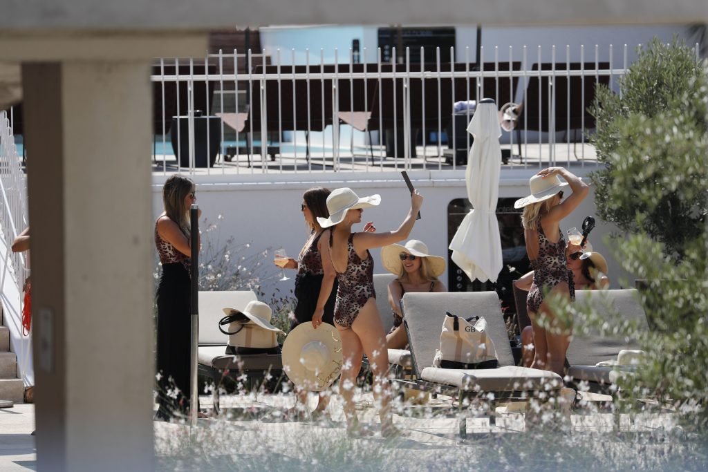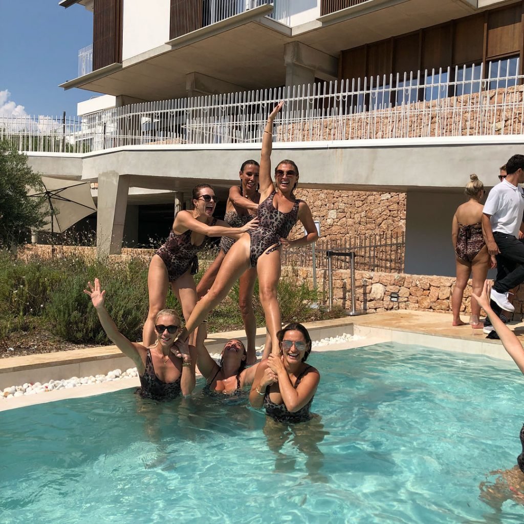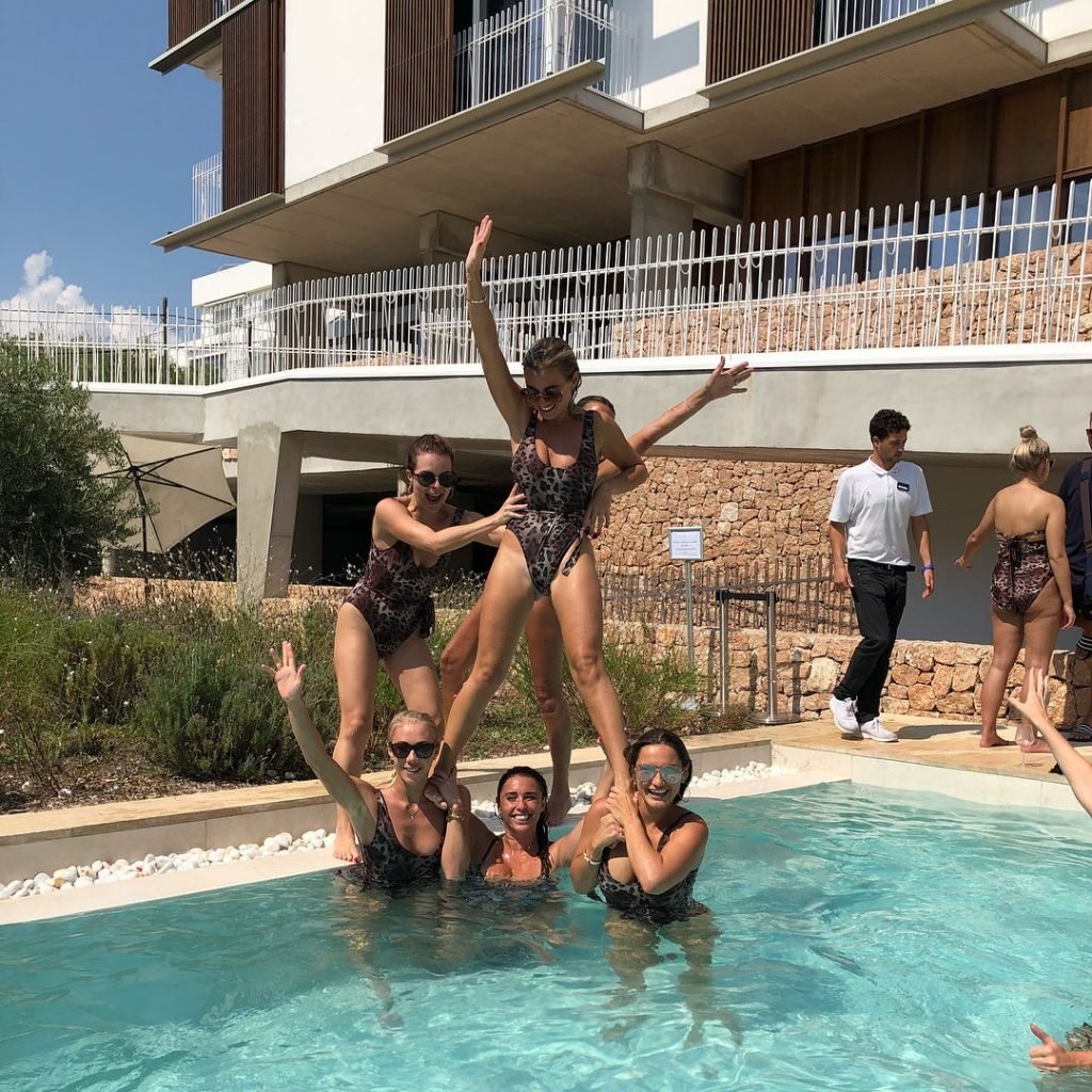 Billie Faiers est vue à Ibiza lors de son enterrement de vie de jeune fille où tous ses invités portaient des maillots une pièce imprimés léopard, 23/08/2018. Parmi les invités figuraient les stars de TOWIE Sam Faiers sa sœur et Ferne McCann.