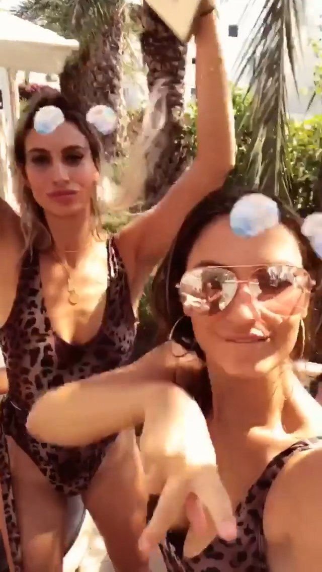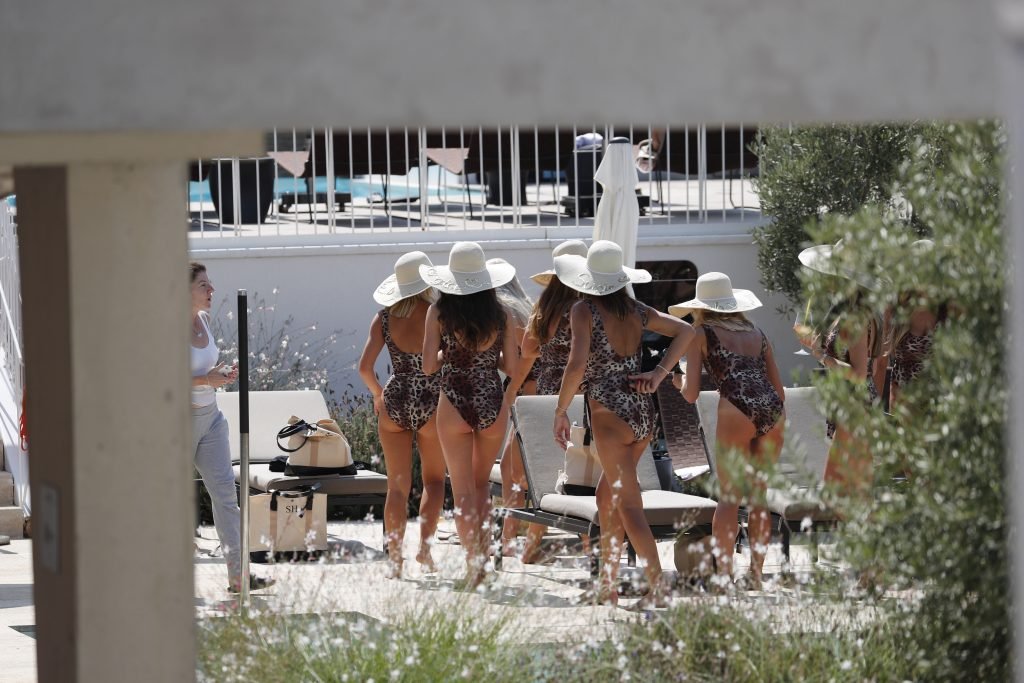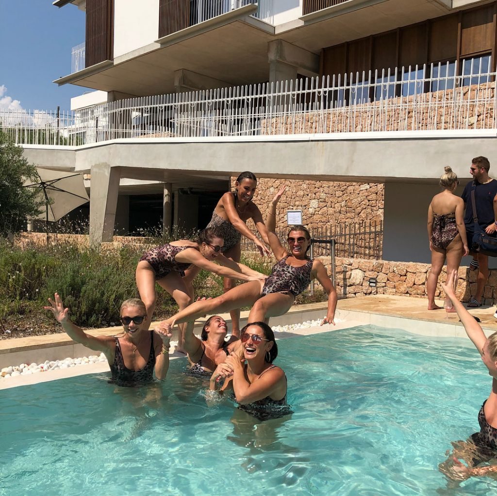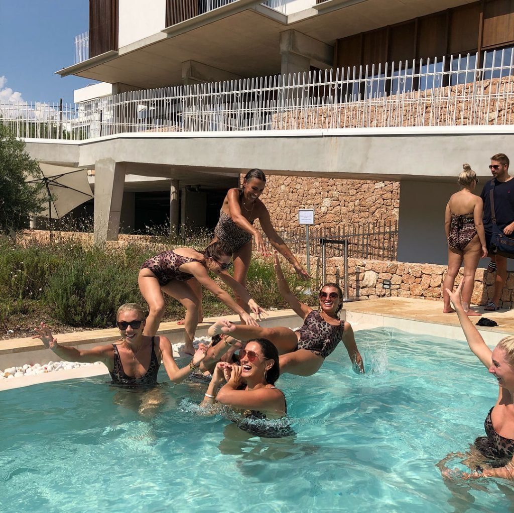 Billie Faiers est vue à Ibiza lors de son enterrement de vie de jeune fille où tous ses invités portaient des maillots une pièce imprimés léopard, 23/08/2018. Parmi les invités figuraient les stars de TOWIE Sam Faiers sa sœur et Ferne McCann.
