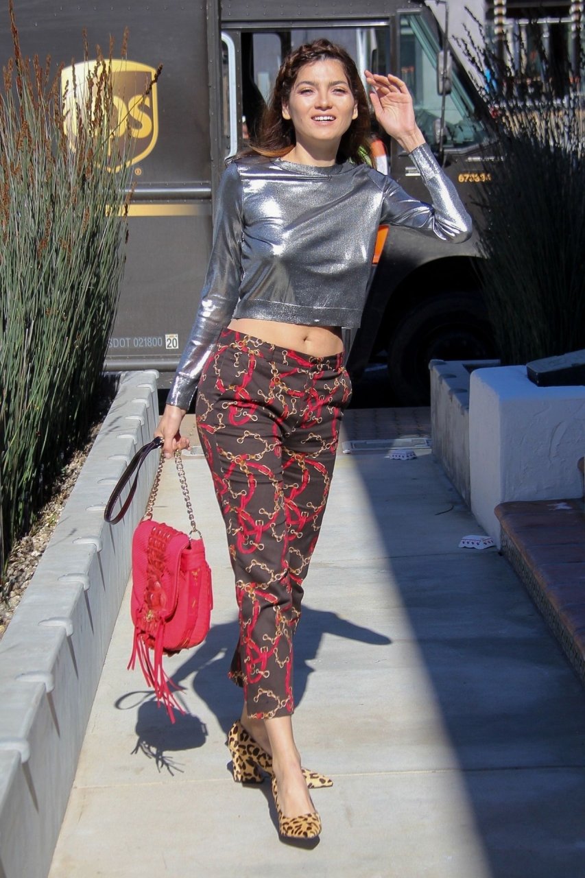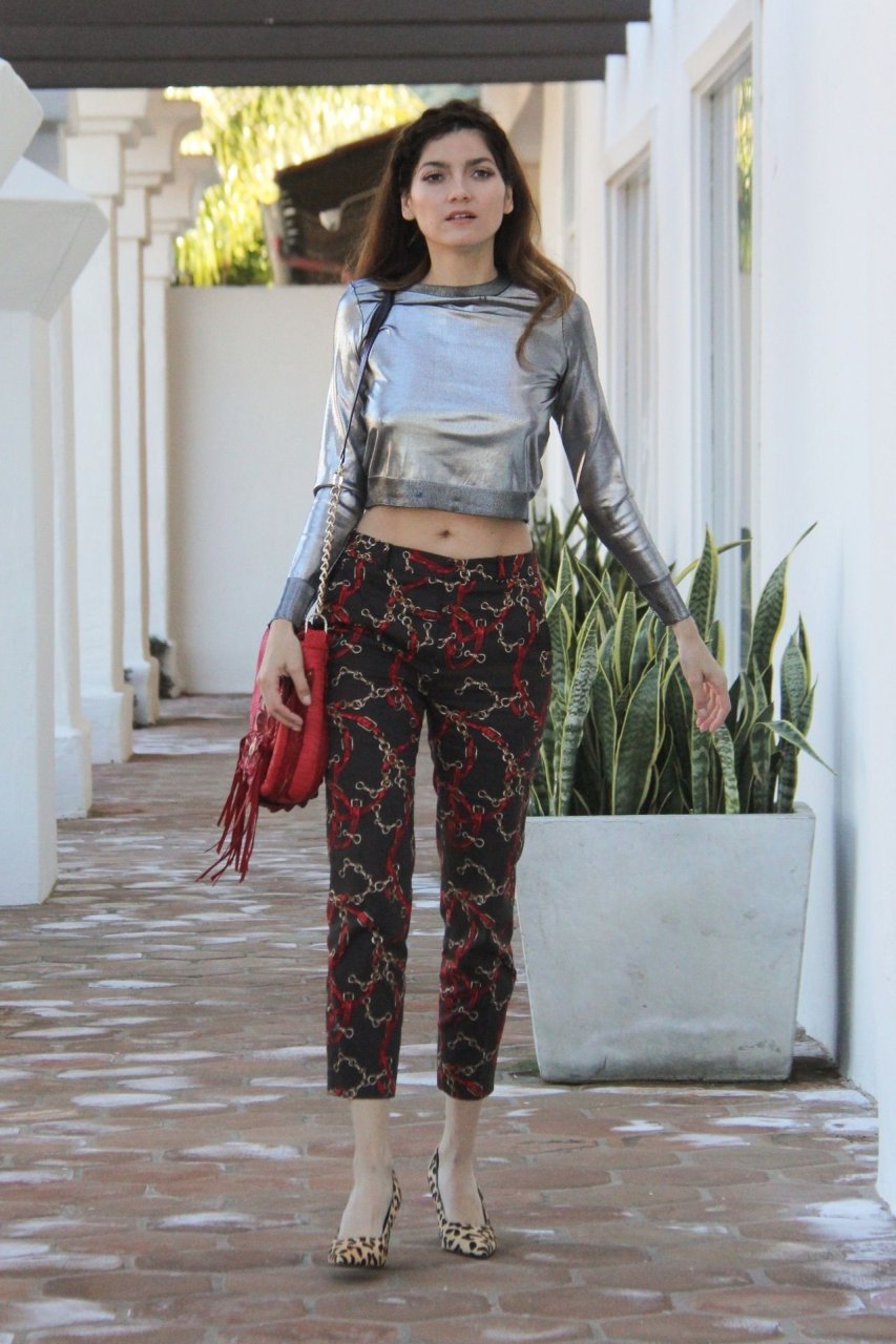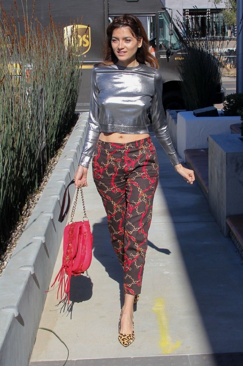 Blanca Blanco sans soutien-gorge porte un crop top argenté révélateur lors d’une expédition de lèche-vitrine à Malibu, le 23/01/2019. L’actrice déambule en talons imprimés animal, pantalon multicolore et crop top par une journée fraîche à Los Angeles.