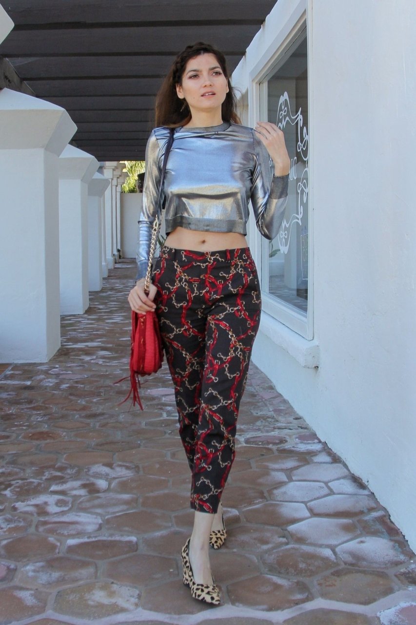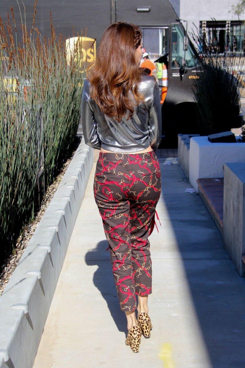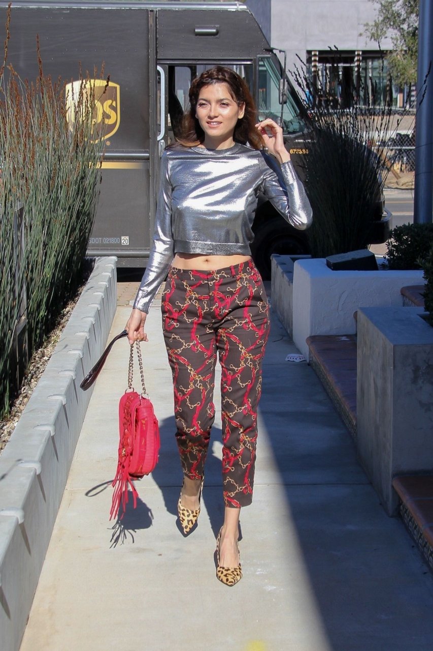 Blanca Blanco sans soutien-gorge porte un crop top argenté révélateur lors d’une expédition de lèche-vitrine à Malibu, le 23/01/2019. L’actrice déambule en talons imprimés animal, pantalon multicolore et crop top par une journée fraîche à Los Angeles.