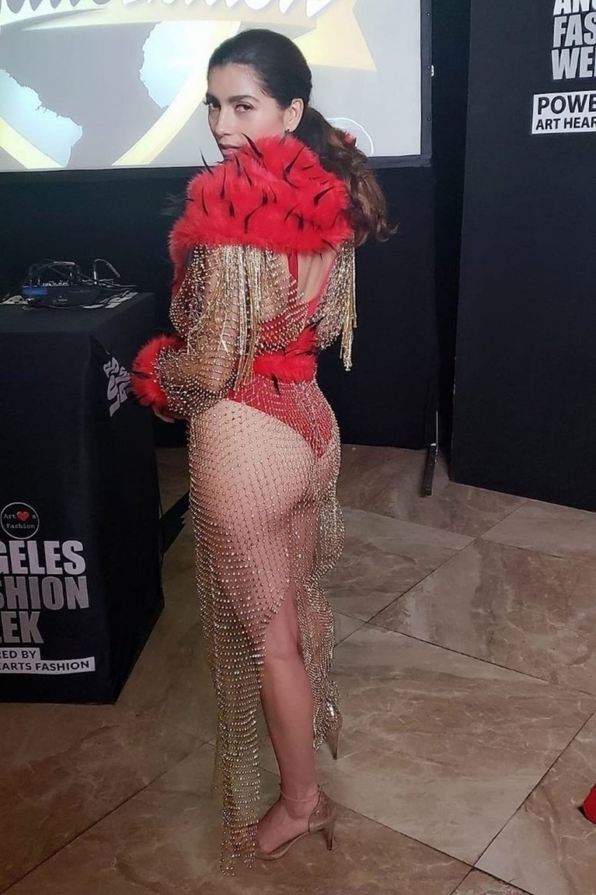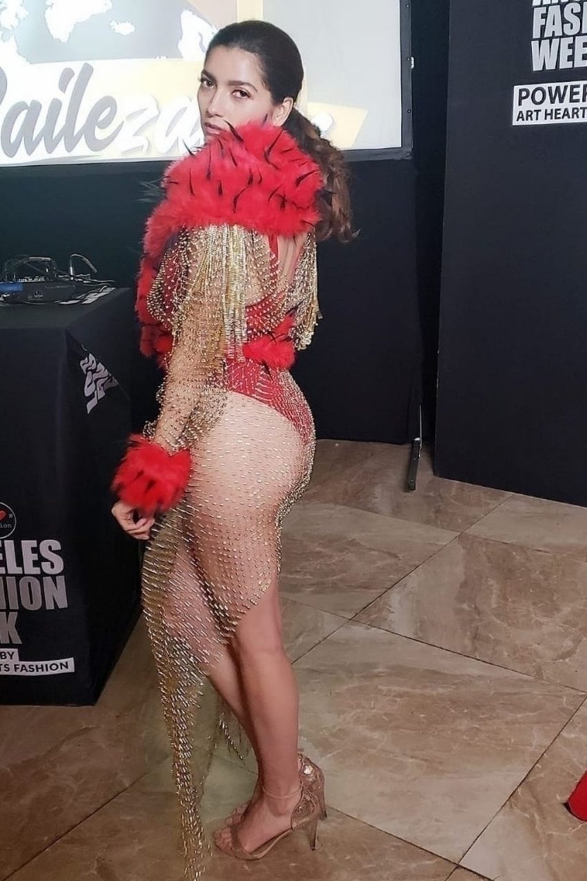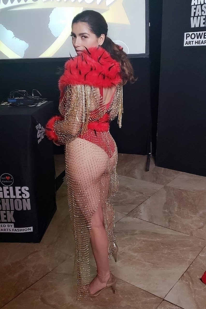 L’actrice Blanca Blanco pose en lingerie transparente lors du défilé de mode de Los Angeles, 24/03/2019.