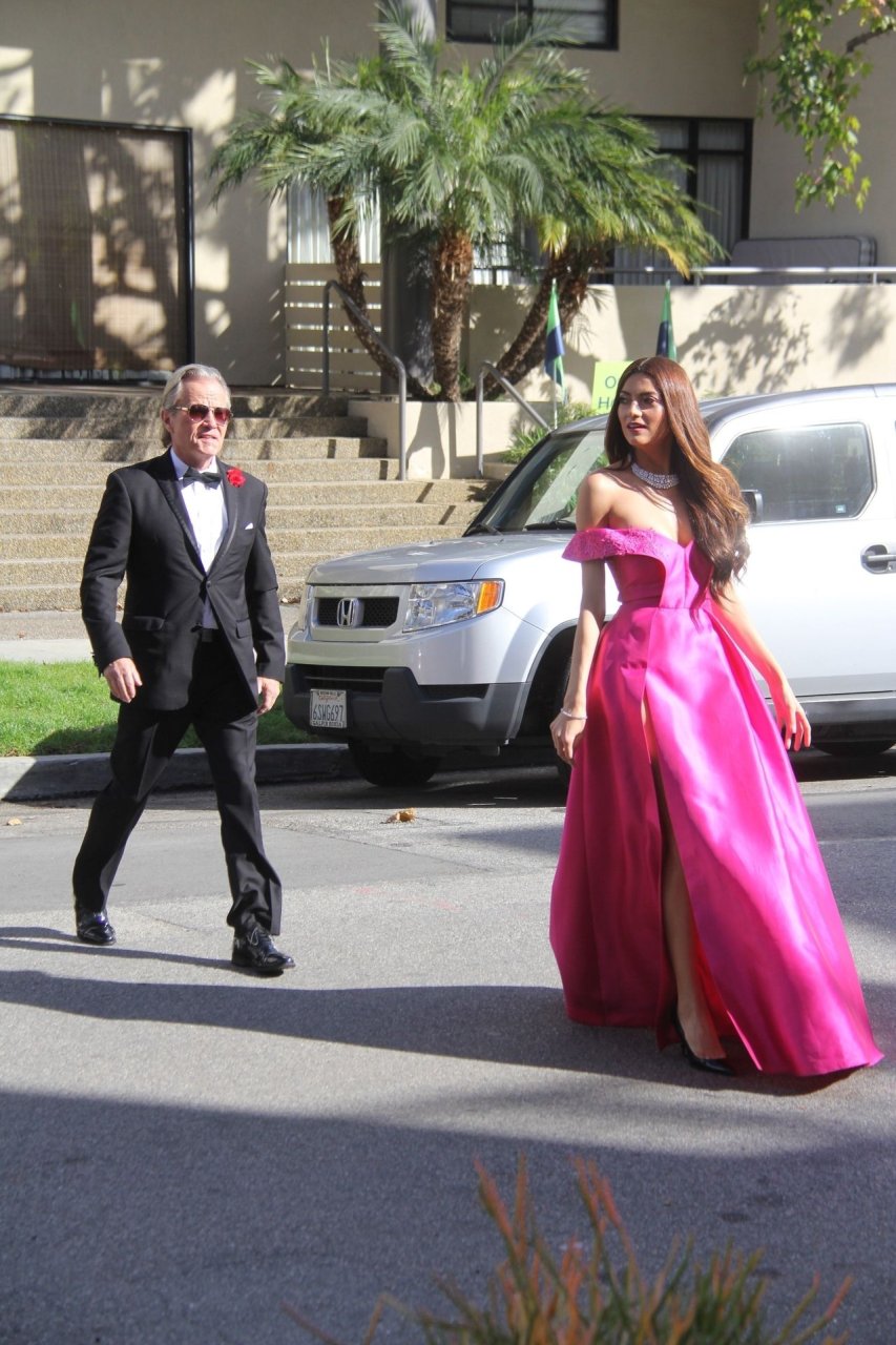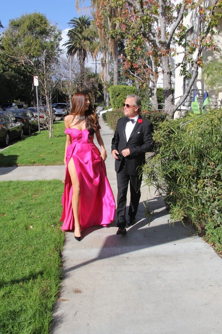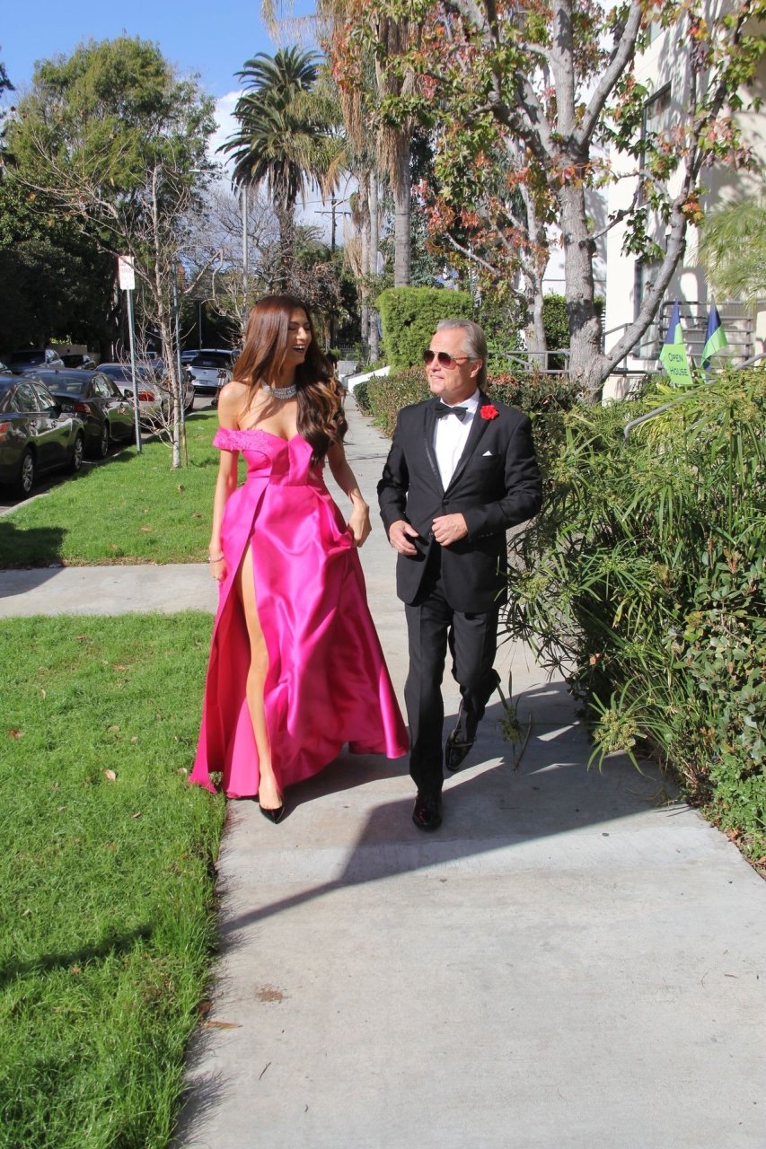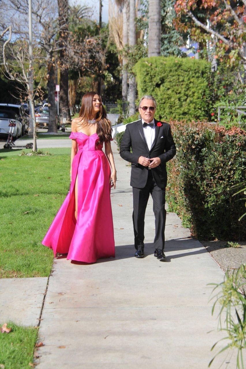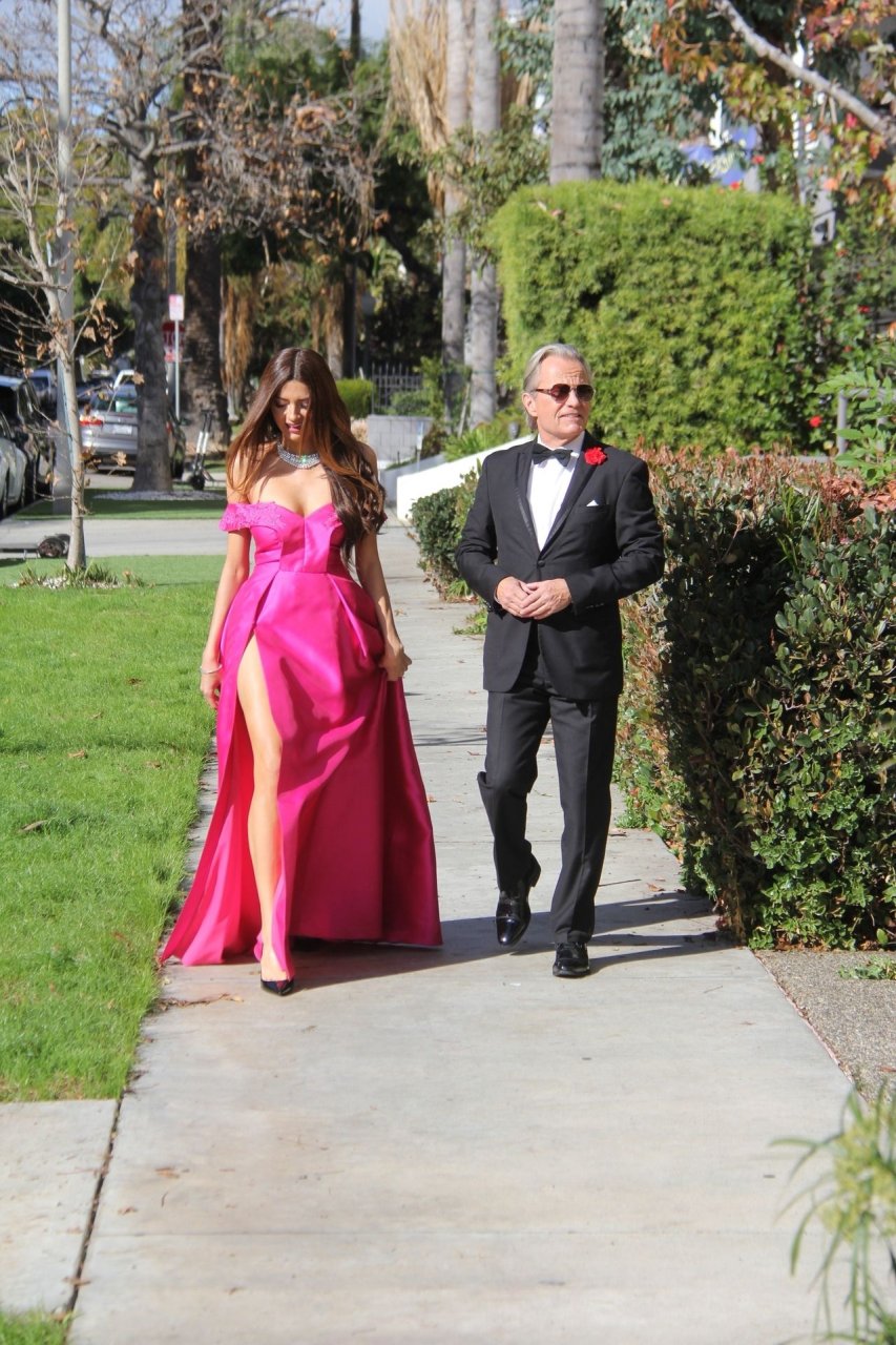 L’actrice Blanca Blanco et son partenaire John Savage présentent leur tenue des Golden Globes alors qu’ils se rendent à la cérémonie de remise des prix à West Hollywood, le 01/06/2019. Blanca défile dans une robe rose vif élégante mais sexy et John s’habille avec un costume classique noir et blanc avec un nœud papillon.
