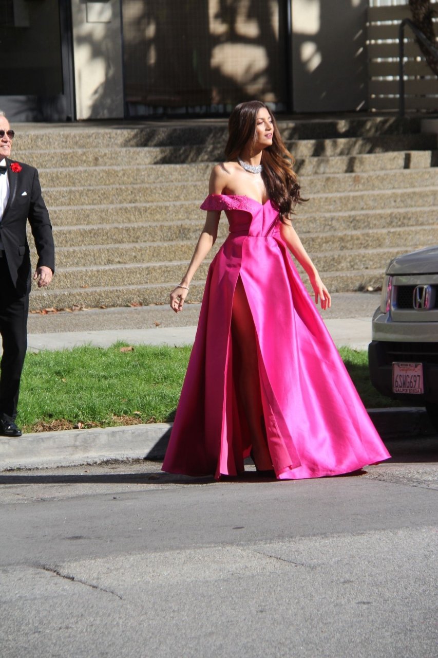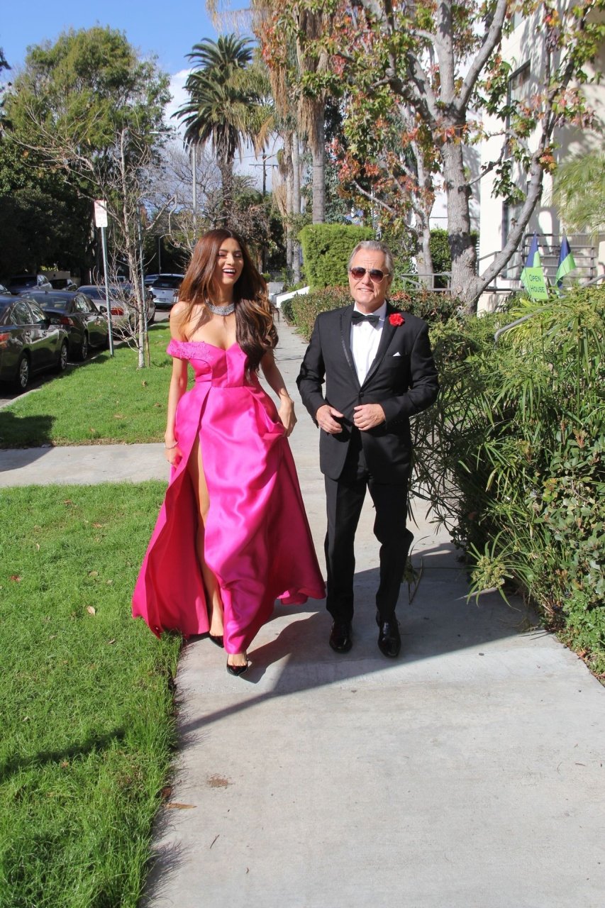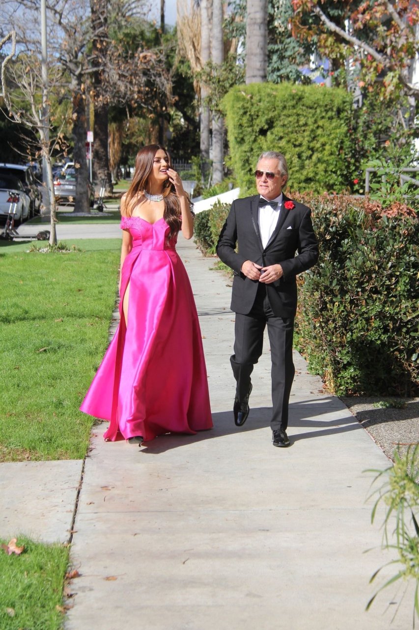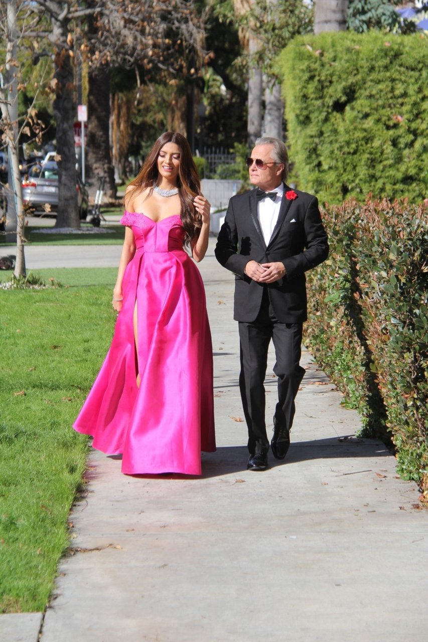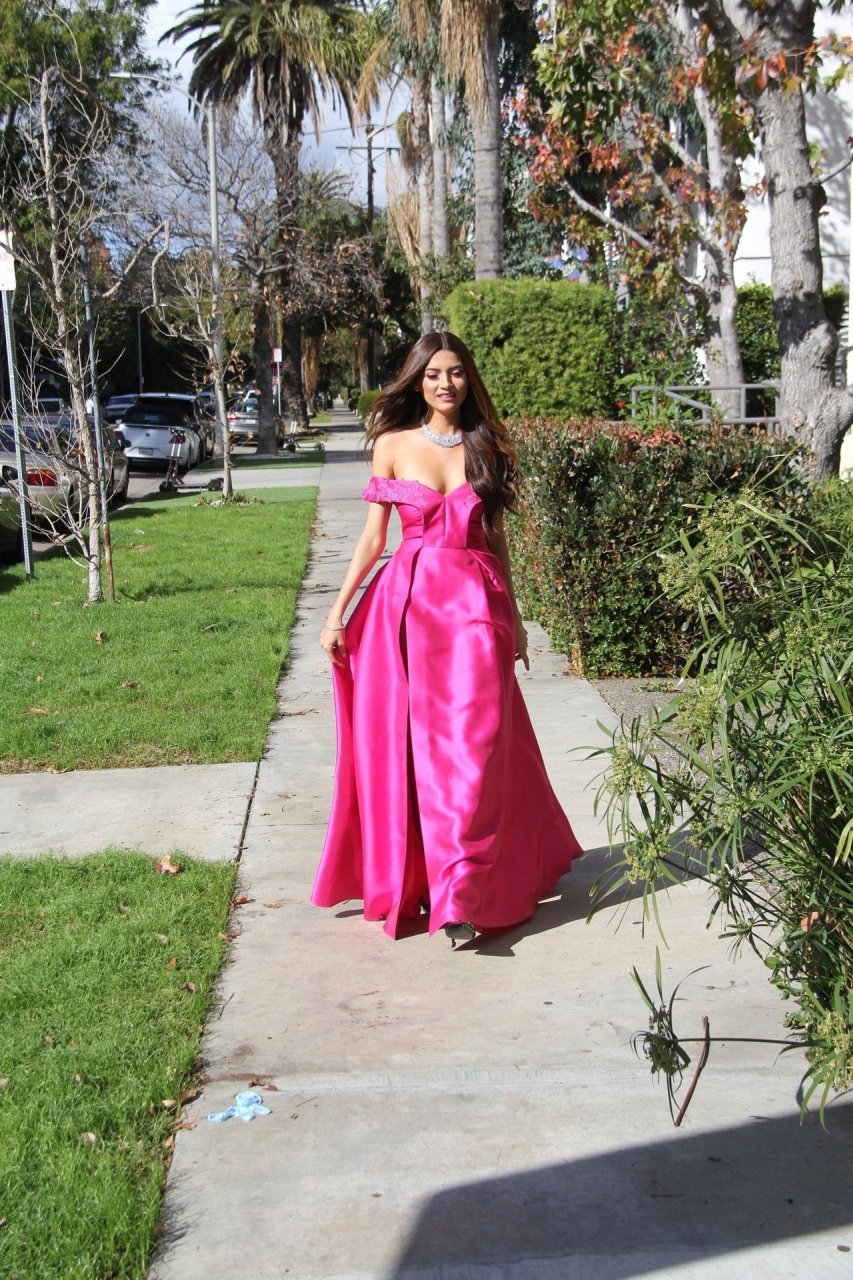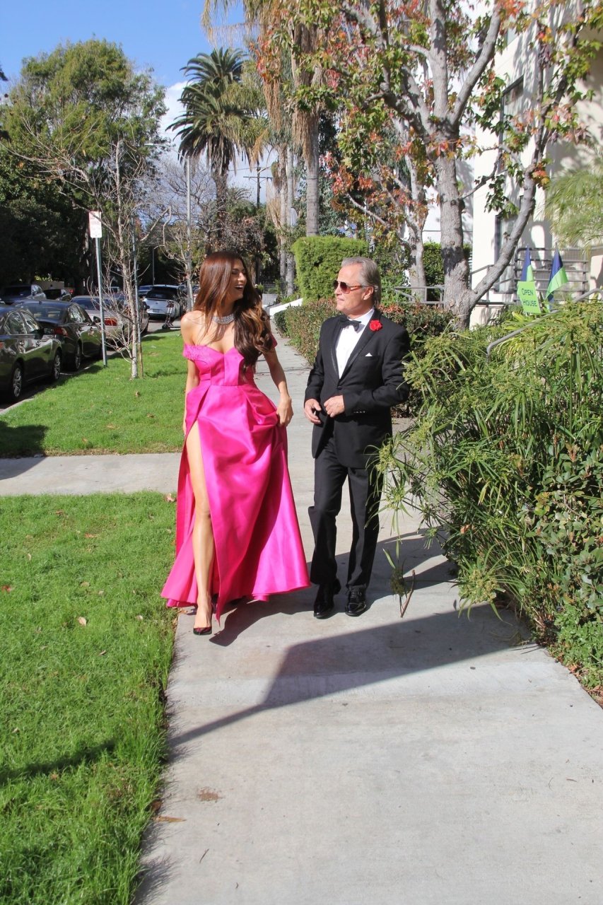 L’actrice Blanca Blanco et son partenaire John Savage présentent leur tenue des Golden Globes alors qu’ils se rendent à la cérémonie de remise des prix à West Hollywood, le 01/06/2019. Blanca défile dans une robe rose vif élégante mais sexy et John s’habille avec un costume classique noir et blanc avec un nœud papillon.