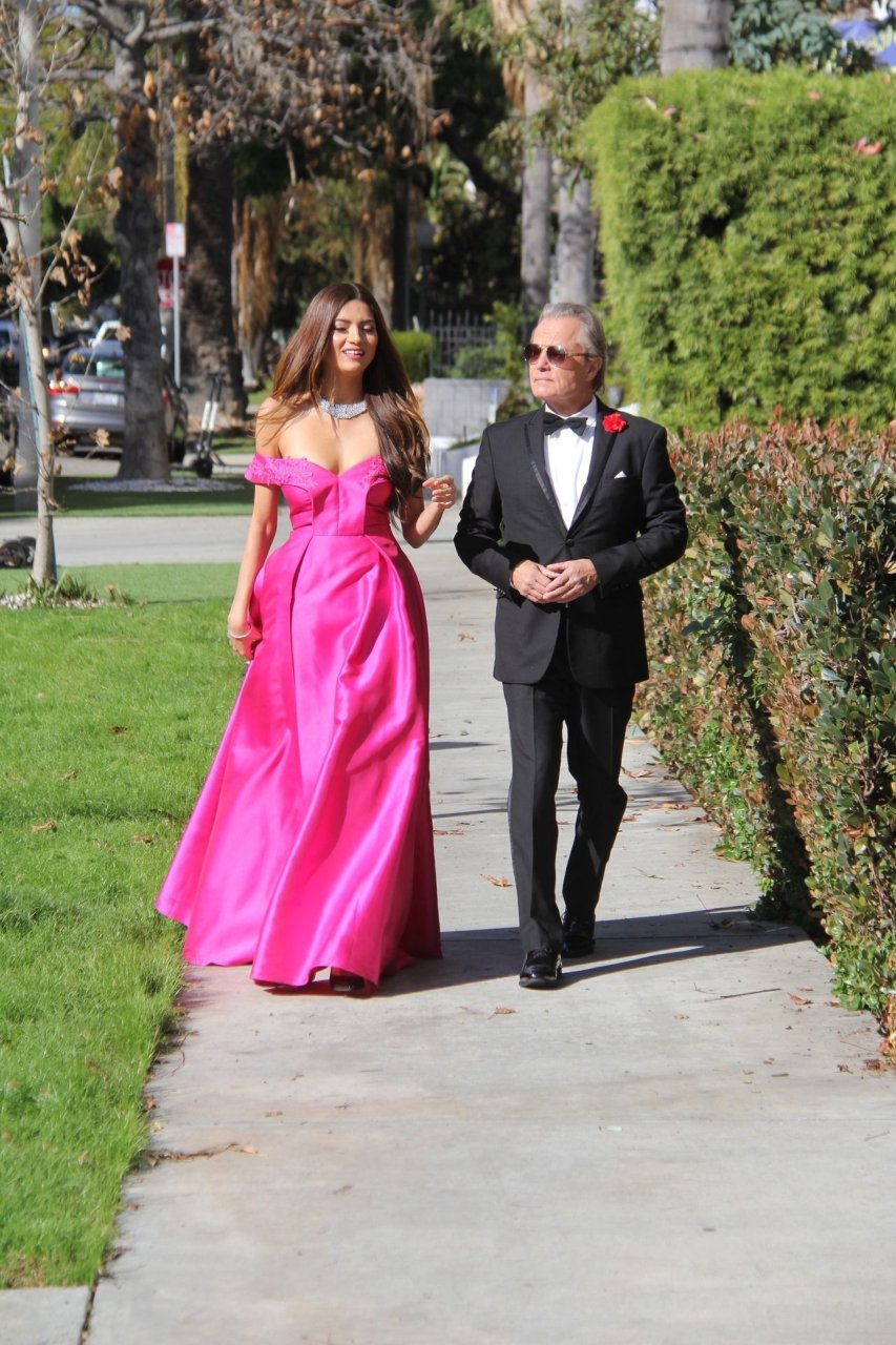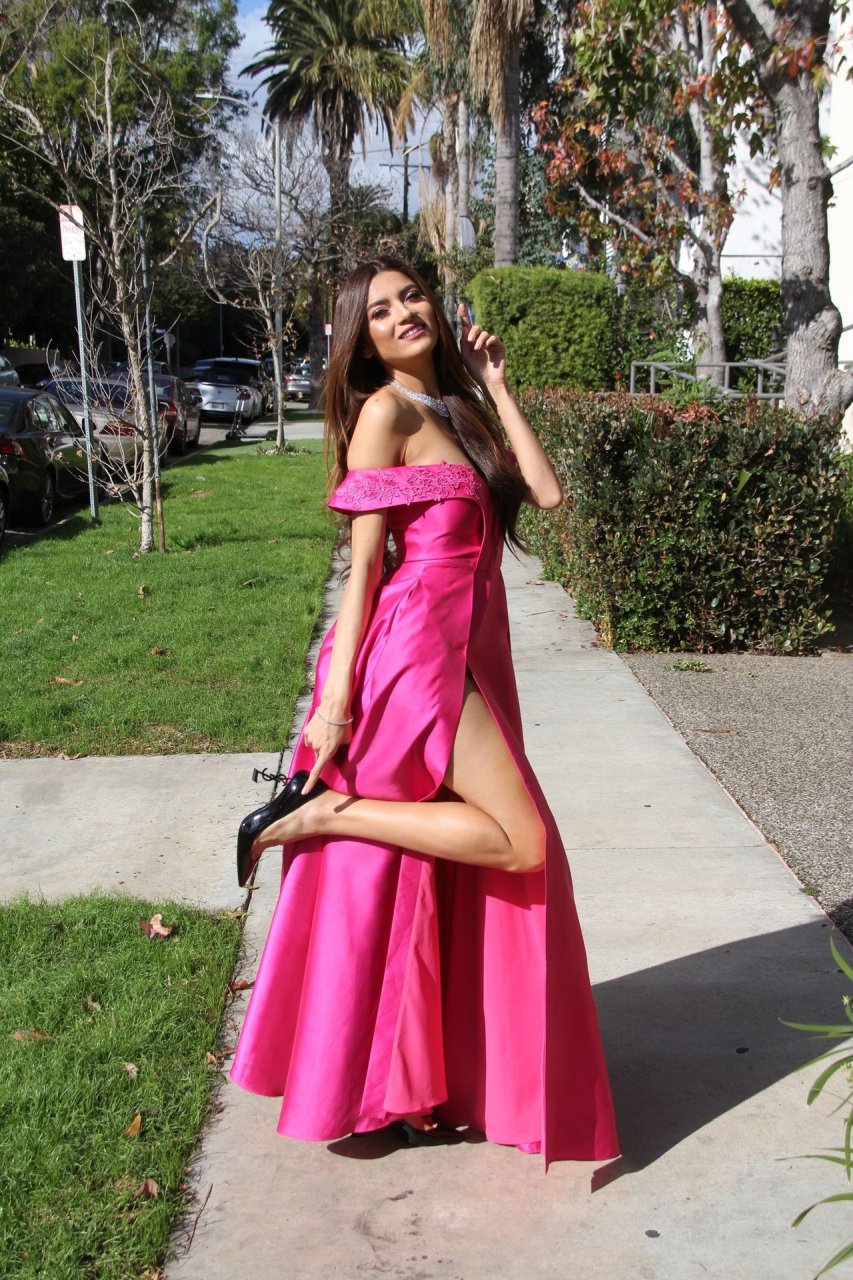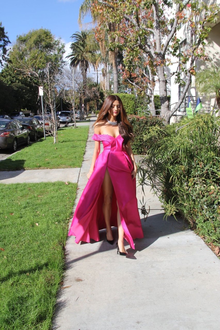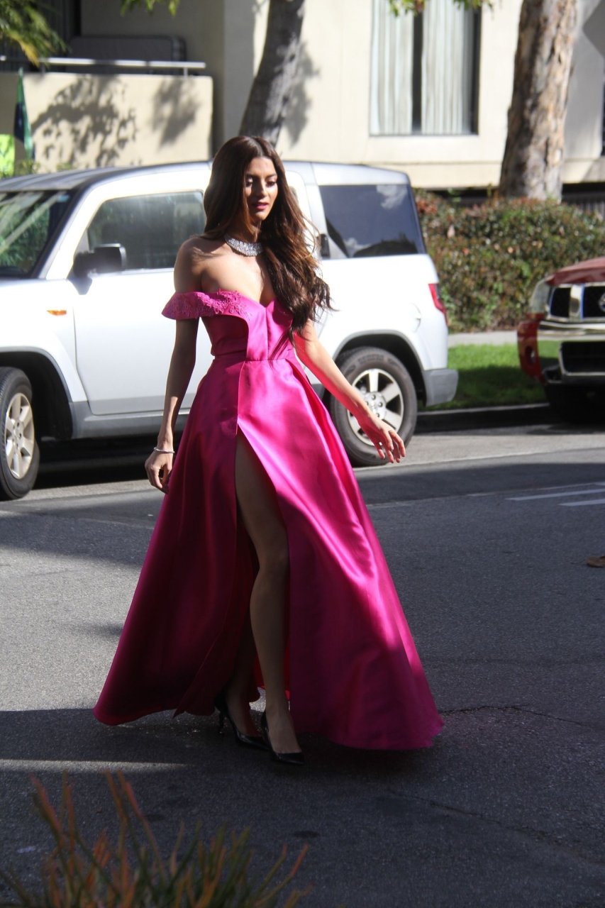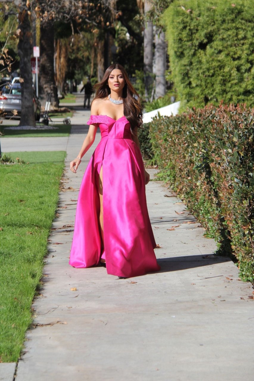 L’actrice Blanca Blanco et son partenaire John Savage présentent leur tenue des Golden Globes alors qu’ils se rendent à la cérémonie de remise des prix à West Hollywood, le 01/06/2019. Blanca défile dans une robe rose vif élégante mais sexy et John s’habille avec un costume classique noir et blanc avec un nœud papillon.