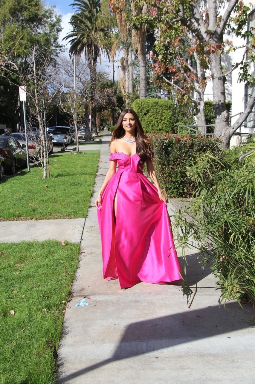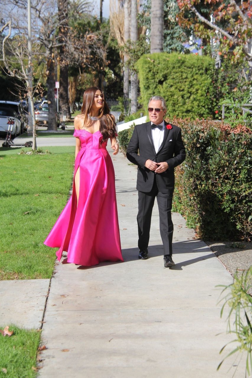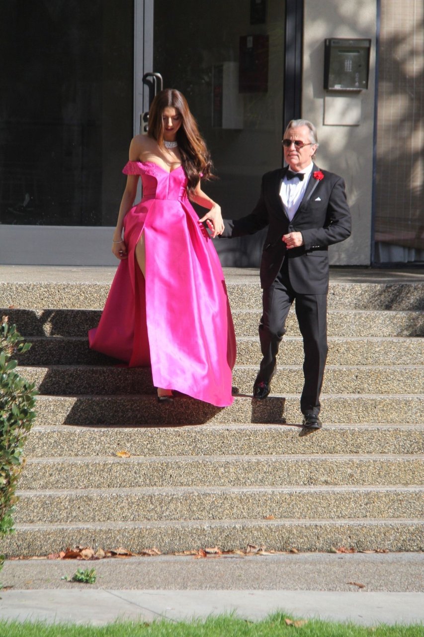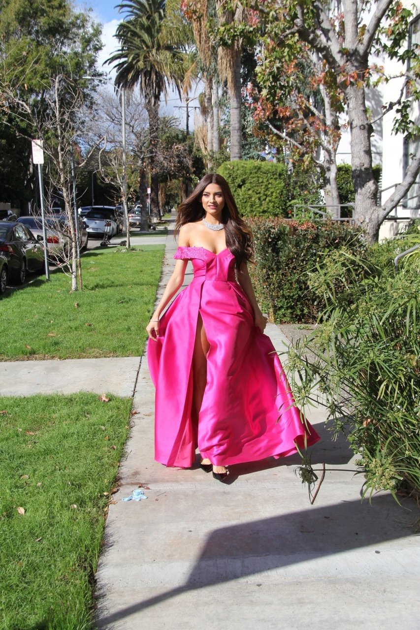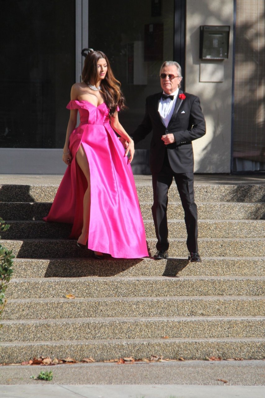 L’actrice Blanca Blanco et son partenaire John Savage présentent leur tenue des Golden Globes alors qu’ils se rendent à la cérémonie de remise des prix à West Hollywood, le 01/06/2019. Blanca défile dans une robe rose vif élégante mais sexy et John s’habille avec un costume classique noir et blanc avec un nœud papillon.