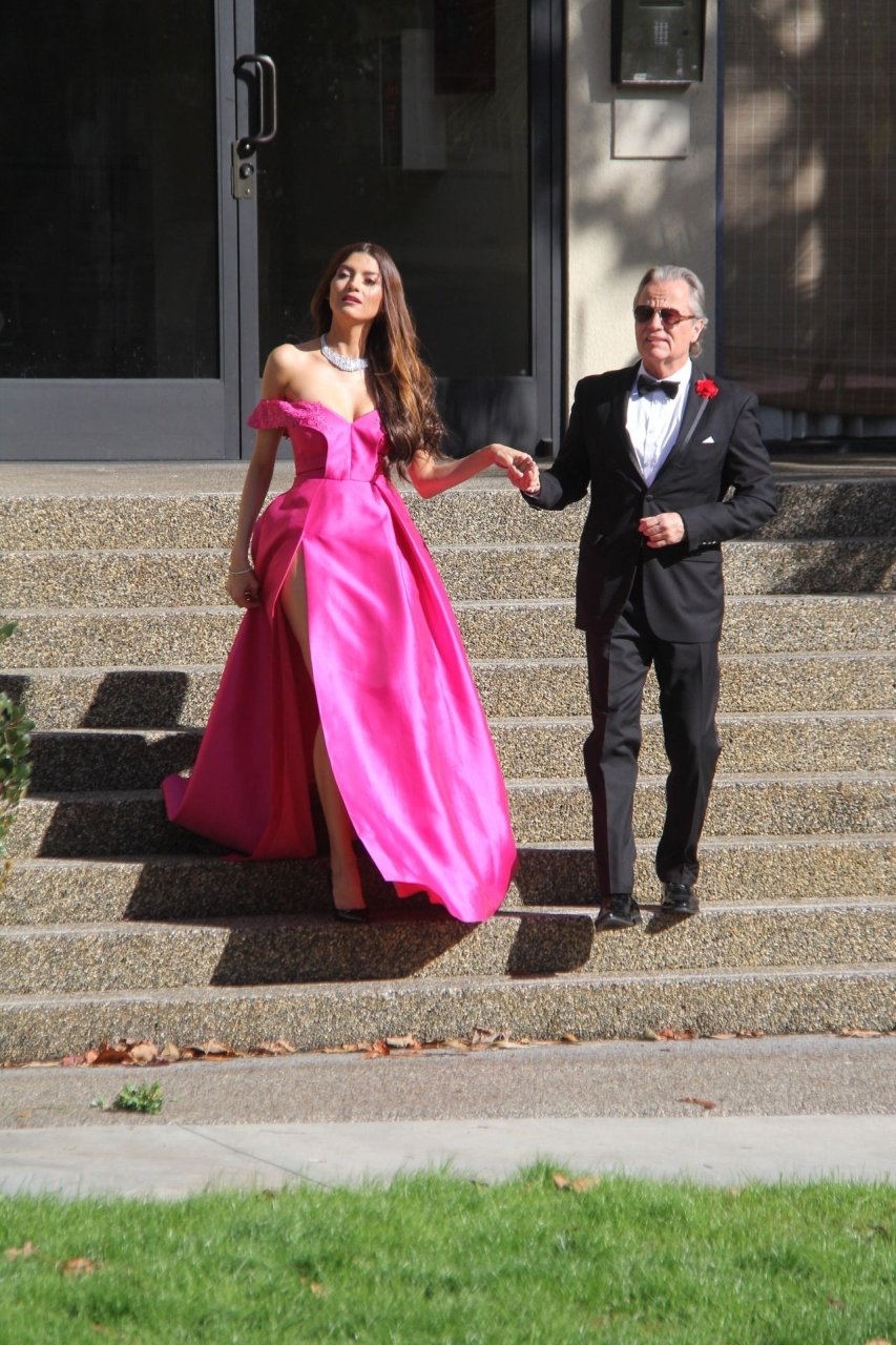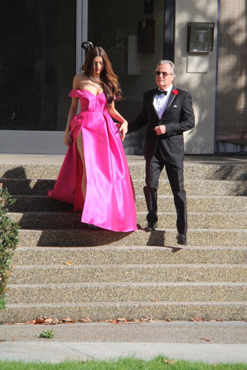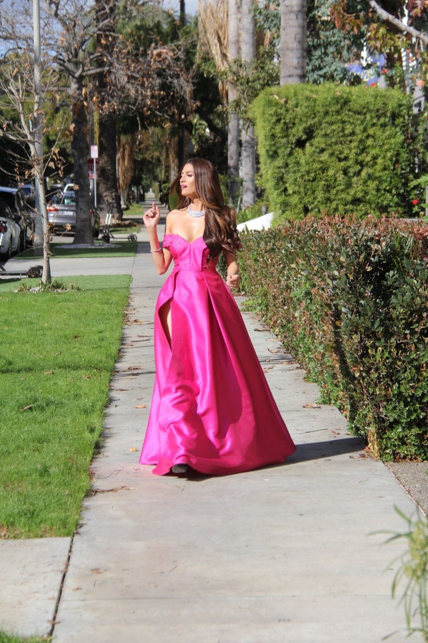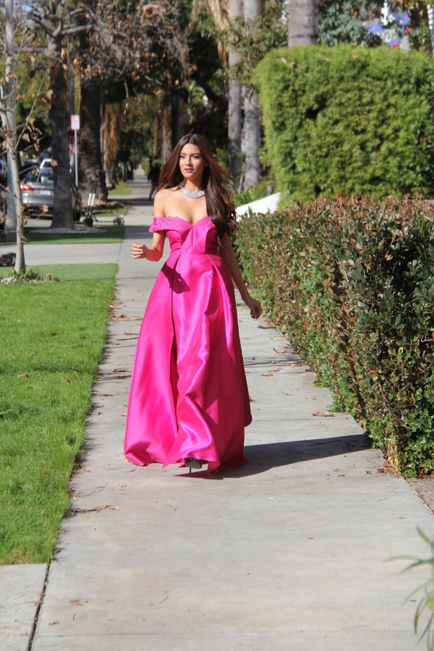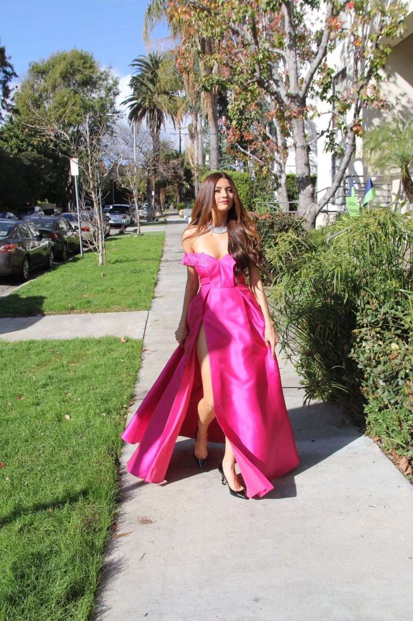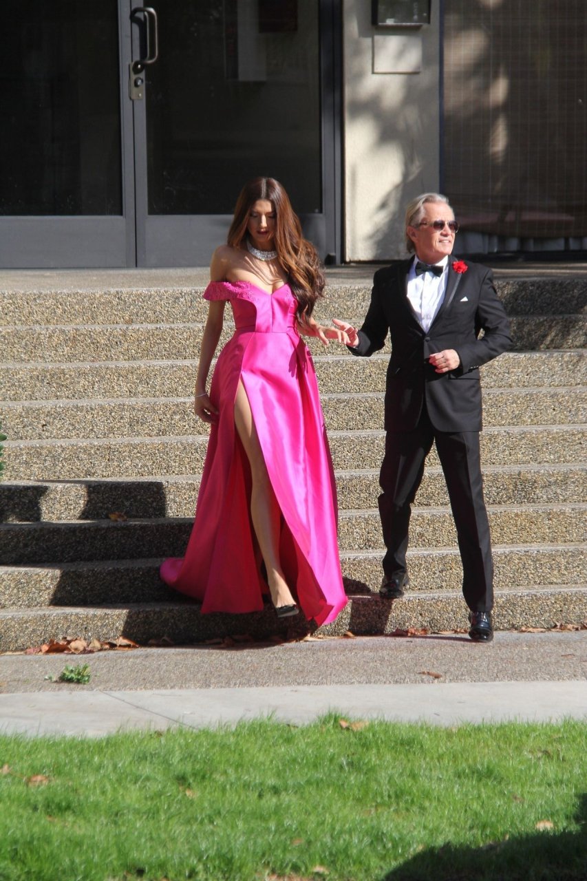 L’actrice Blanca Blanco et son partenaire John Savage présentent leur tenue des Golden Globes alors qu’ils se rendent à la cérémonie de remise des prix à West Hollywood, le 01/06/2019. Blanca défile dans une robe rose vif élégante mais sexy et John s’habille avec un costume classique noir et blanc avec un nœud papillon.