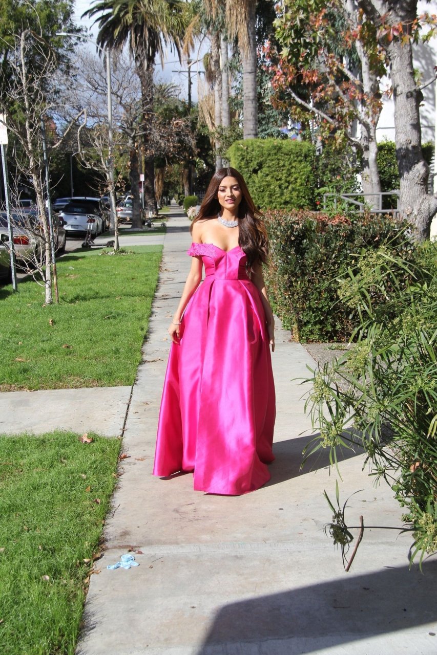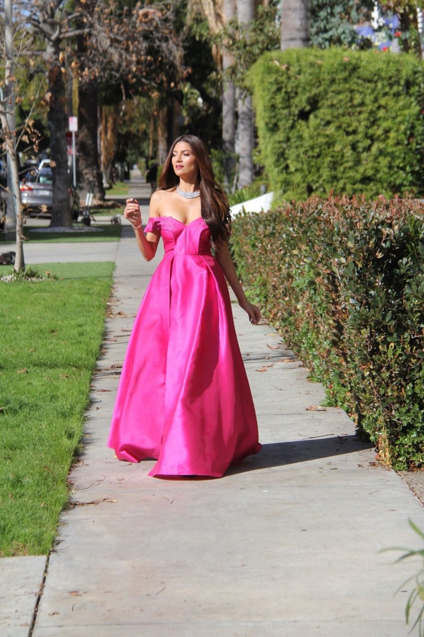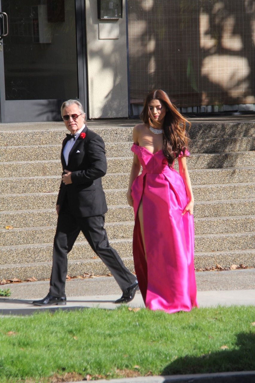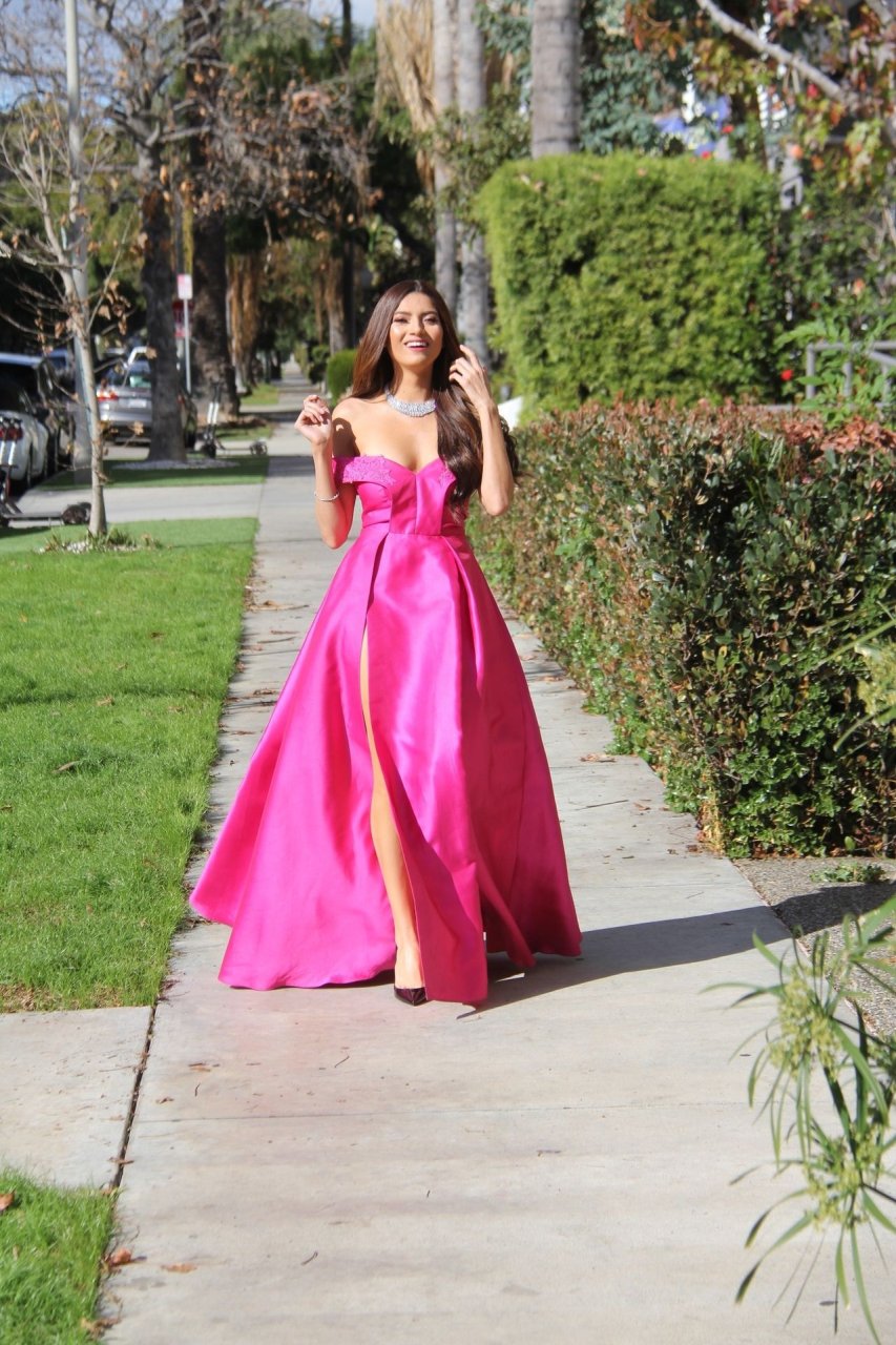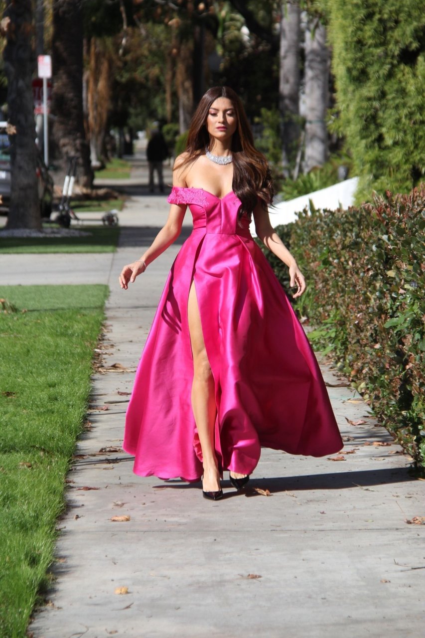 L’actrice Blanca Blanco et son partenaire John Savage présentent leur tenue des Golden Globes alors qu’ils se rendent à la cérémonie de remise des prix à West Hollywood, le 01/06/2019. Blanca défile dans une robe rose vif élégante mais sexy et John s’habille avec un costume classique noir et blanc avec un nœud papillon.