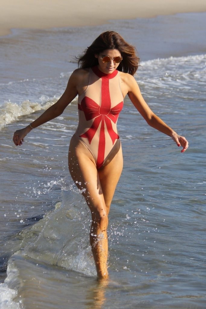 L’actrice Blanca Blanco (36 ans) se met dans l’esprit des fêtes à la plage de Malibu en portant un maillot de bain transparent avec un nœud de Noël, 23/12/2017.