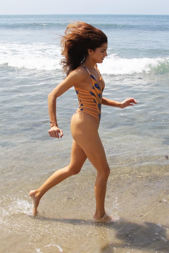 Actrice Blanca Blanco se rafraîchit dans l’océan tout en profitant d’une journée à la plage lors d’une chaude journée d’été à Malibu, le 11/07/2018. Blanca (37 ans) portait un maillot de bain une pièce révélateur lors de cette sortie en solo à la plage.