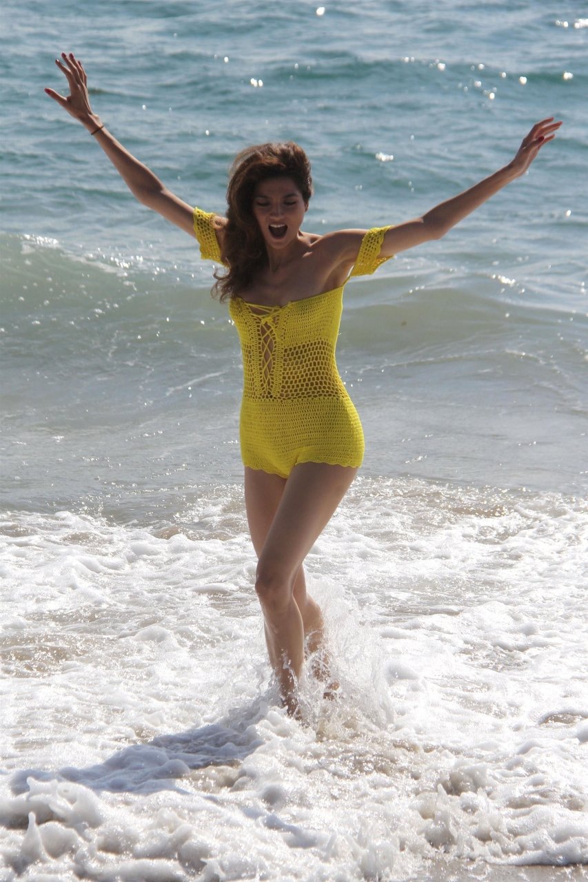L’actrice Blanca Blanco se rend à la plage en maillot de bain en maille jaune à Malibu, le 29/08/2018. Blanca a posé pour des photos et a fait semblant de soulever de lourds rochers après avoir trempé ses orteils dans l’océan.