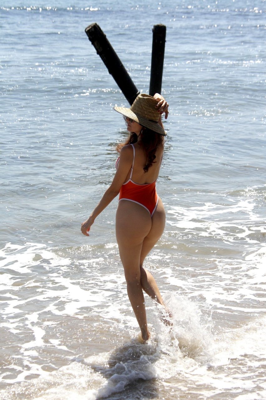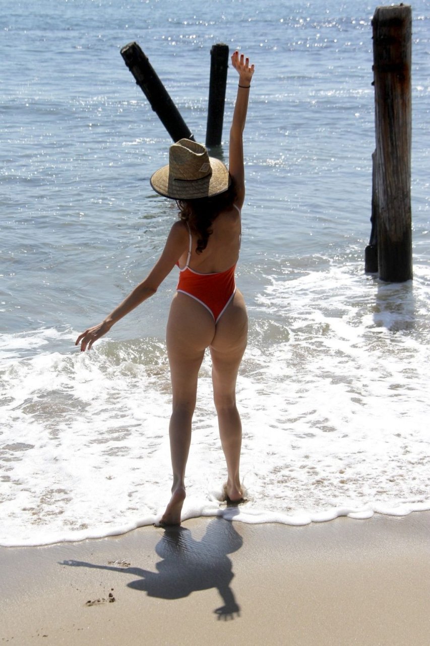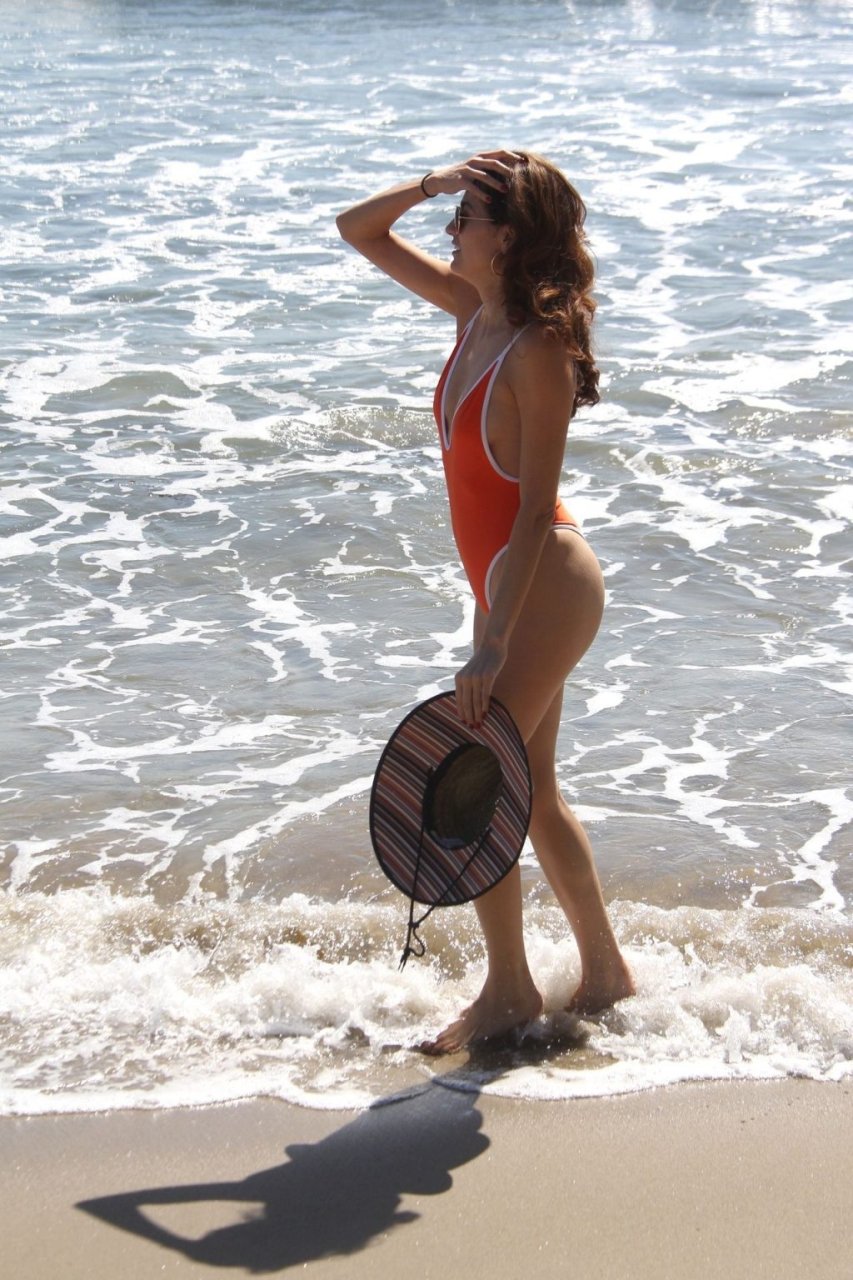 Actrice Blanca Blanco est une Orange Crush portant un sexy maillot de bain une pièce orange tout en faisant une longue promenade sur la plage à Malibu, 10/10/2019.