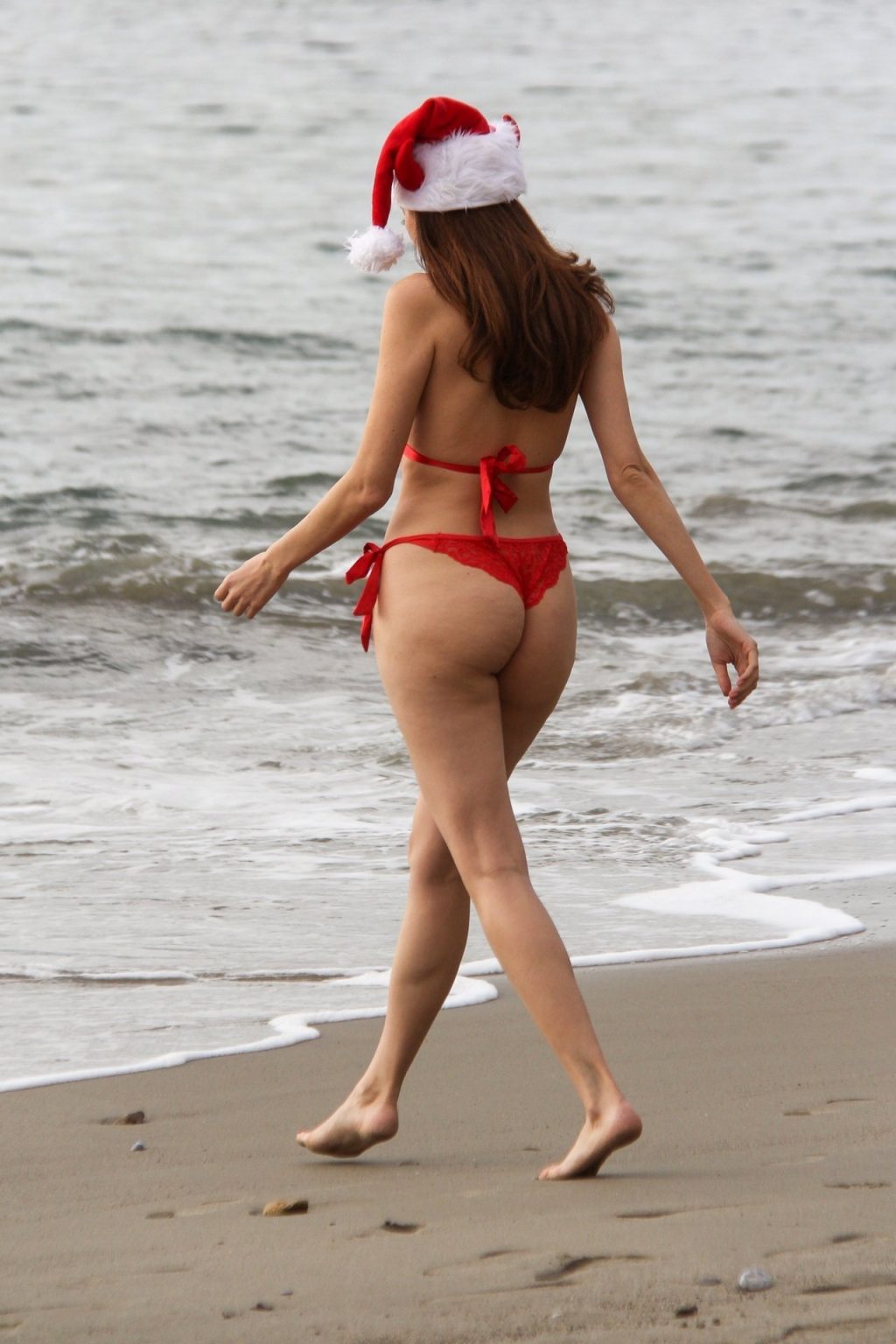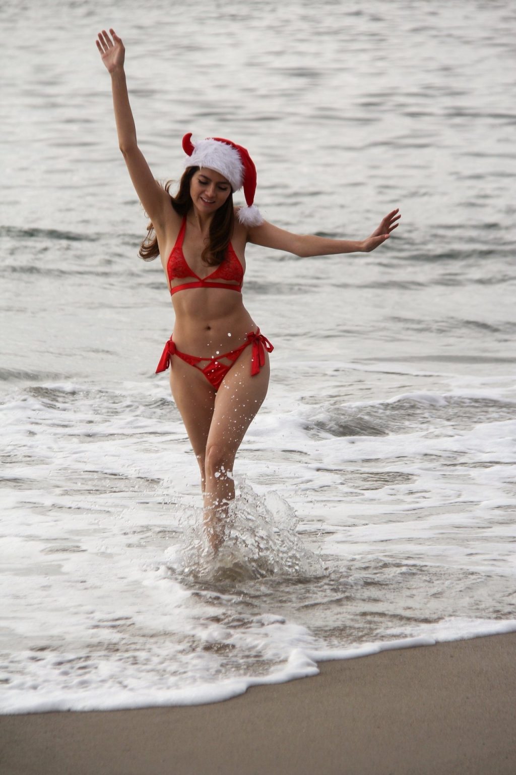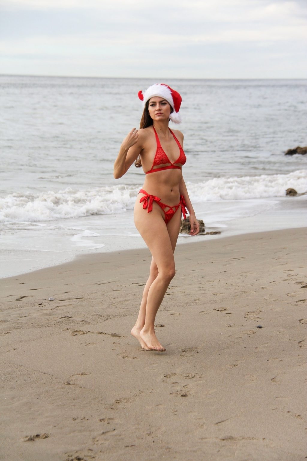 L’actrice Blanca Blanco pose pour une séance photo sur la plage d’État de Matador à Malibu, le 18/12/2019. La star enfile un bikini rouge sexy et se met dans l’esprit des fêtes avec un chapeau de Père Noël rouge.