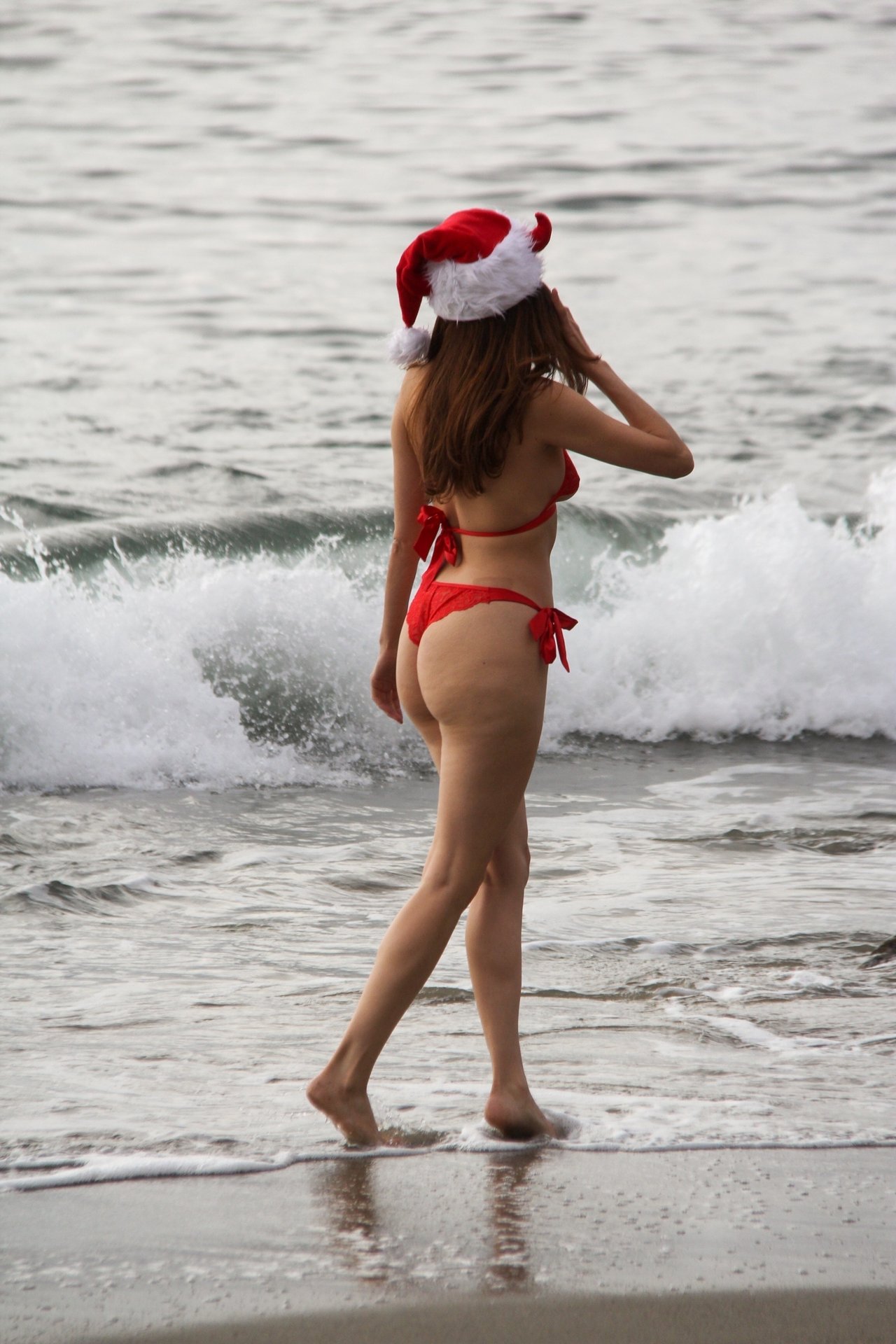 L’actrice Blanca Blanco pose pour une séance photo sur la plage d’État de Matador à Malibu, le 18/12/2019. La star enfile un bikini rouge sexy et se met dans l’esprit des fêtes avec un chapeau de Père Noël rouge.