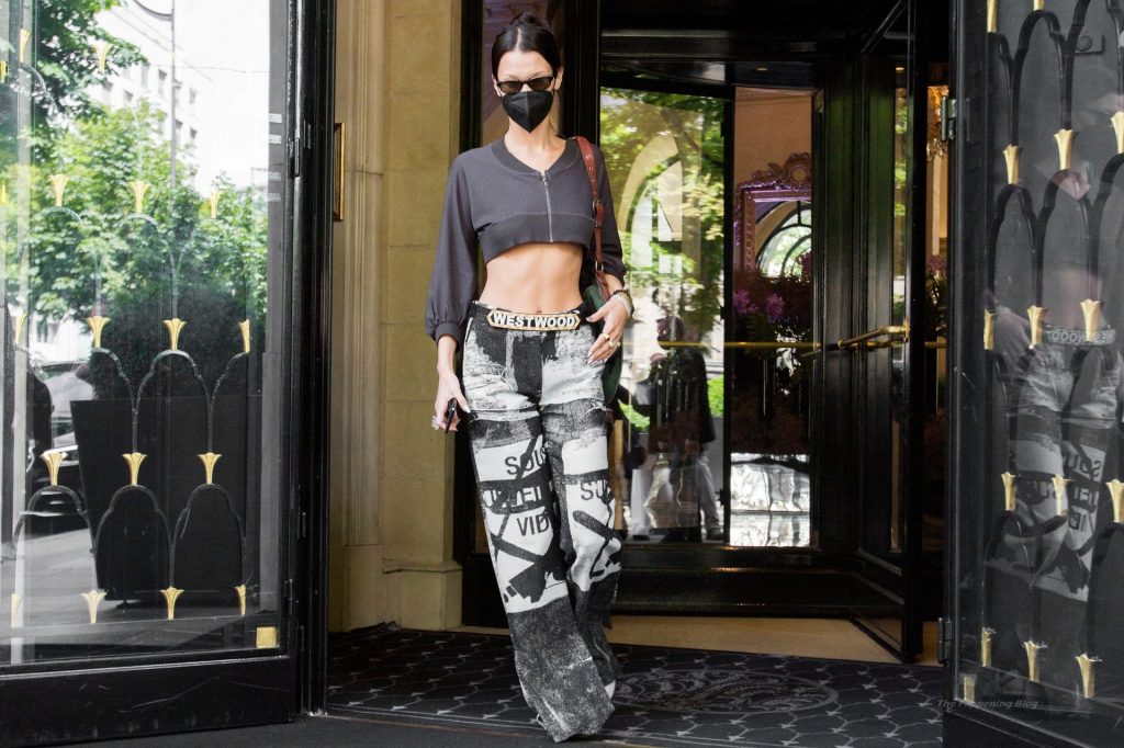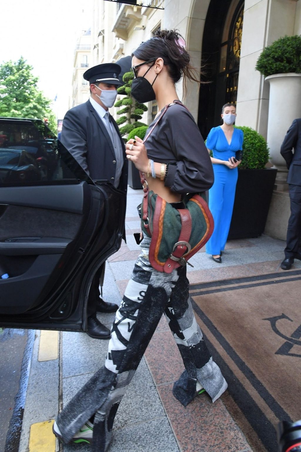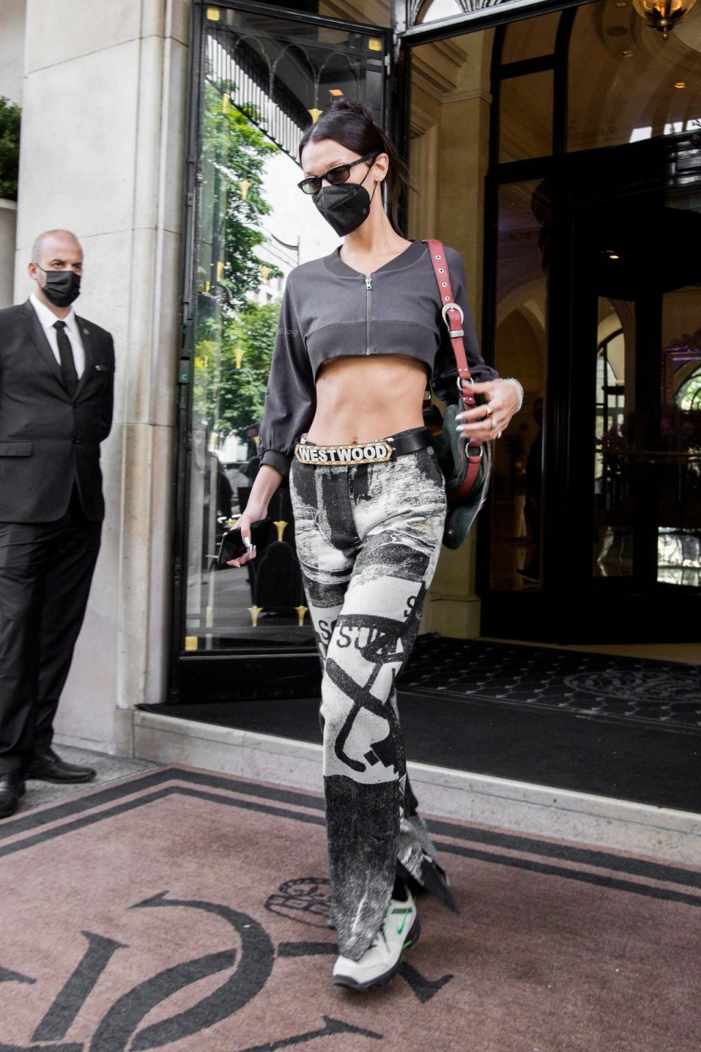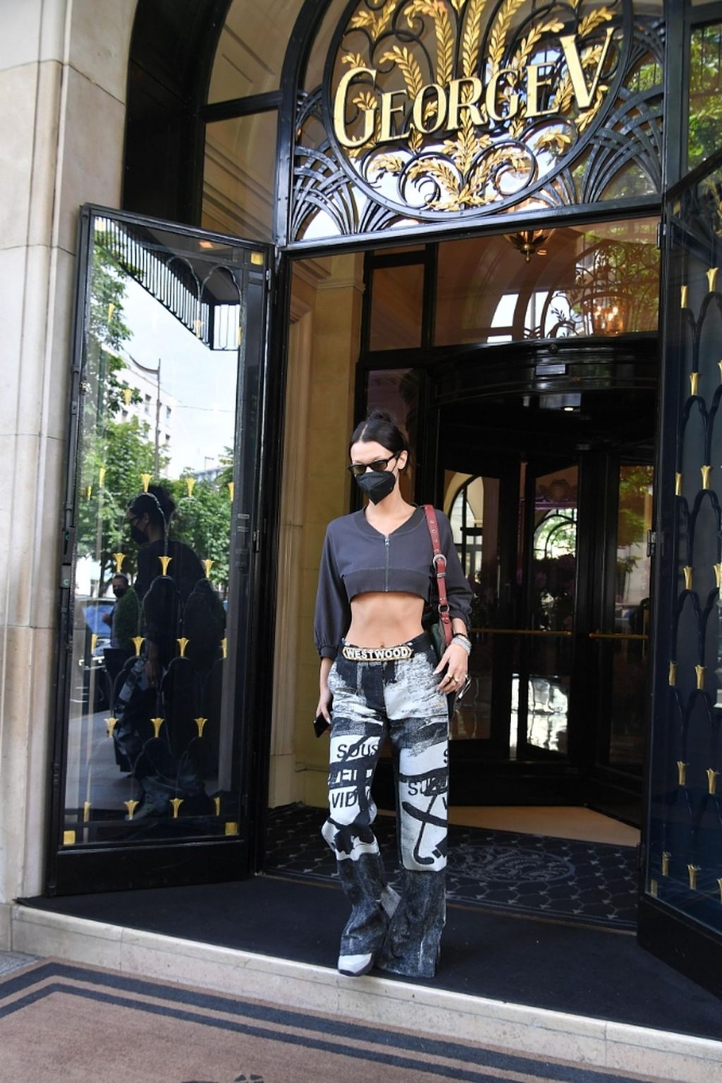 Bella Hadid est vue quittant son hôtel pour le défilé de mode Off White. Elle a passé un test antigénique avant le défilé le 4 juillet 2021 à Paris, France.