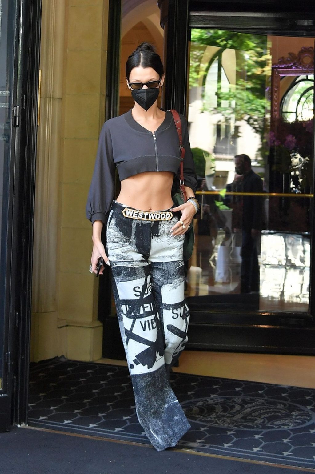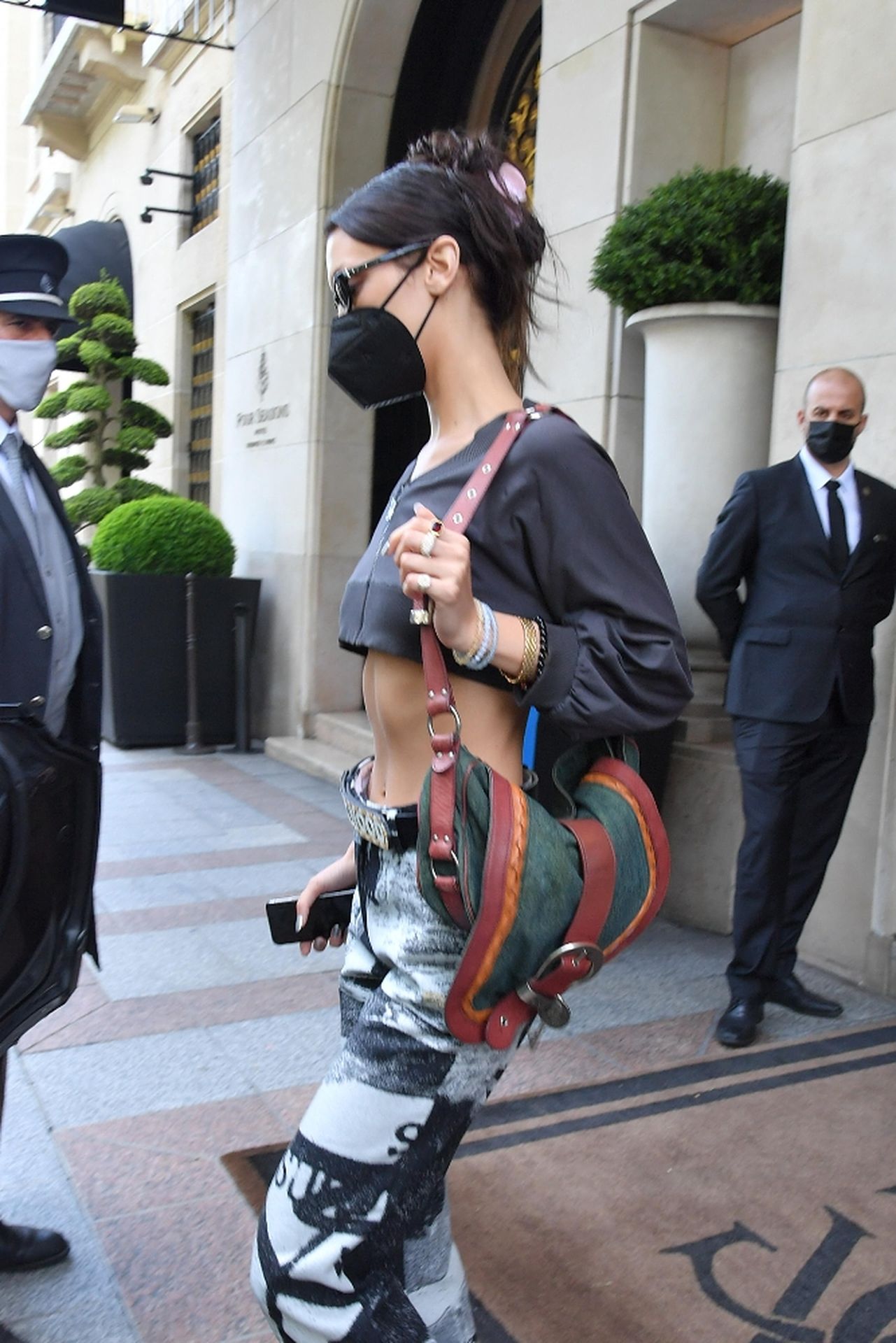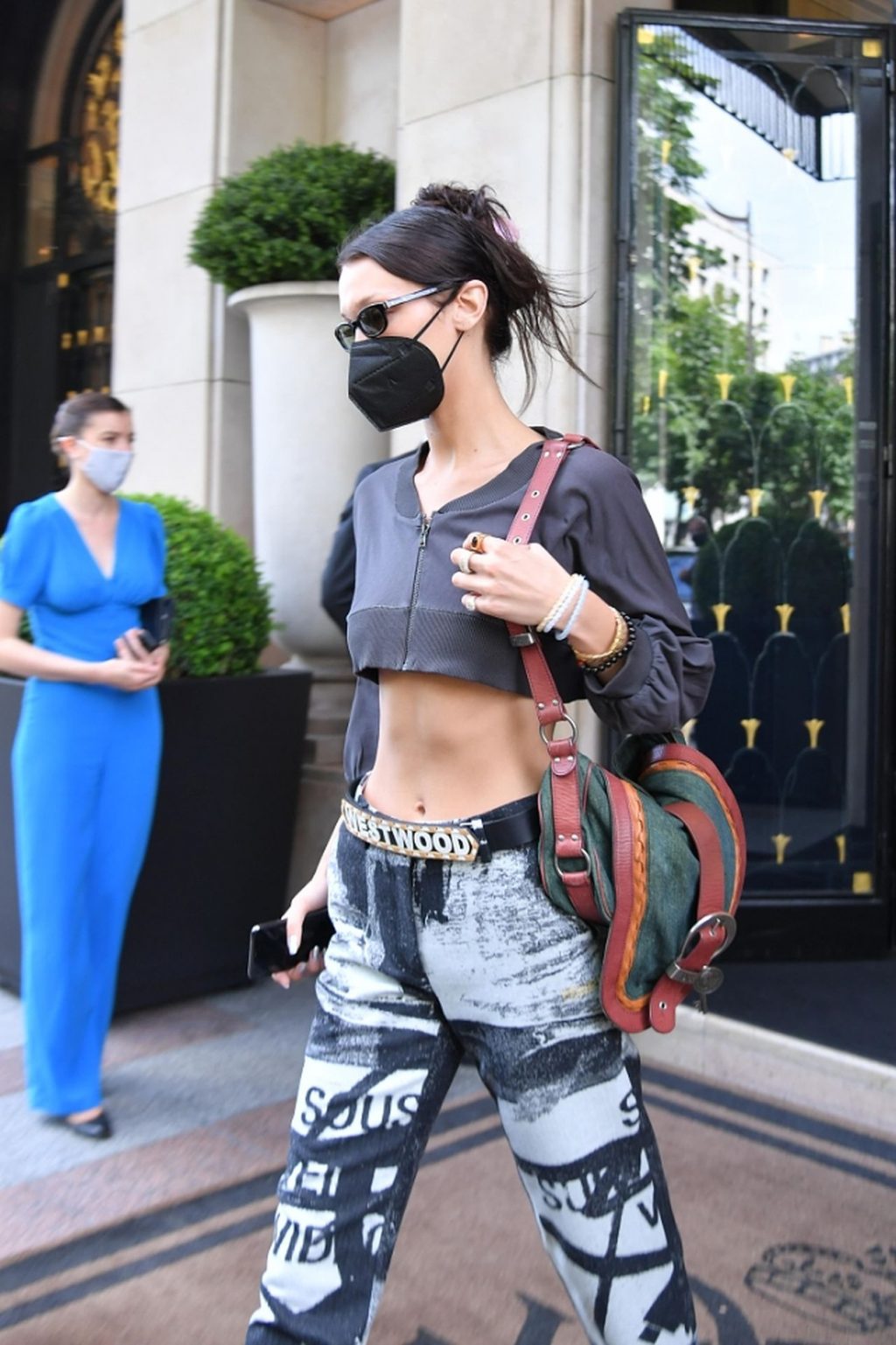 Bella Hadid est vue quittant son hôtel pour le défilé de mode Off White. Elle a passé un test antigénique avant le défilé le 4 juillet 2021 à Paris, France.
