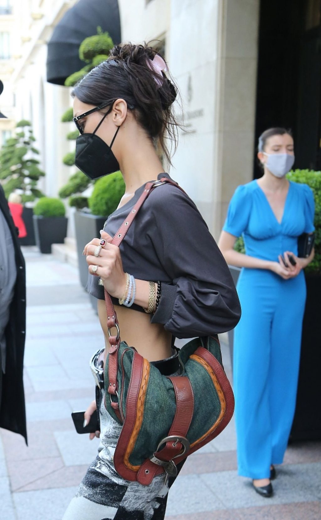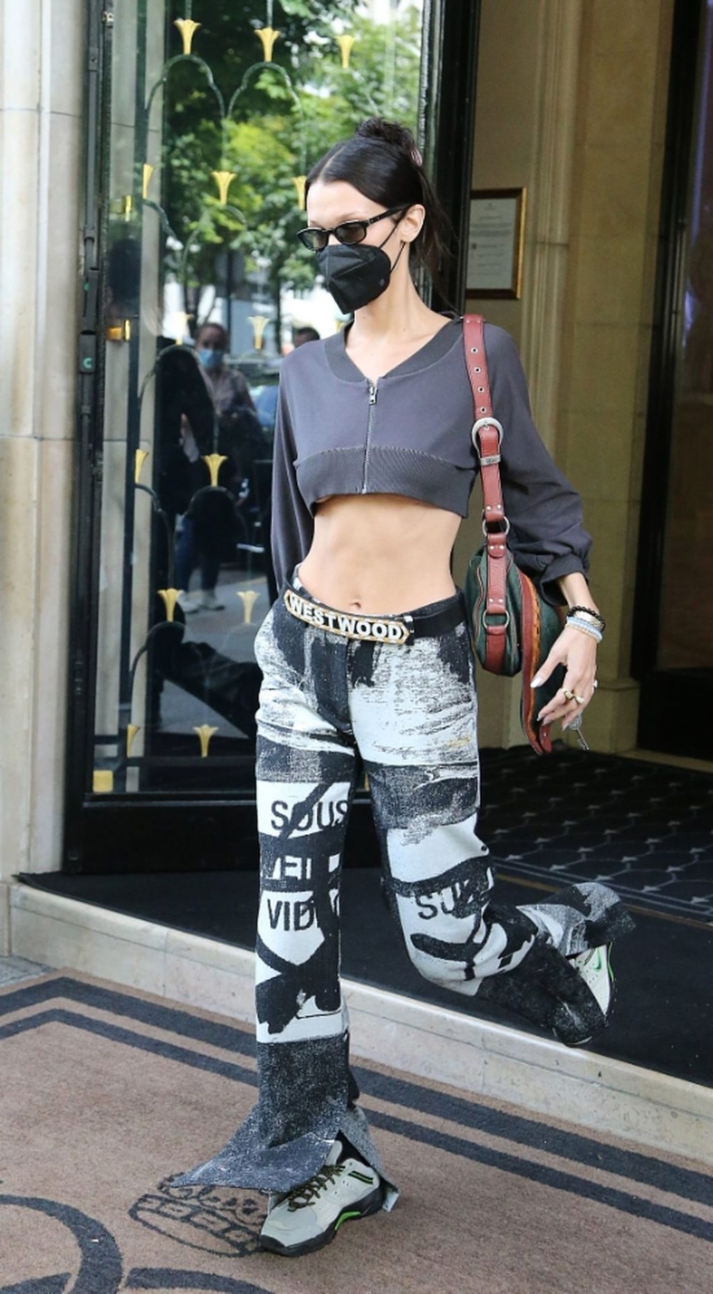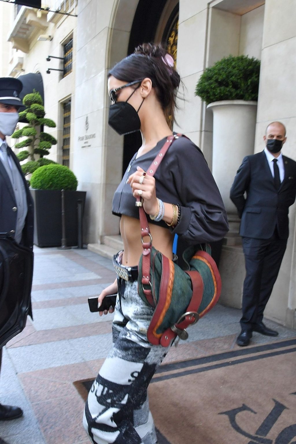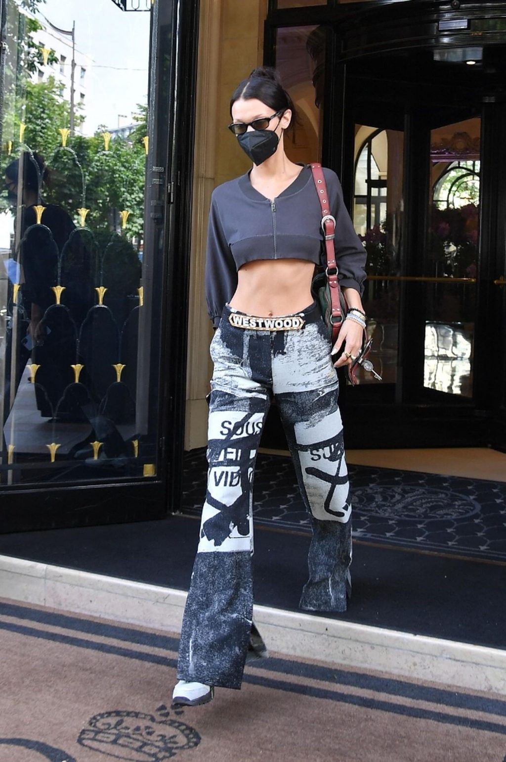 Bella Hadid est vue quittant son hôtel pour le défilé de mode Off White. Elle a passé un test antigénique avant le défilé le 4 juillet 2021 à Paris, France.