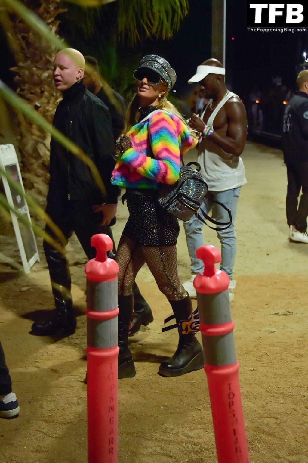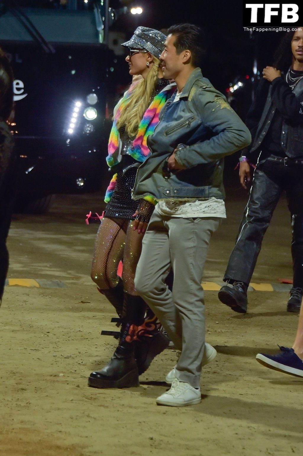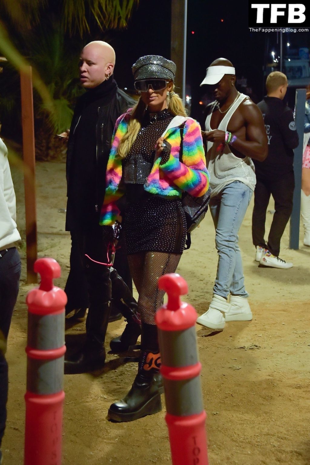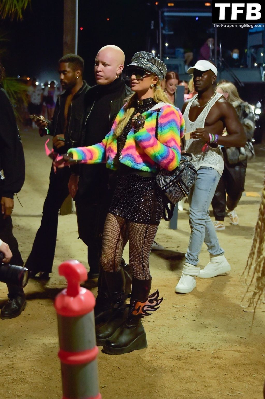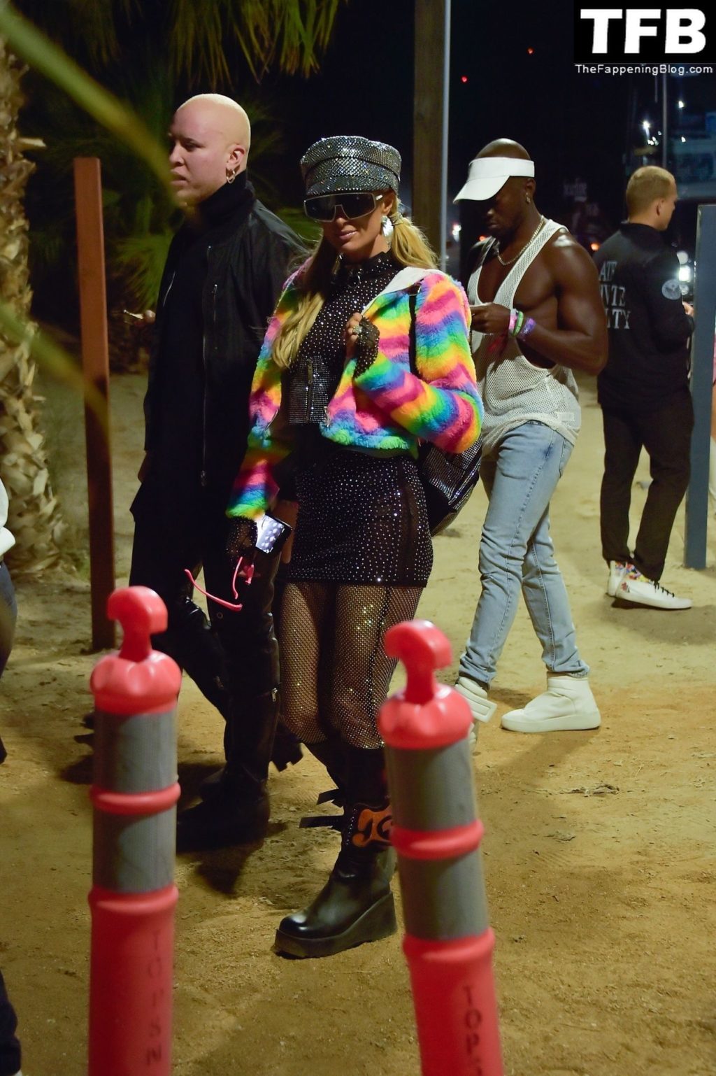 La star du Fappening Paris Hilton et son équipe arrivent à la fête Neon Carnival pendant Coachella et la mondaine est entièrement vêtue pour l’occasion, portant un pull arc-en-ciel associé à une robe scintillante – Indio, 17/04/2022.
