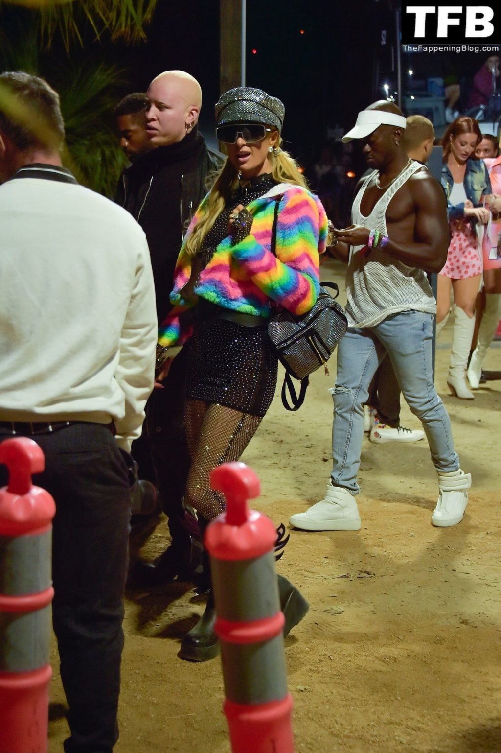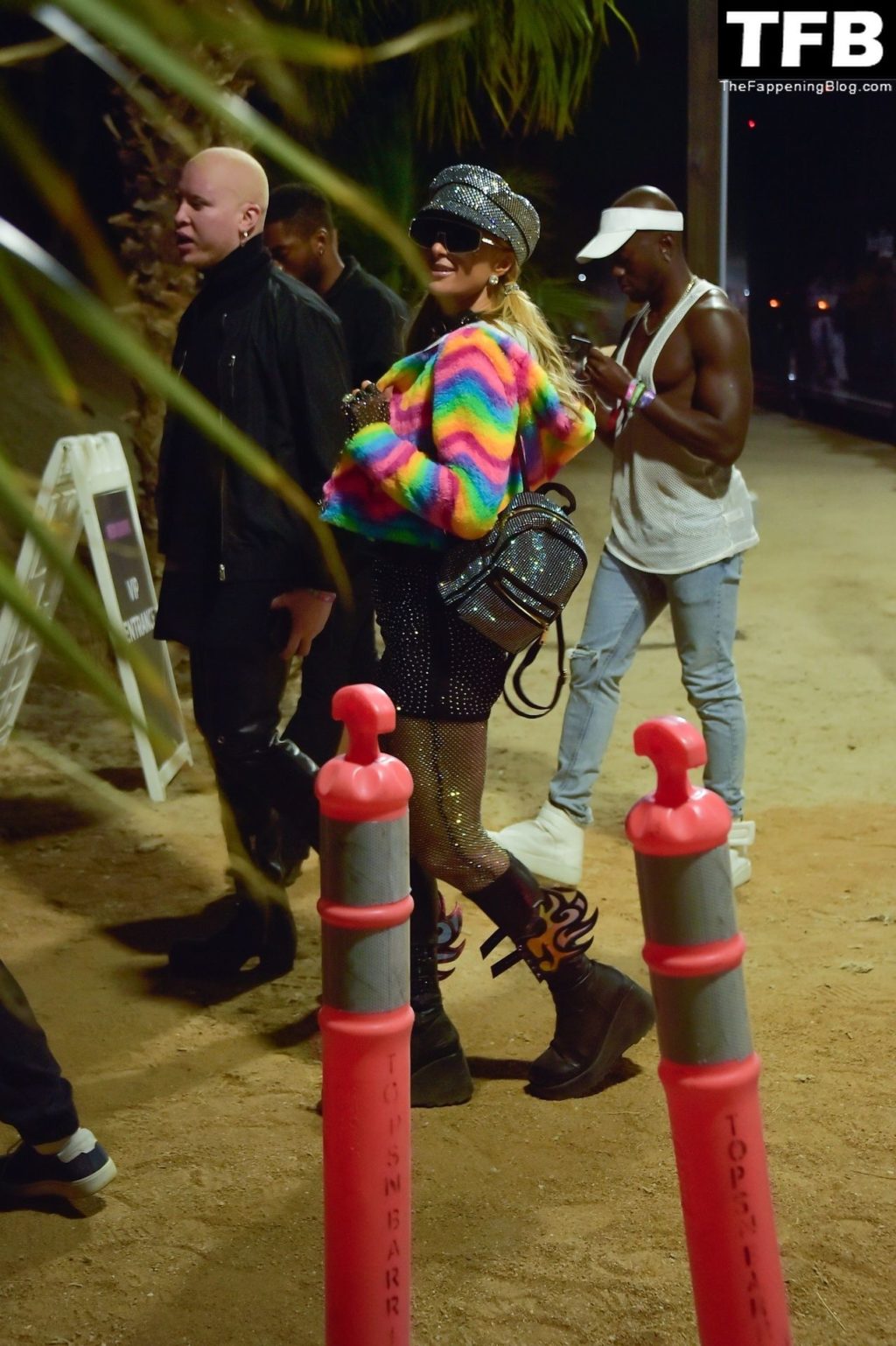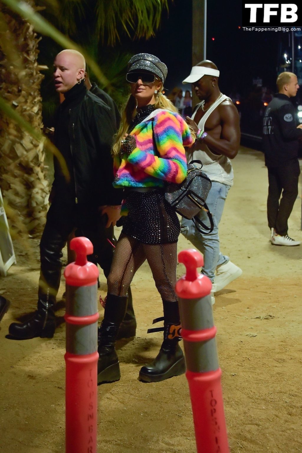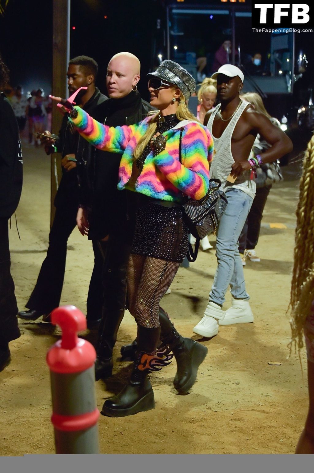 La star du Fappening Paris Hilton et son équipe arrivent à la fête Neon Carnival pendant Coachella et la mondaine est entièrement vêtue pour l’occasion, portant un pull arc-en-ciel associé à une robe scintillante – Indio, 17/04/2022.