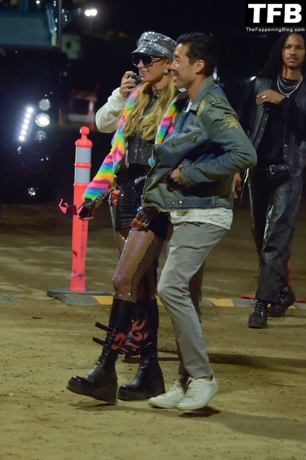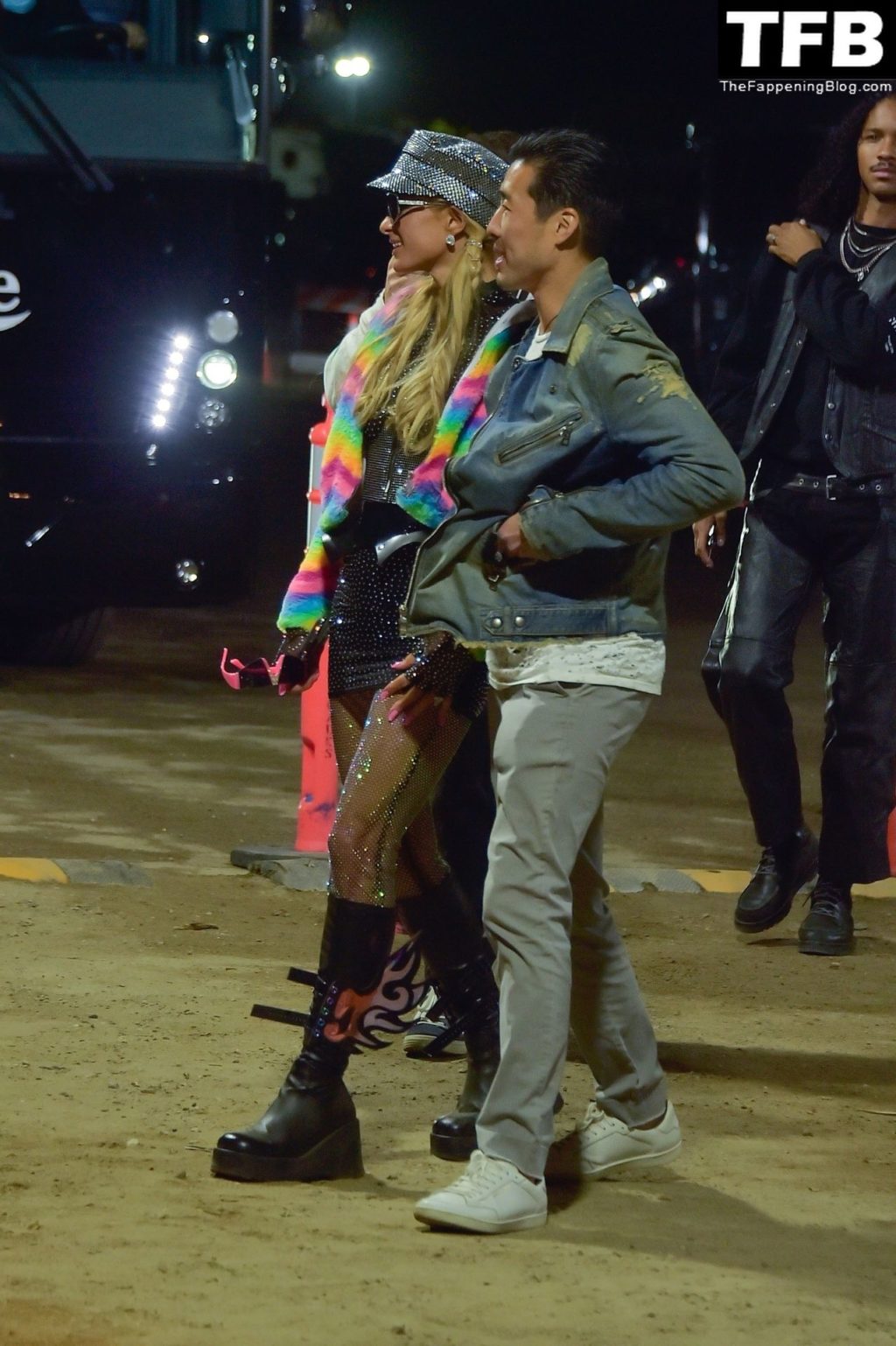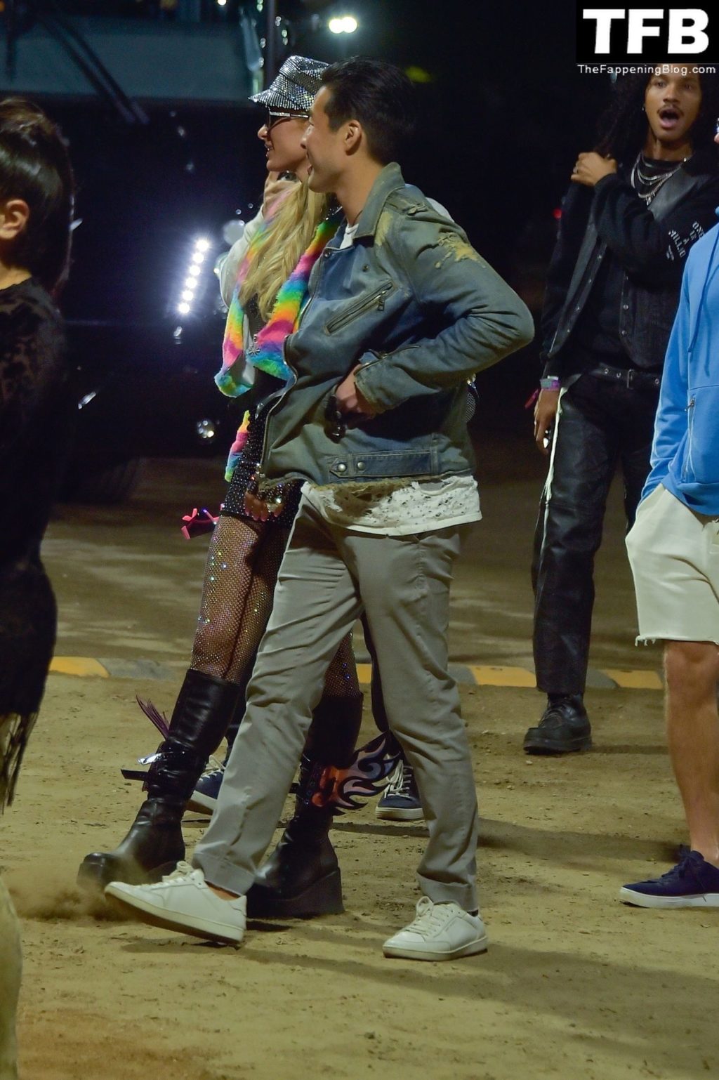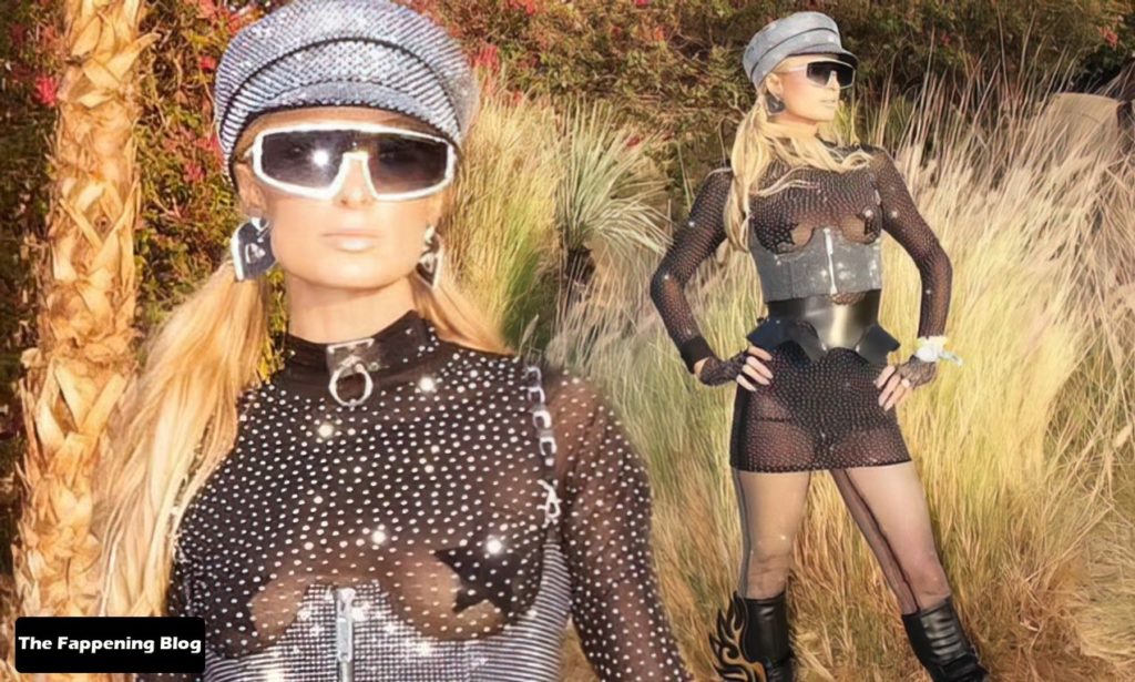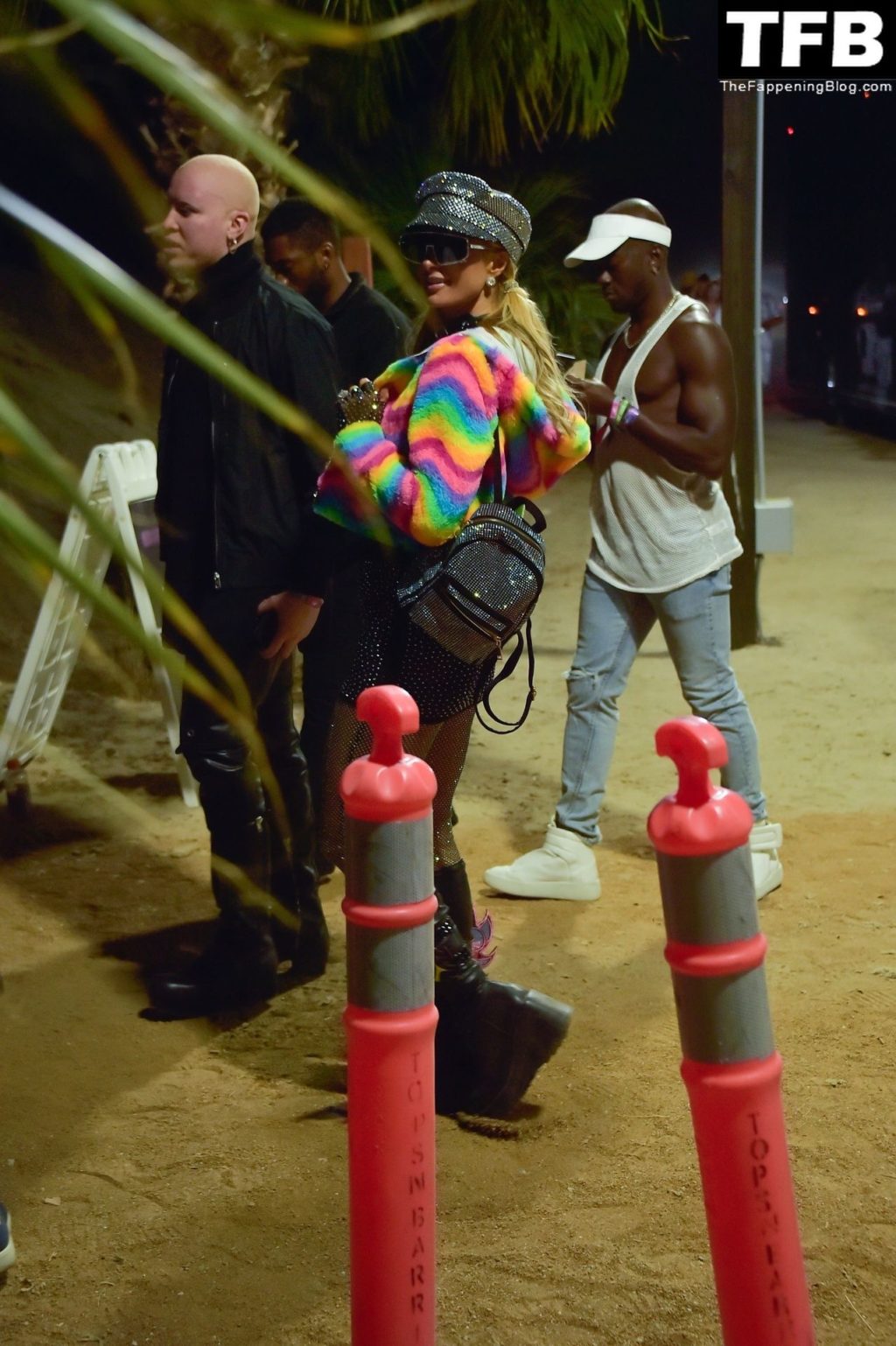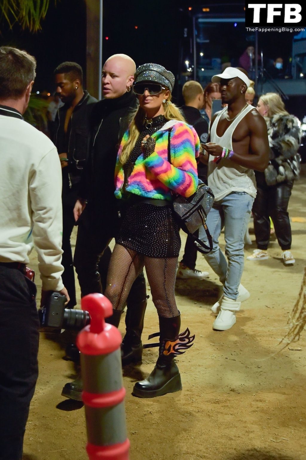 La star du Fappening Paris Hilton et son équipe arrivent à la fête Neon Carnival pendant Coachella et la mondaine est entièrement vêtue pour l’occasion, portant un pull arc-en-ciel associé à une robe scintillante – Indio, 17/04/2022.