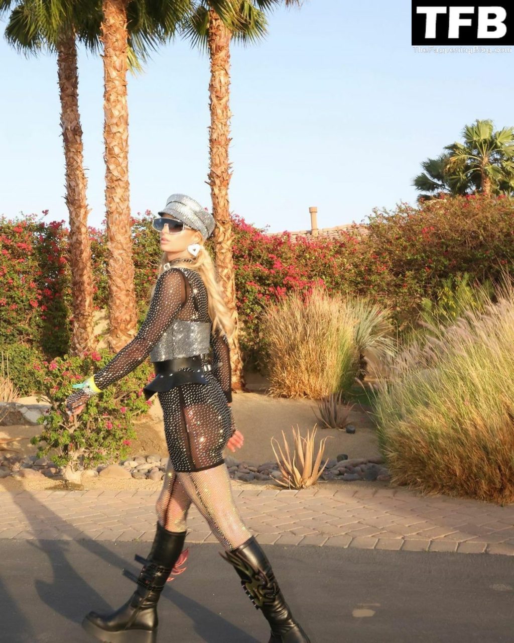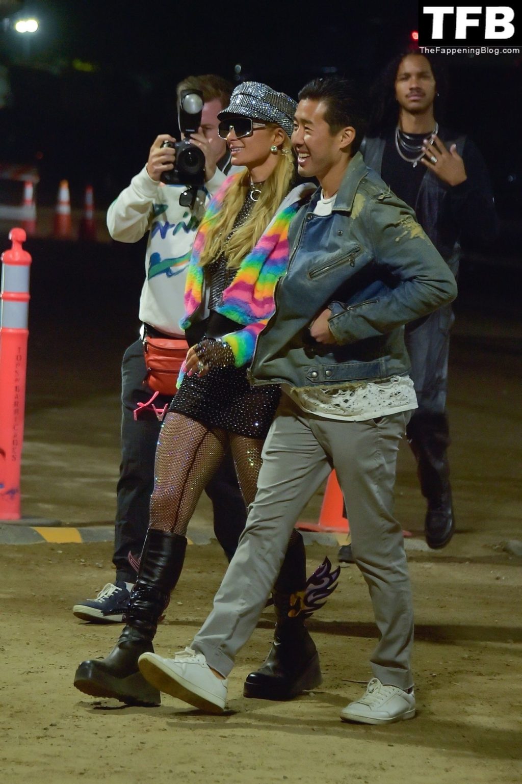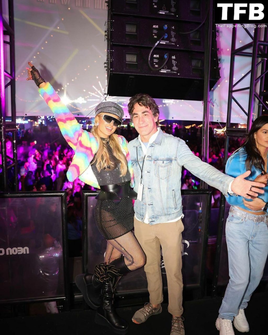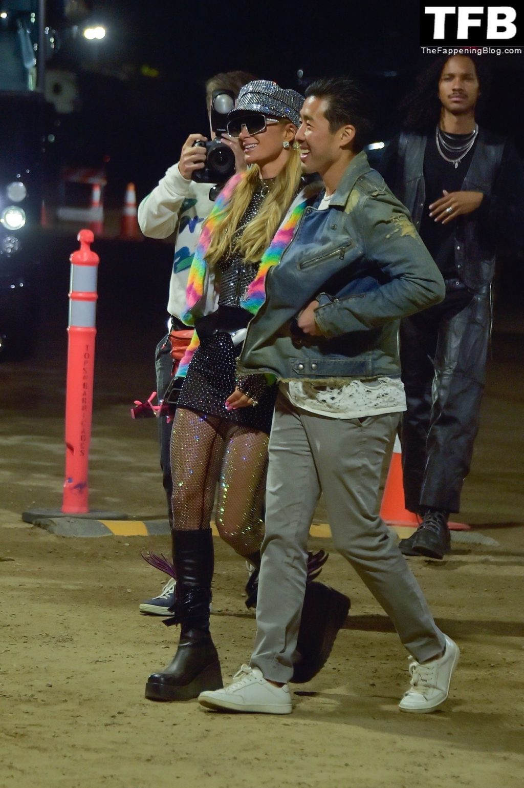 La star du Fappening Paris Hilton et son équipe arrivent à la fête Neon Carnival pendant Coachella et la mondaine est entièrement vêtue pour l’occasion, portant un pull arc-en-ciel associé à une robe scintillante – Indio, 17/04/2022.