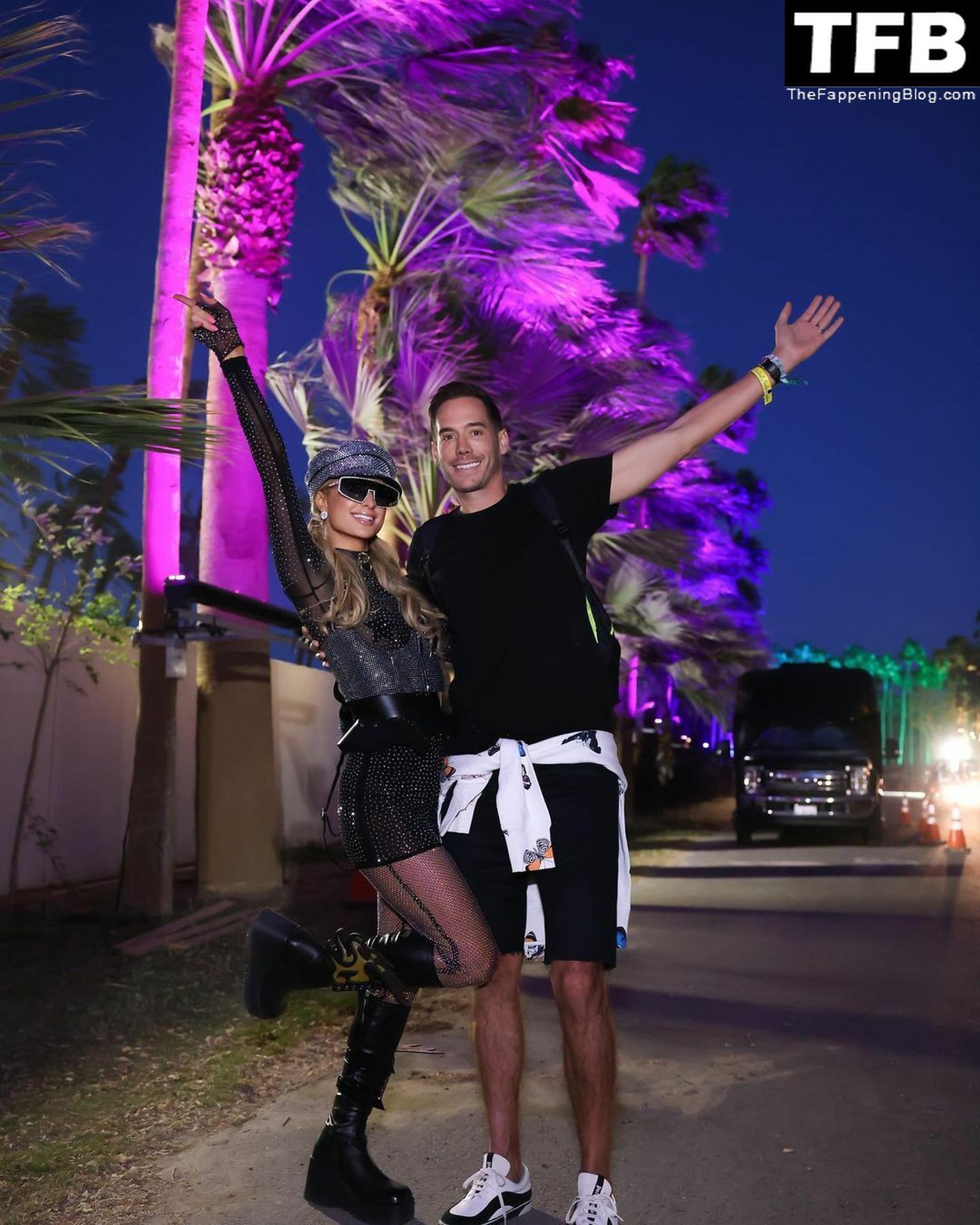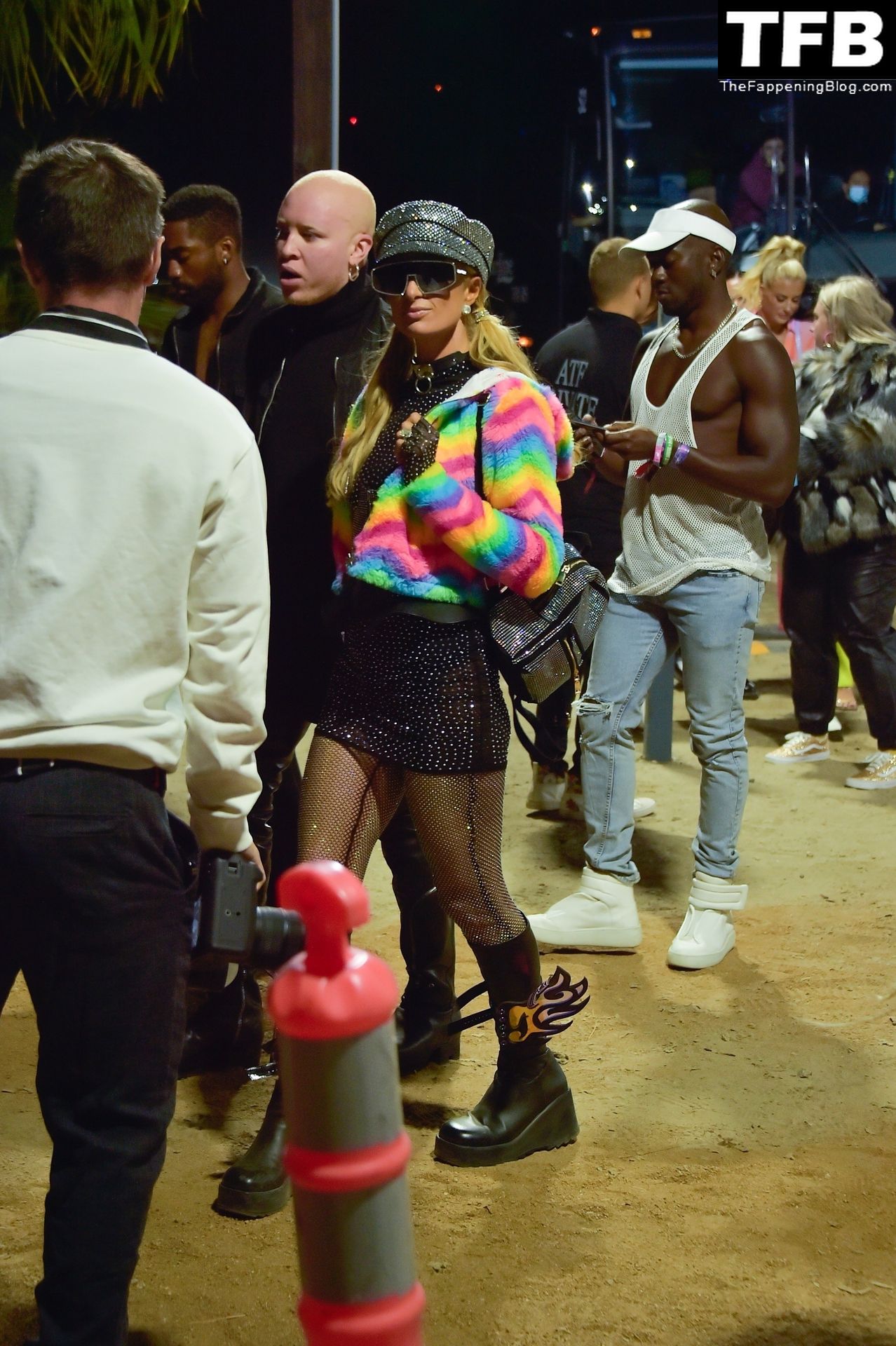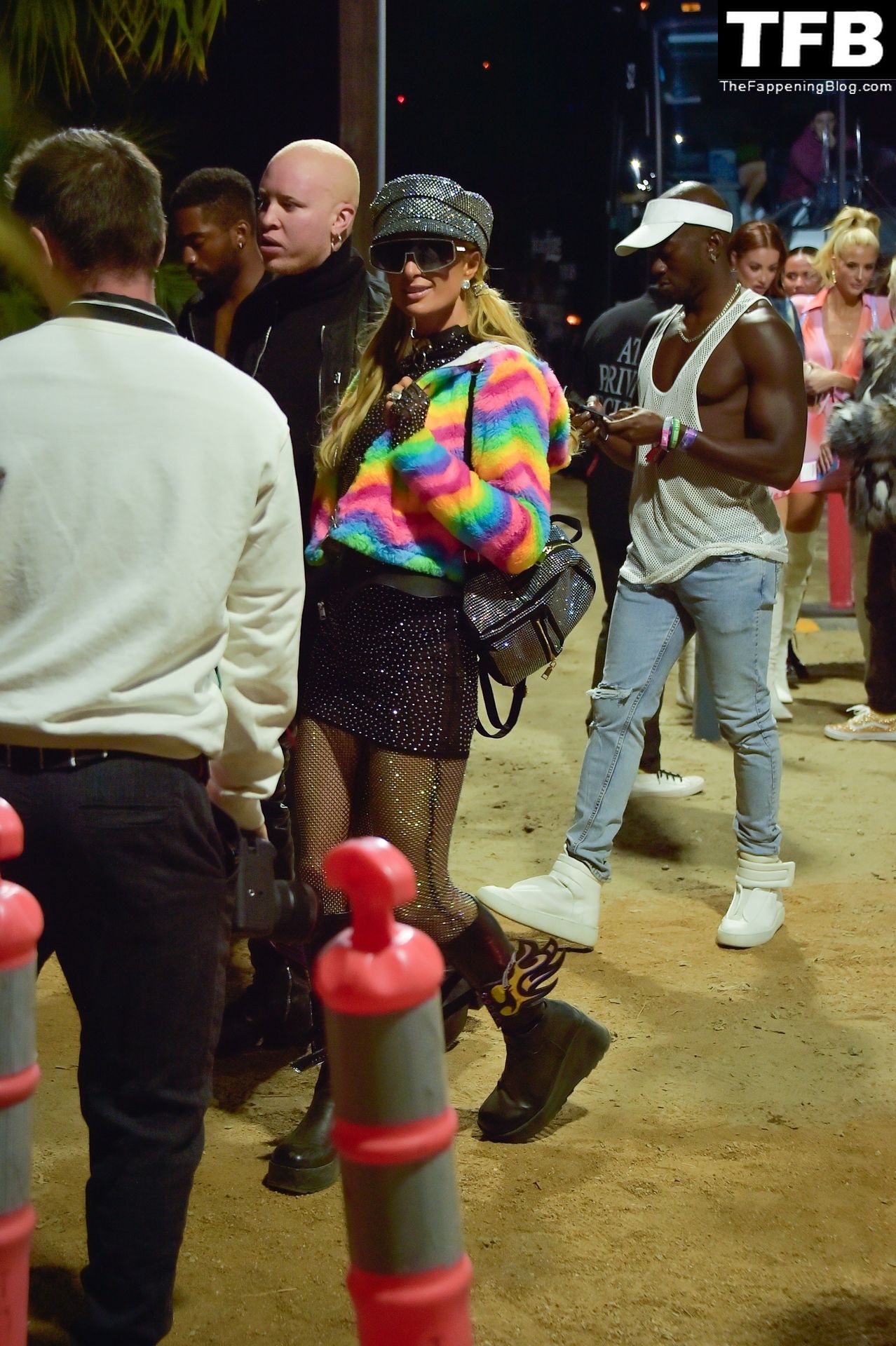 La star du Fappening Paris Hilton et son équipe arrivent à la fête Neon Carnival pendant Coachella et la mondaine est entièrement vêtue pour l’occasion, portant un pull arc-en-ciel associé à une robe scintillante – Indio, 17/04/2022.
