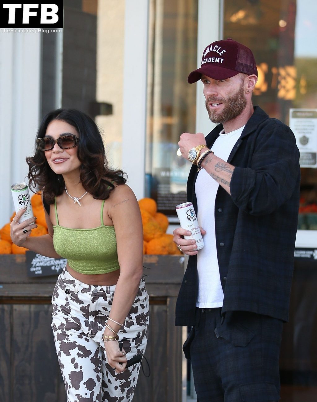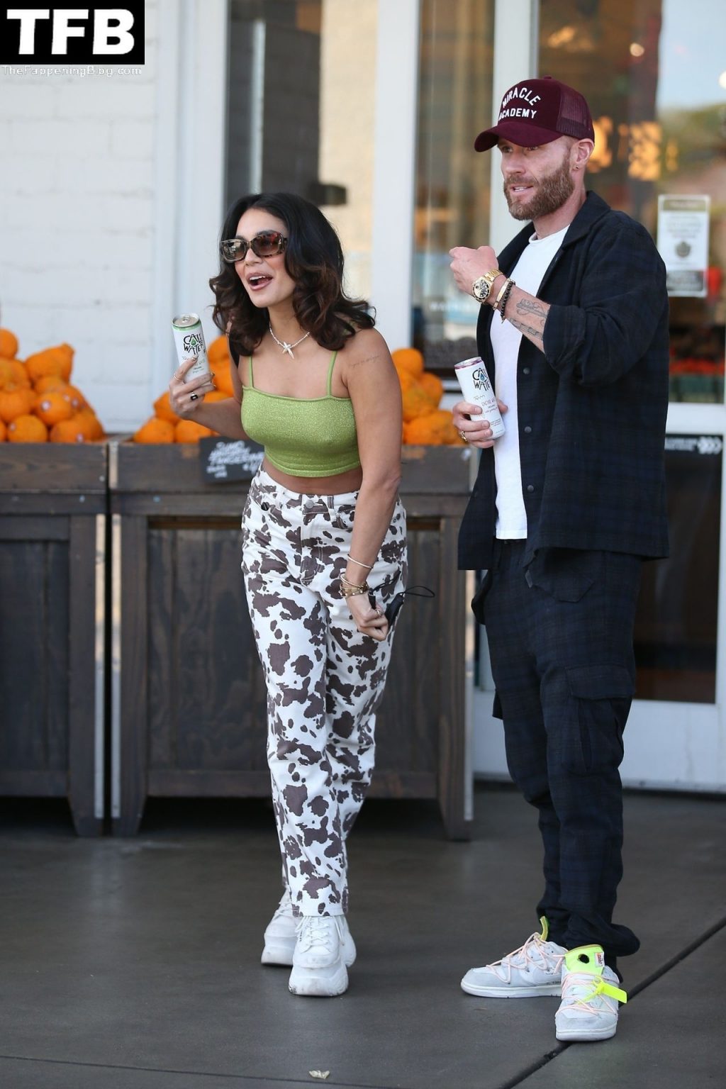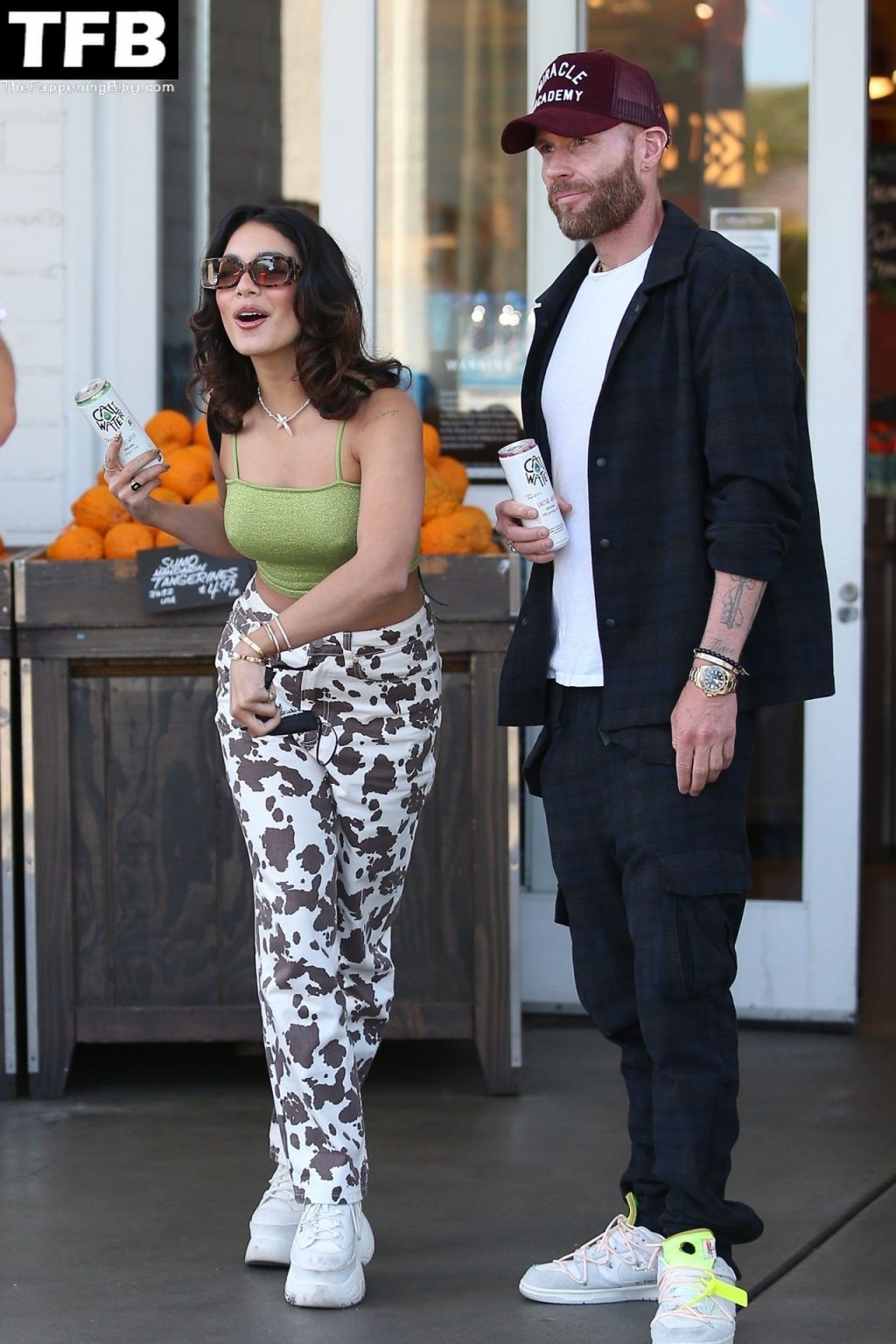 La star de The Fappening et actrice Vanessa Hudgens sort son pantalon à imprimé vache et un haut vert citron pour enregistrer une vidéo promotionnelle chez Bristol Farms pour sa société de boissons, Cali Water, le 18/02/2022.