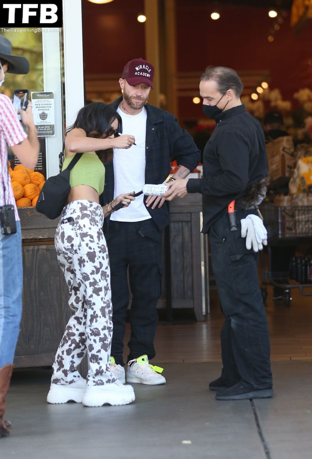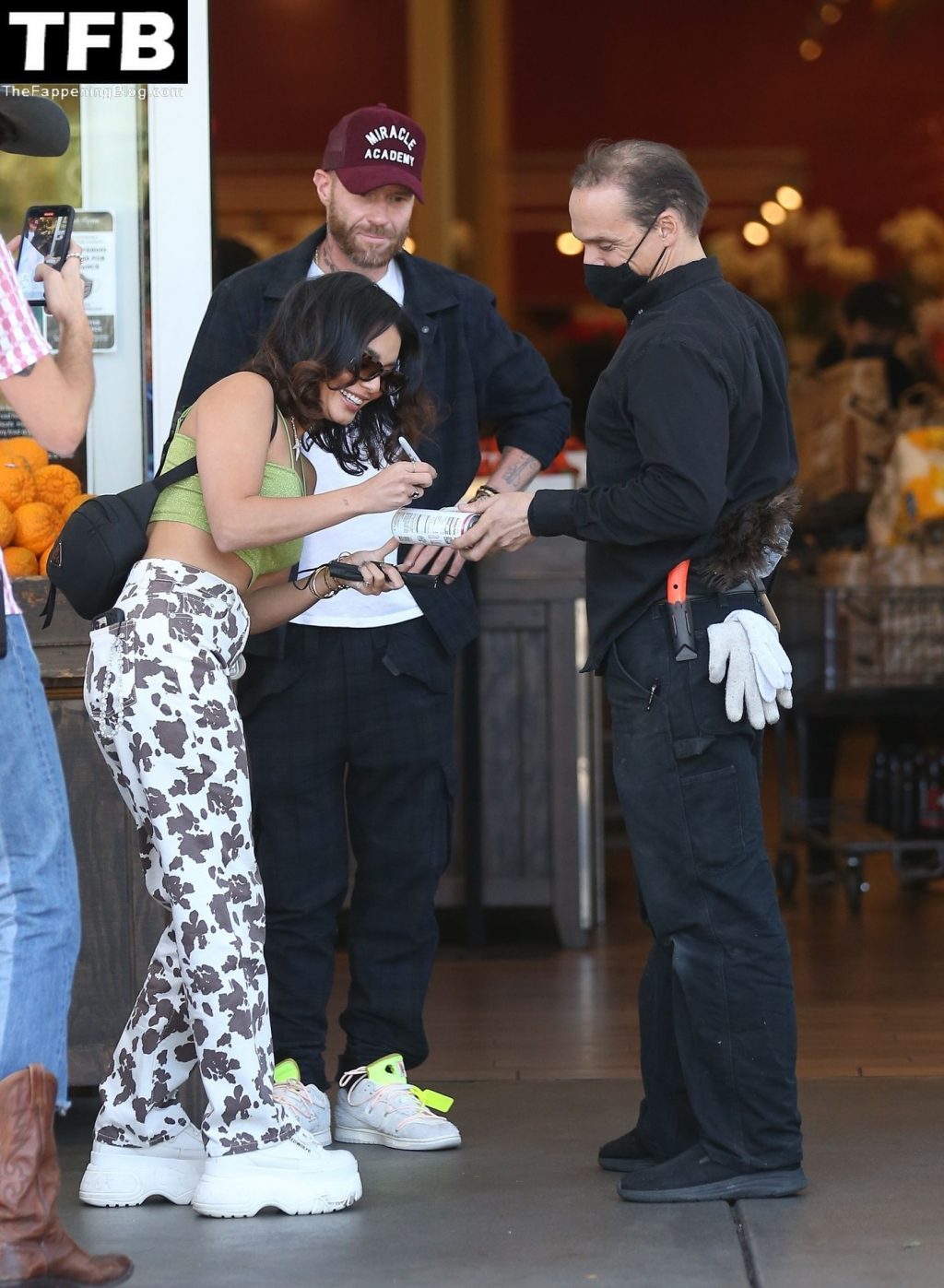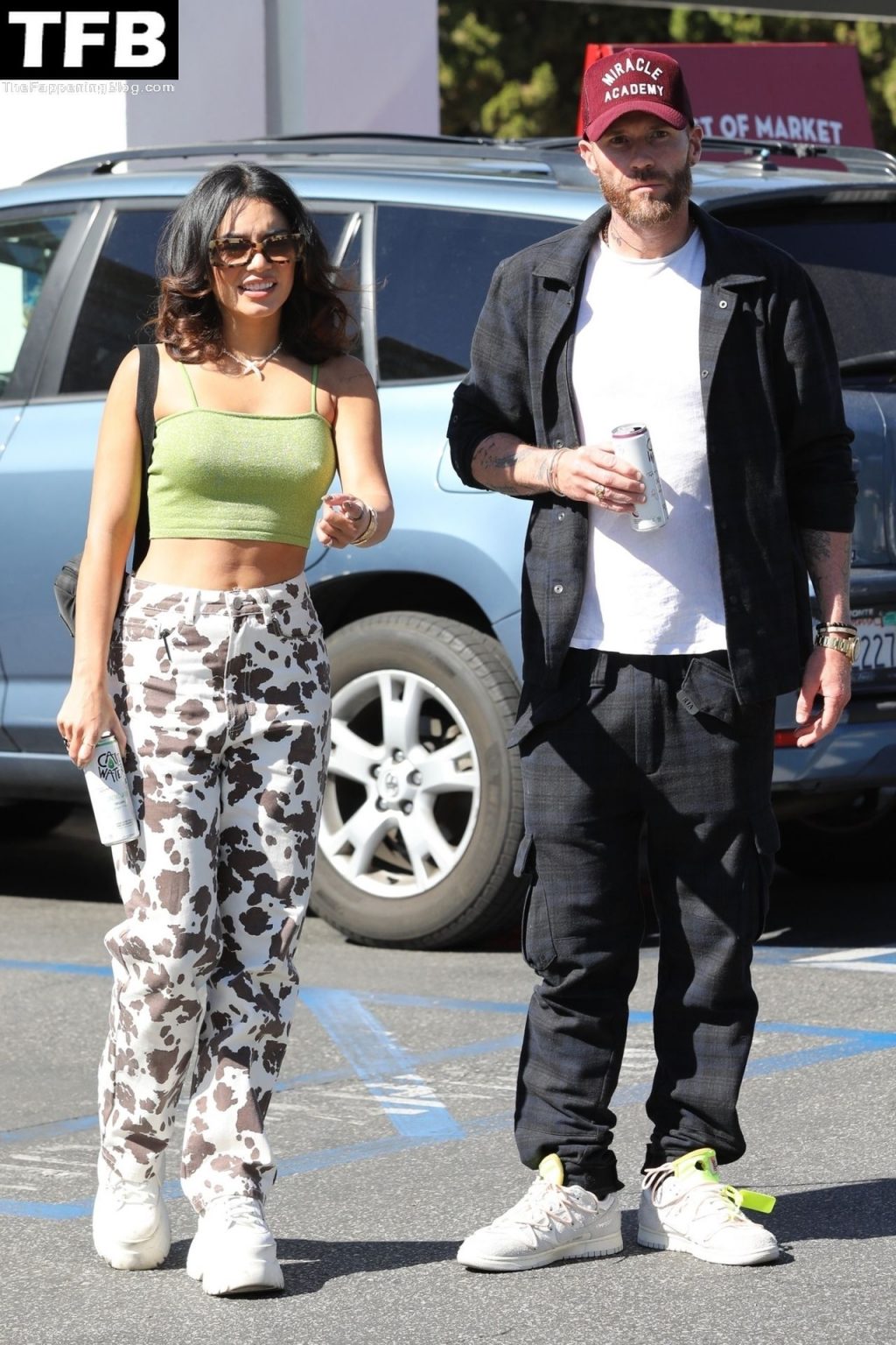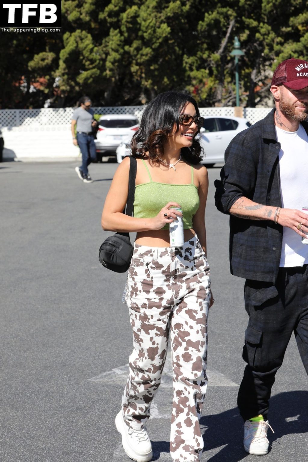 La star de The Fappening et actrice Vanessa Hudgens sort son pantalon à imprimé vache et un haut vert citron pour enregistrer une vidéo promotionnelle chez Bristol Farms pour sa société de boissons, Cali Water, le 18/02/2022.