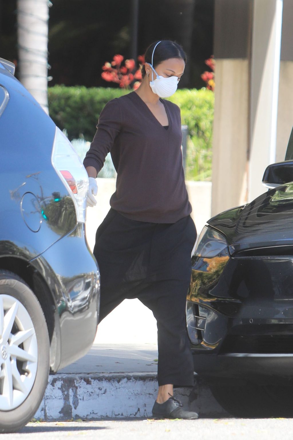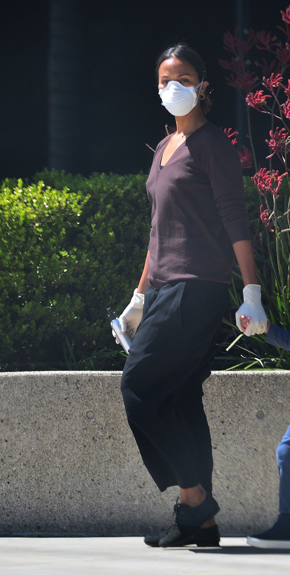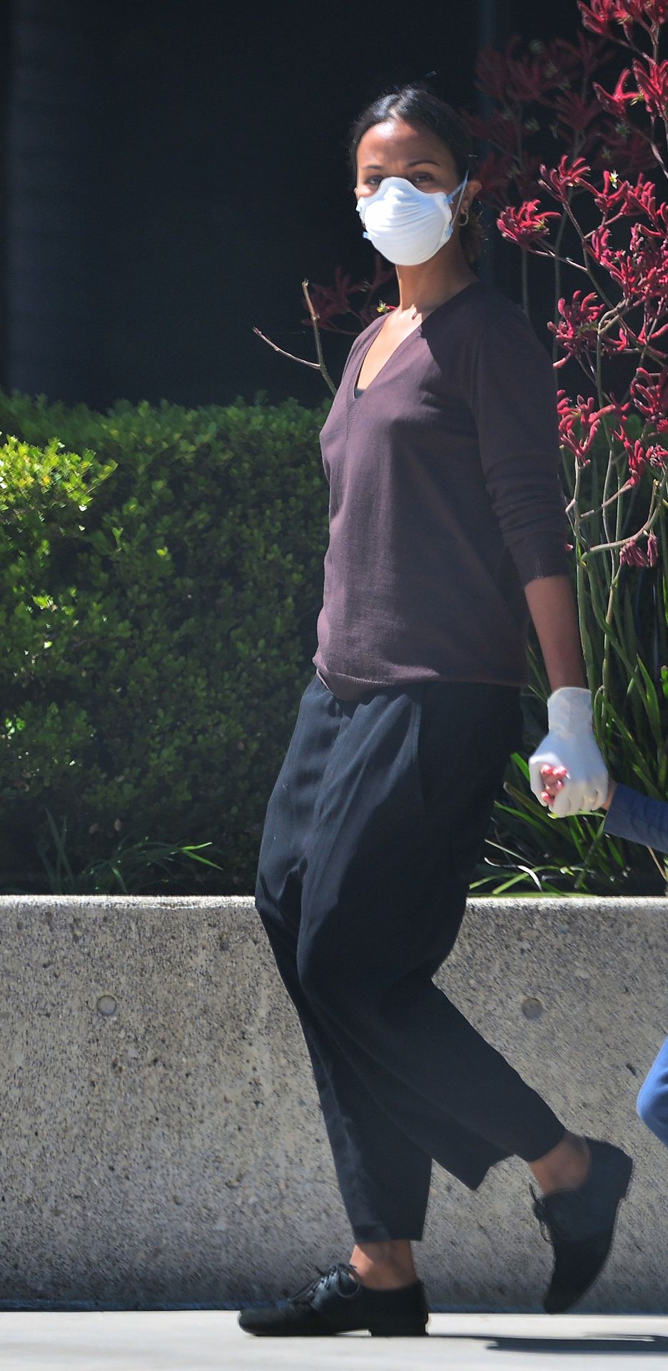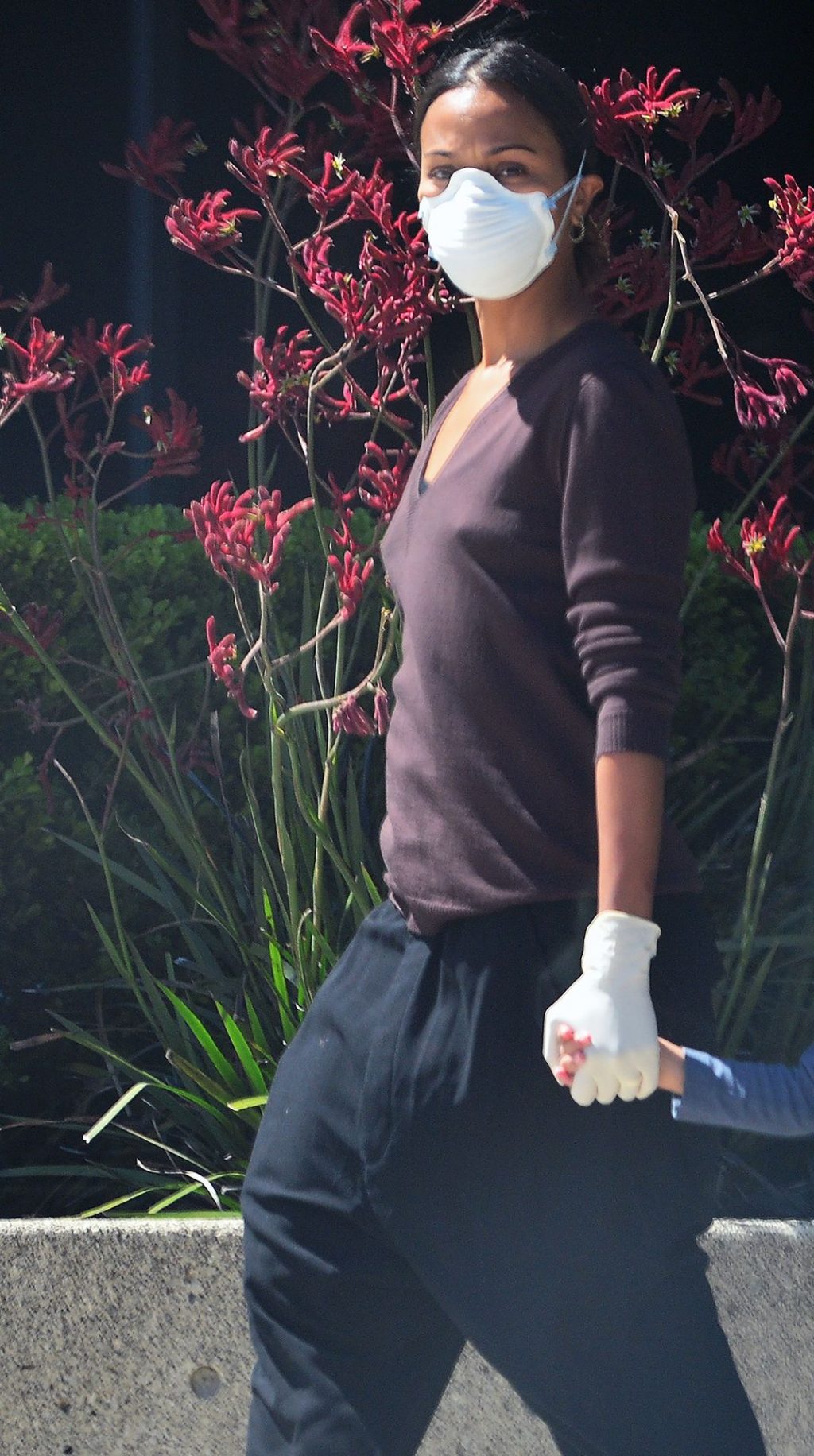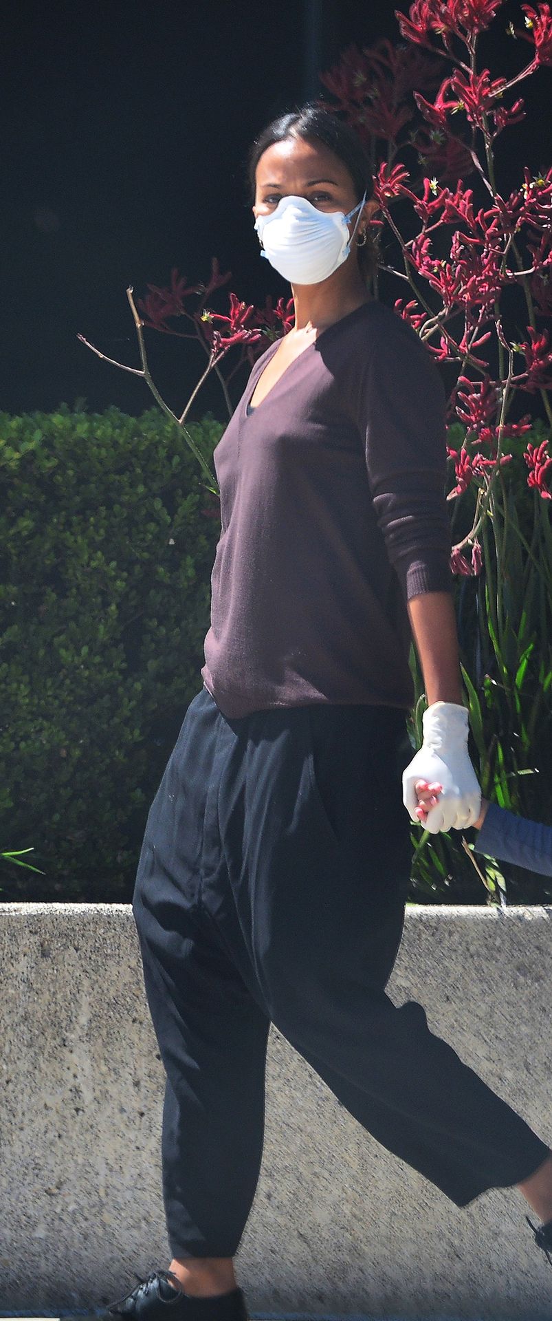 Zoe Saldana et Marco Perego sortent à Los Angeles, le 13/05/2020. L’actrice de 41 ans d'”Avatar” portait un masque facial, un pull bordeaux, un pantalon ample et des chaussures noires.