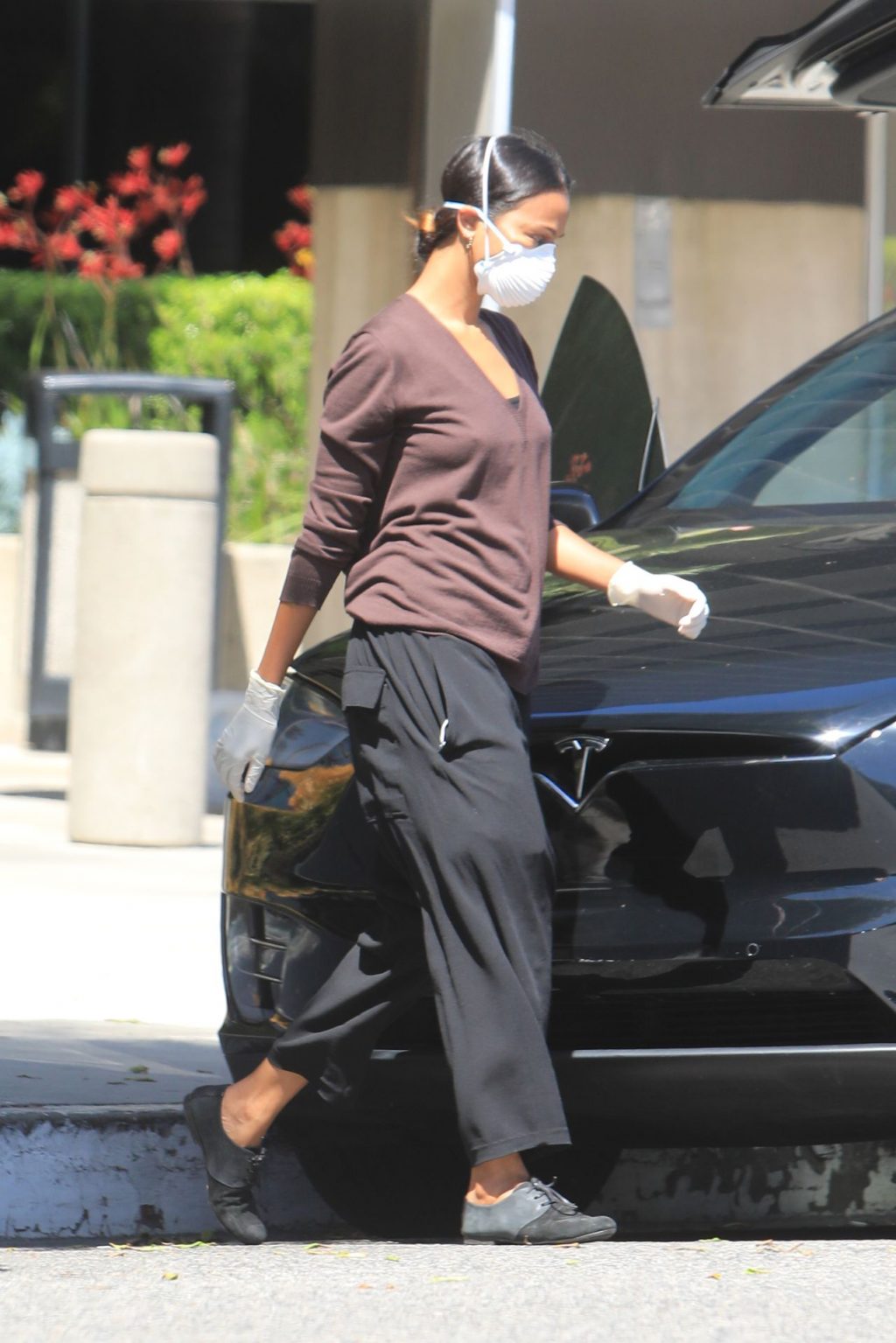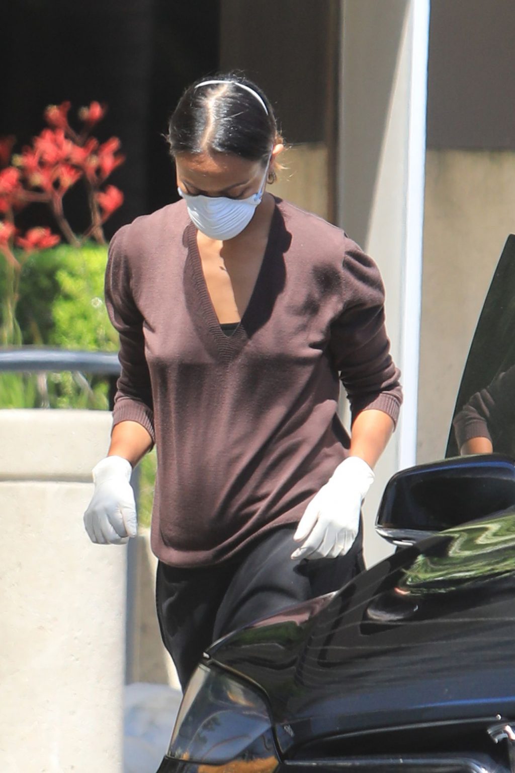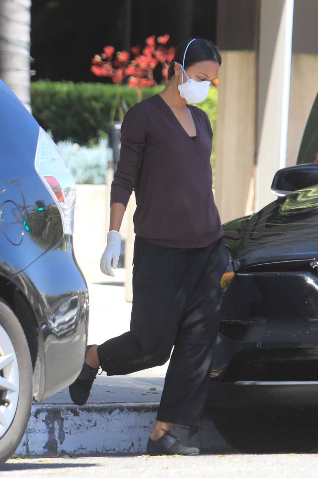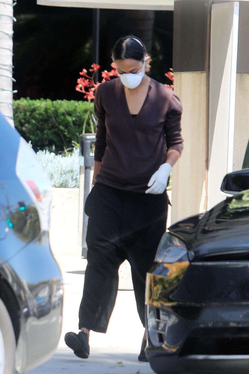 Zoe Saldana et Marco Perego sortent à Los Angeles, le 13/05/2020. L’actrice de 41 ans d'”Avatar” portait un masque facial, un pull bordeaux, un pantalon ample et des chaussures noires.