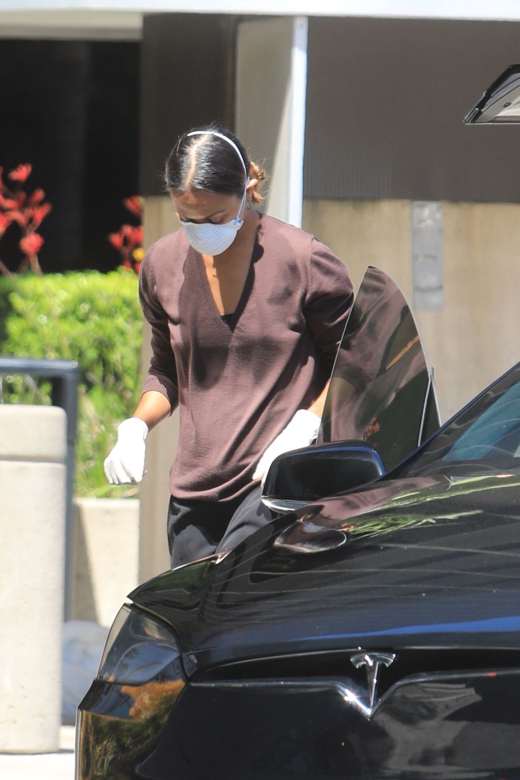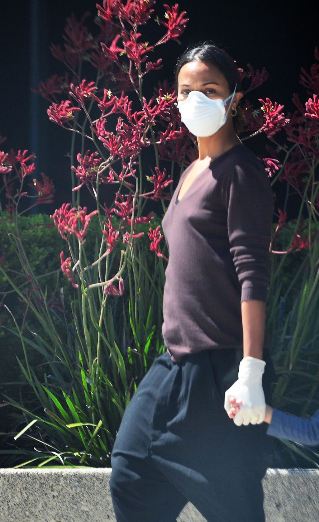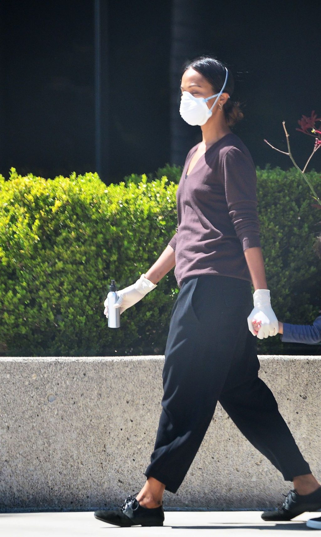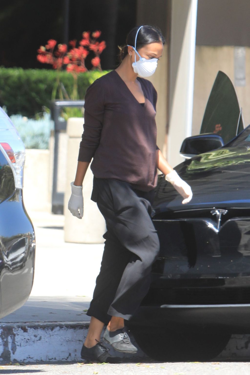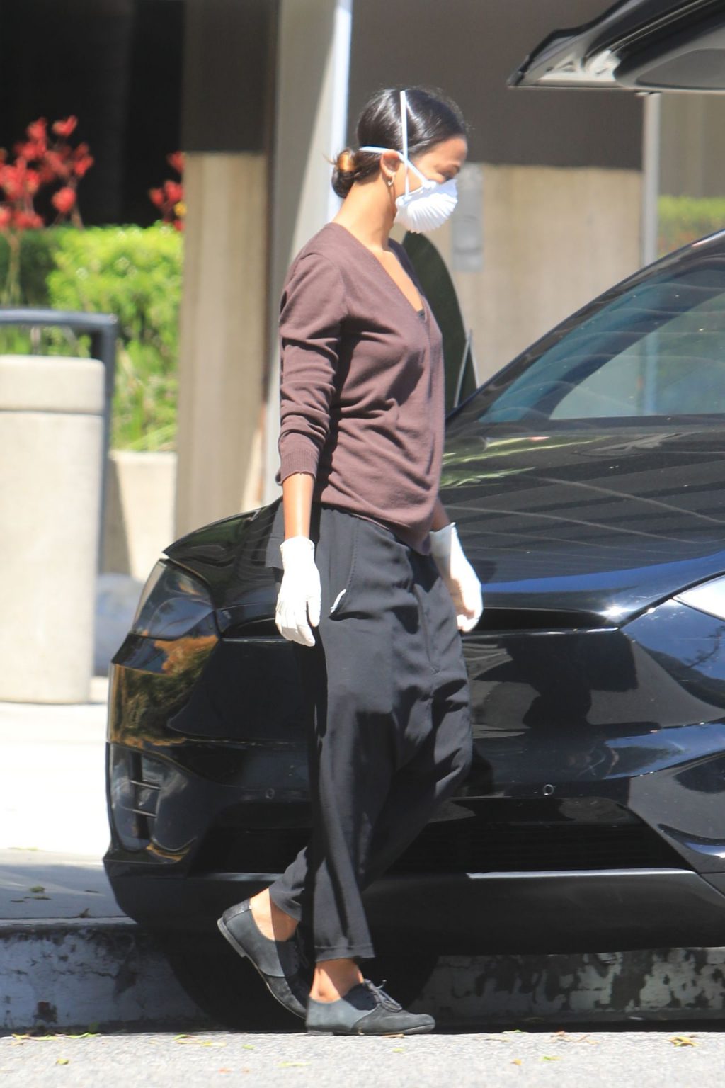 Zoe Saldana et Marco Perego sortent à Los Angeles, le 13/05/2020. L’actrice de 41 ans d'”Avatar” portait un masque facial, un pull bordeaux, un pantalon ample et des chaussures noires.