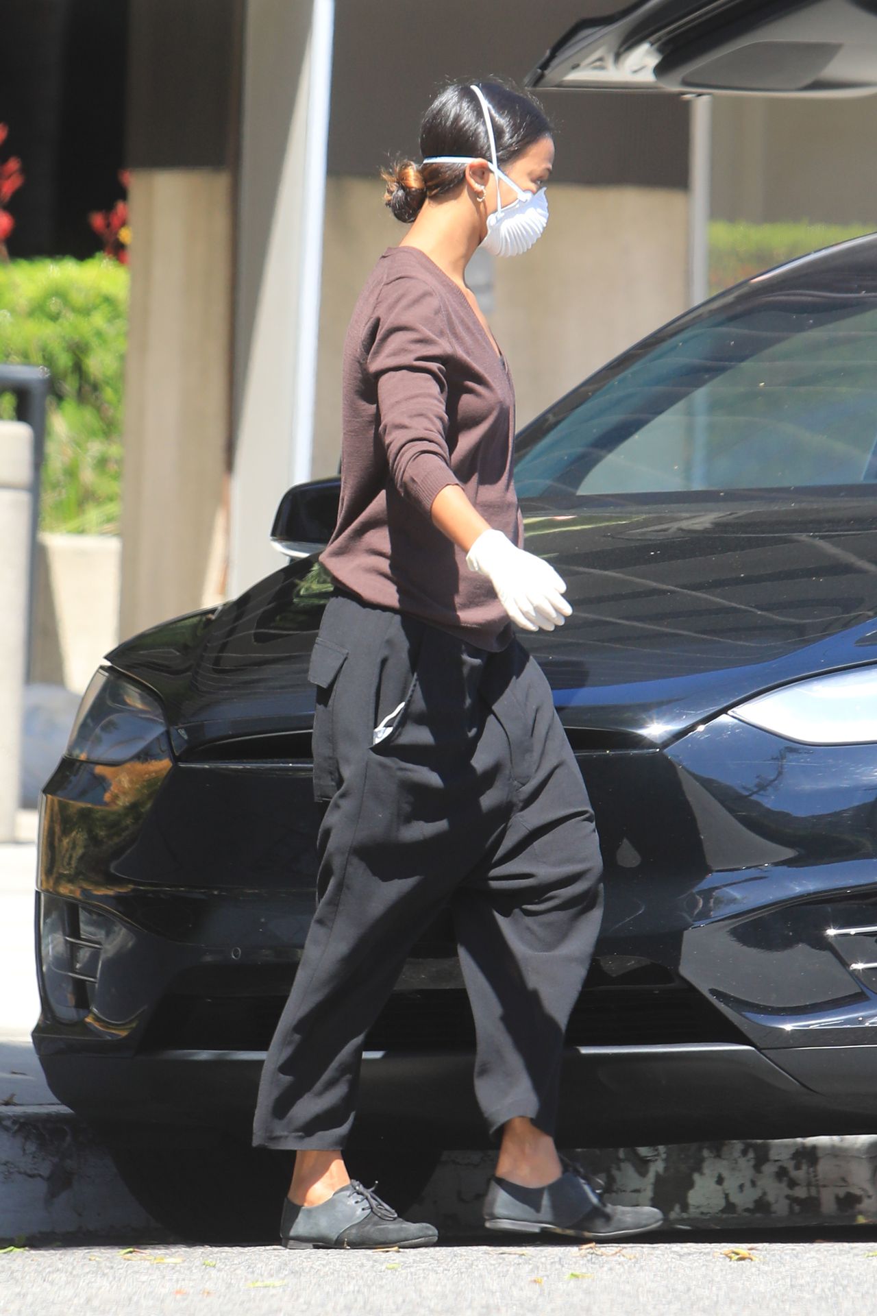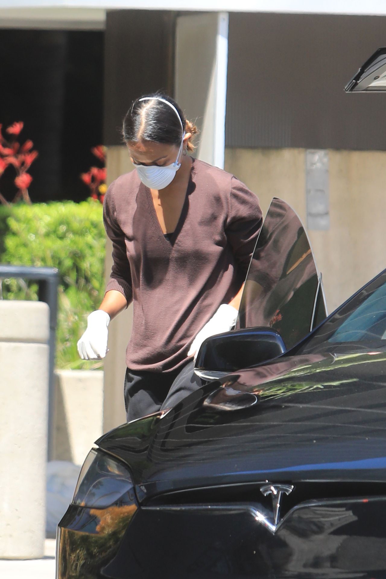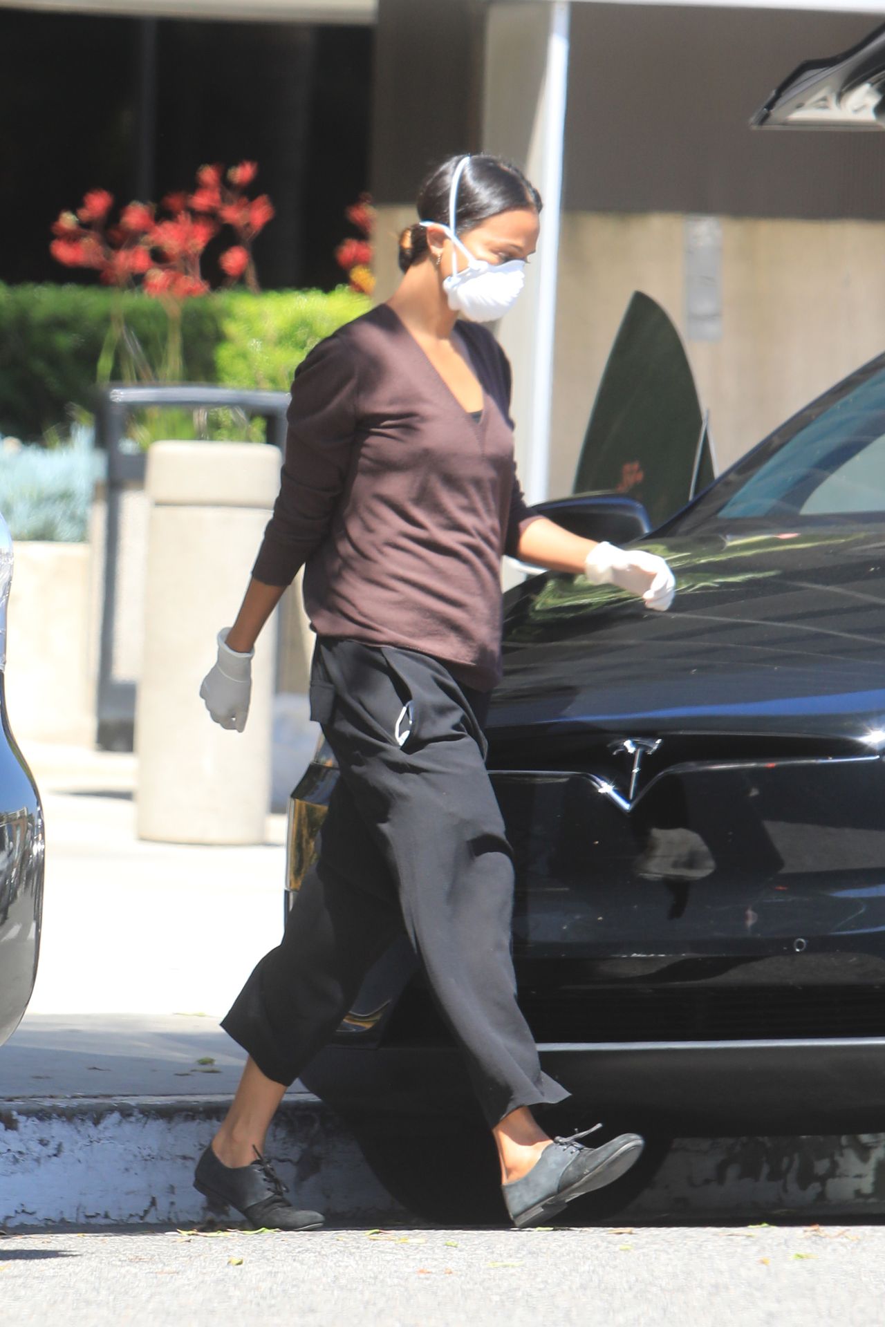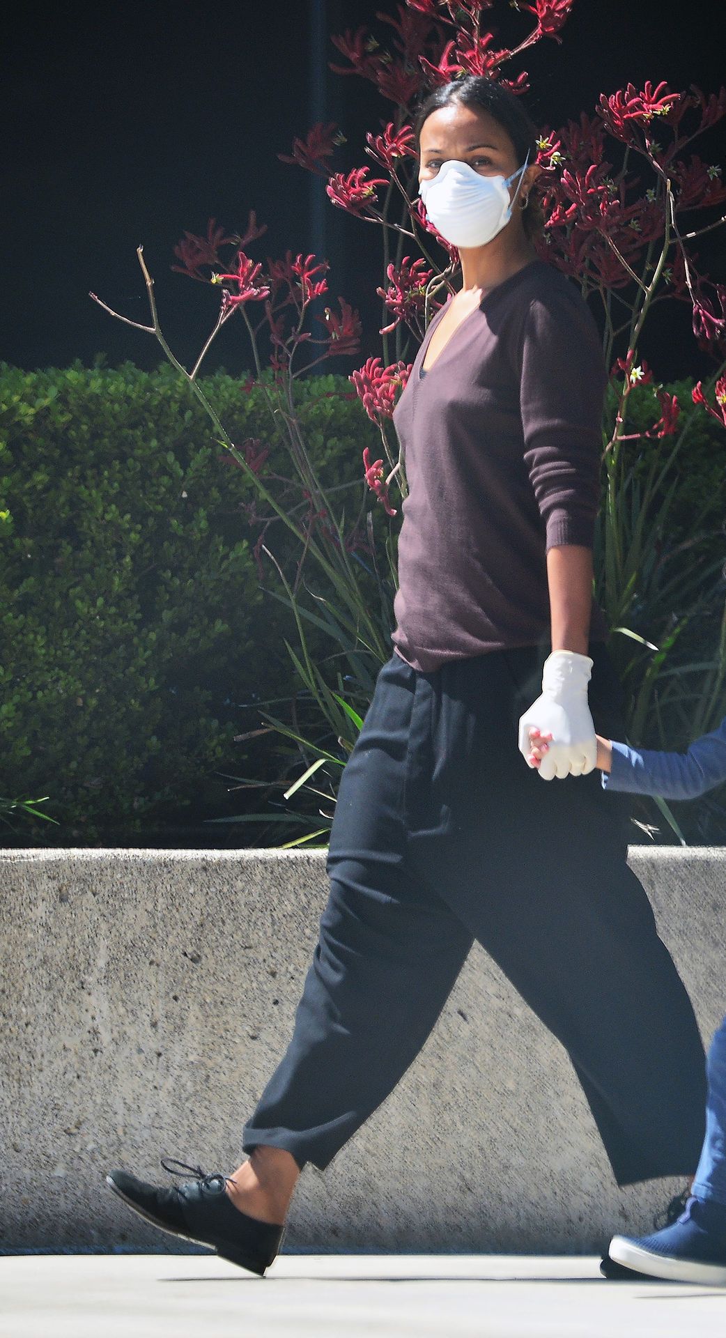 Zoe Saldana et Marco Perego sortent à Los Angeles, le 13/05/2020. L’actrice de 41 ans d'”Avatar” portait un masque facial, un pull bordeaux, un pantalon ample et des chaussures noires.