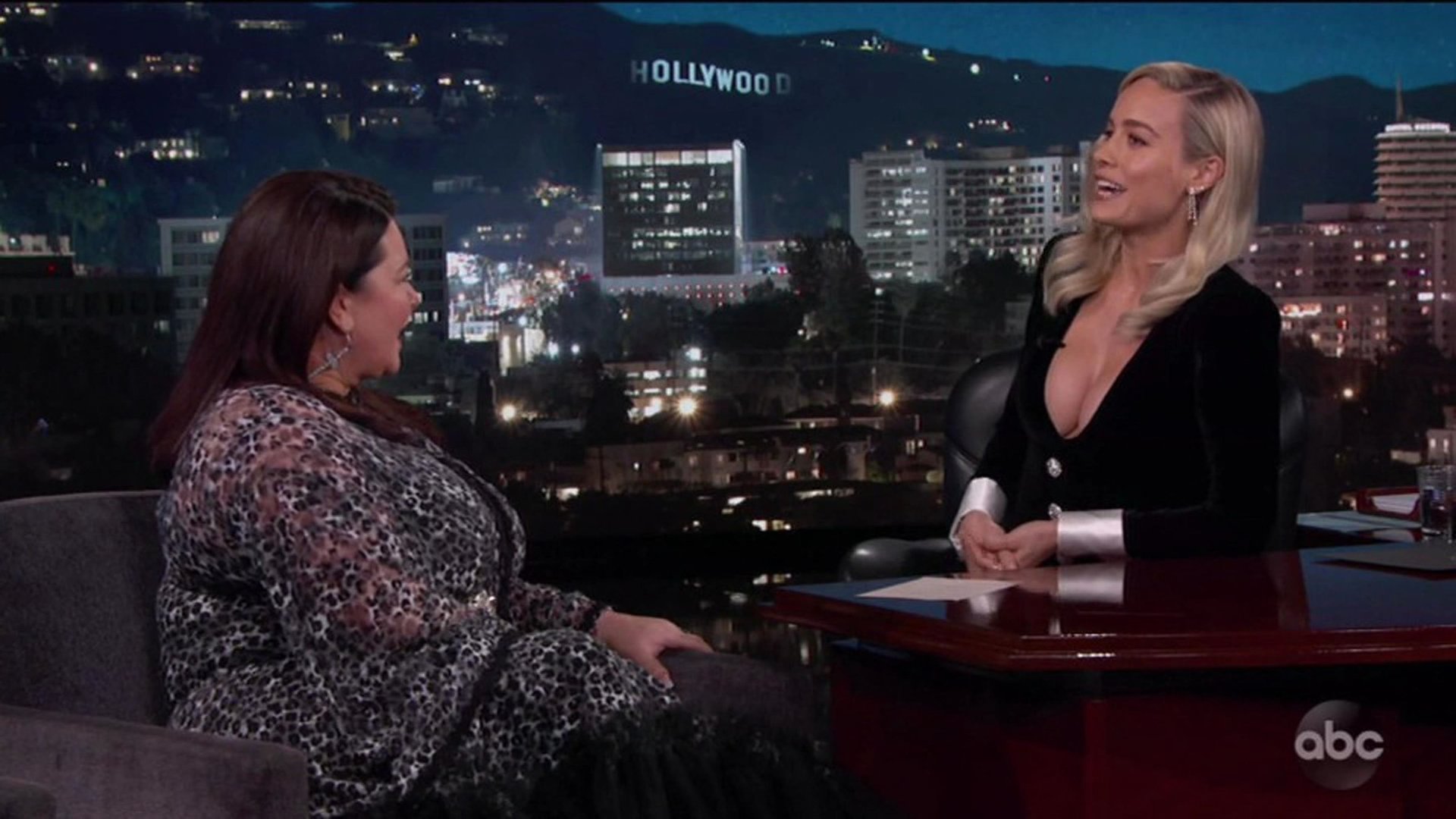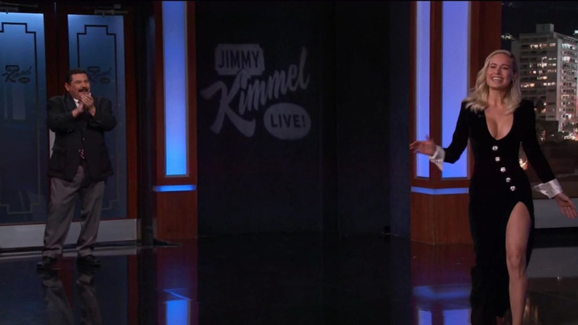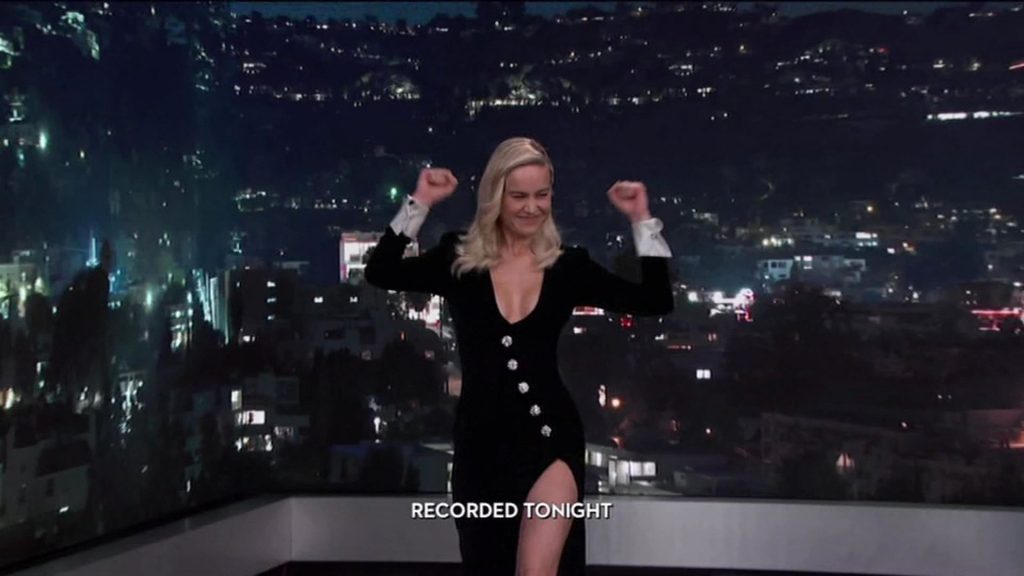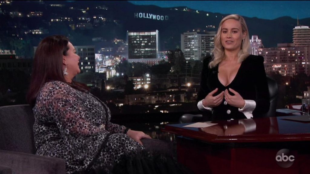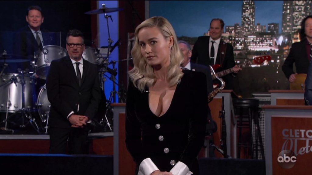 Brie Larson affiche sa poitrine époustouflante de 34D dans une robe incroyablement décolletée alors qu’elle assure l’animation de Jimmy Kimmel Live, le 19/11/2019. La star de Captain Marvel et du Fappening a évité de justesse un incident vestimentaire en animant le talk-show nocturne dans une robe noire éblouissante qui non seulement mettait en valeur sa poitrine mais comportait aussi une fente sexy jusqu’en haut de la cuisse.