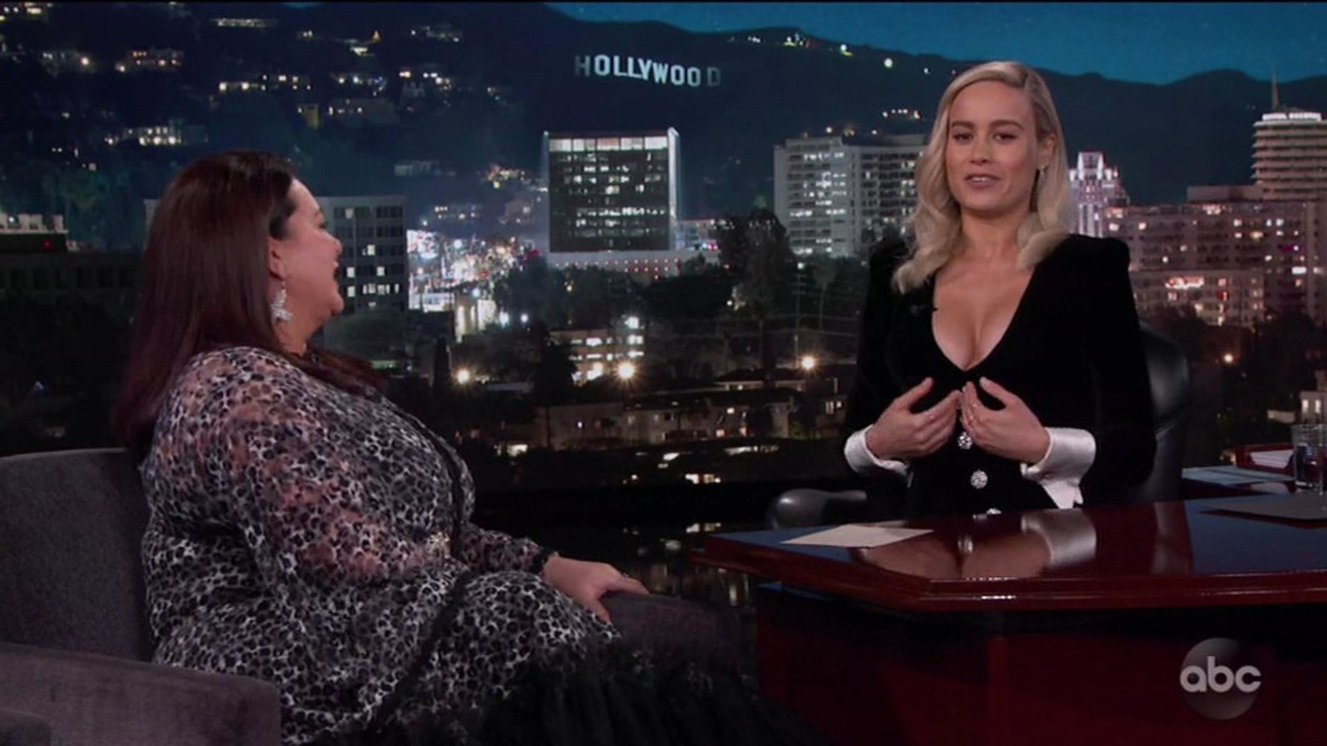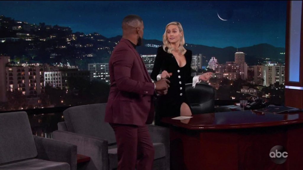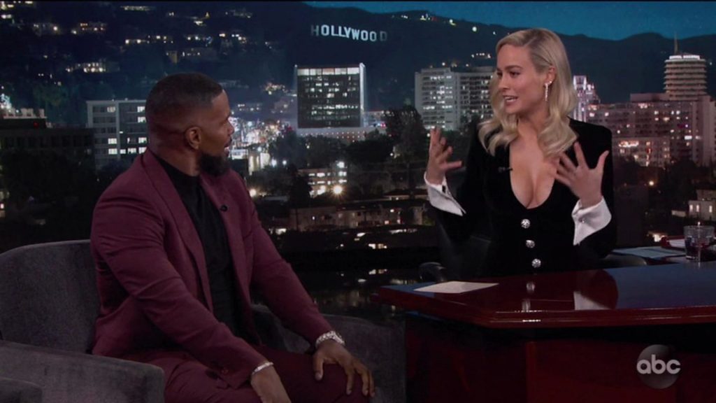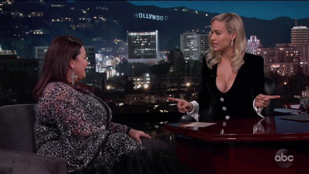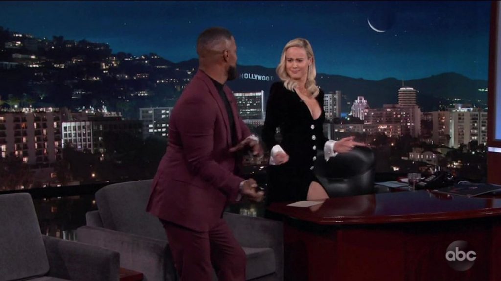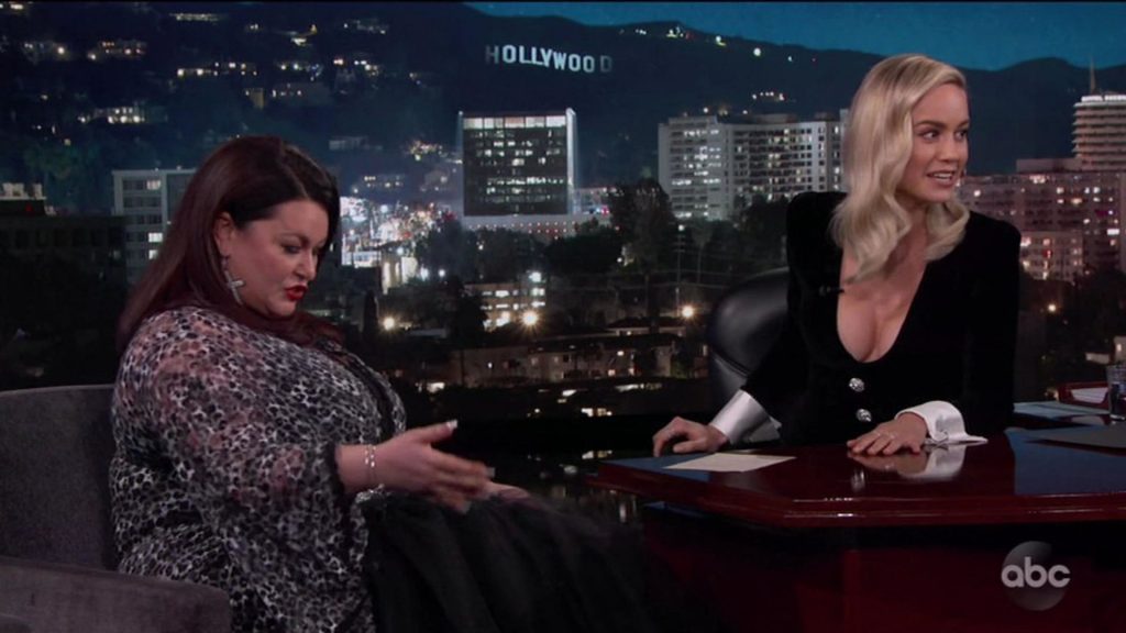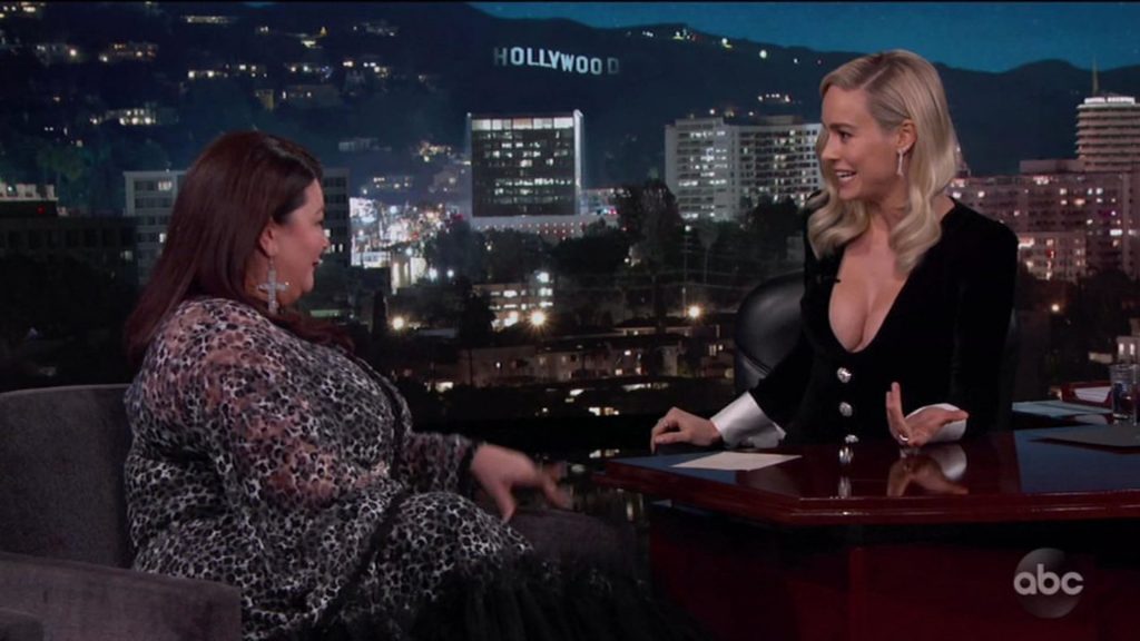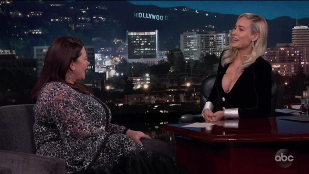 Molly a confirmé que c’était son super pouvoir, ce qui a poussé Brie à pointer sa robe en plaisantant : « Je t’ai facilité la tâche ! Voilà ! » Molly lui a alors dit : « Tu es un 30F, ce qui correspond à un triple D à G mais ce n’est pas ce que tu achètes. » Une Brie stupéfaite a répondu : « Je ne l’achète pas ! » Molly a ajouté : « Tu achètes plutôt des 34D, » ce à quoi Brie a répliqué : « Oh mon dieu ! » Molly lui a ensuite demandé : « C’est ce que tu achètes ? » et la star a confirmé : « Oui ! » Après que Molly s’est plainte que « personne en Amérique ne connaît les tailles de soutien-gorge », Brie a sorti une photo de Taylor Swift dans le nouveau film Cats et a dit : « J’ai un défi pour toi. Quelle est la taille de soutien-gorge de celle-ci ? » Molly a répondu en riant : « Elle est un peu plus petite, elle est D. » Brie, qui avait plaisanté sur le nouveau film Cats dans le monologue d’ouverture de l’émission, a demandé : « Tu prends en compte la fourrure ? » ce à quoi Molly a répondu : « Oh oui. » Également dans l’émission, Brie a interviewé son co-vedette de Just Mercy, Jamie Foxx, qui a aussi commenté son look en lui disant : « Tu es incroyable, tu es magnifique ! »