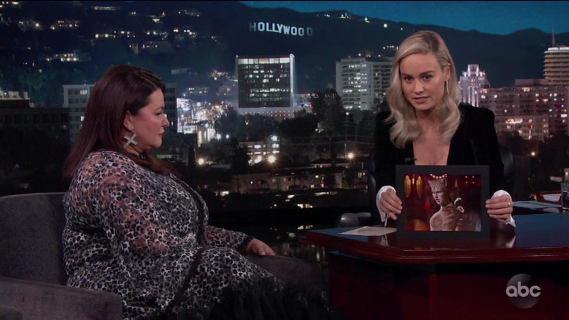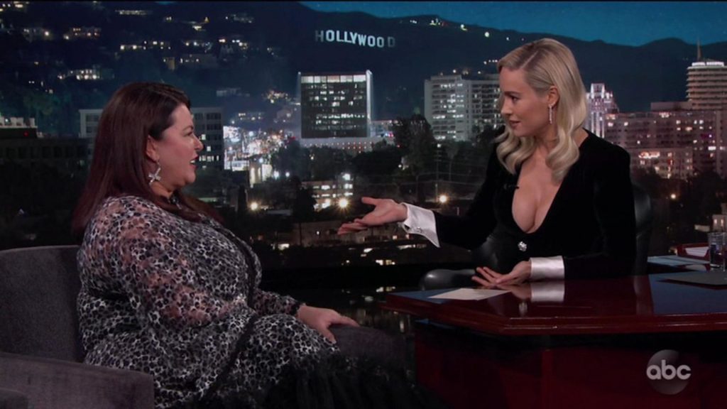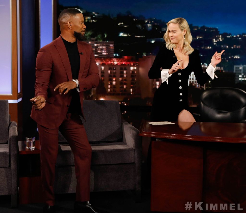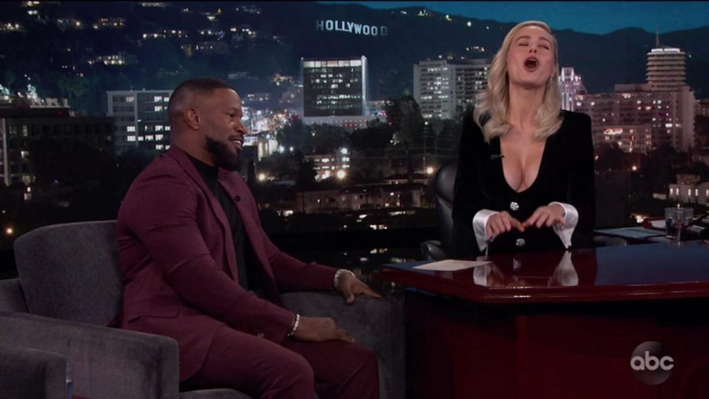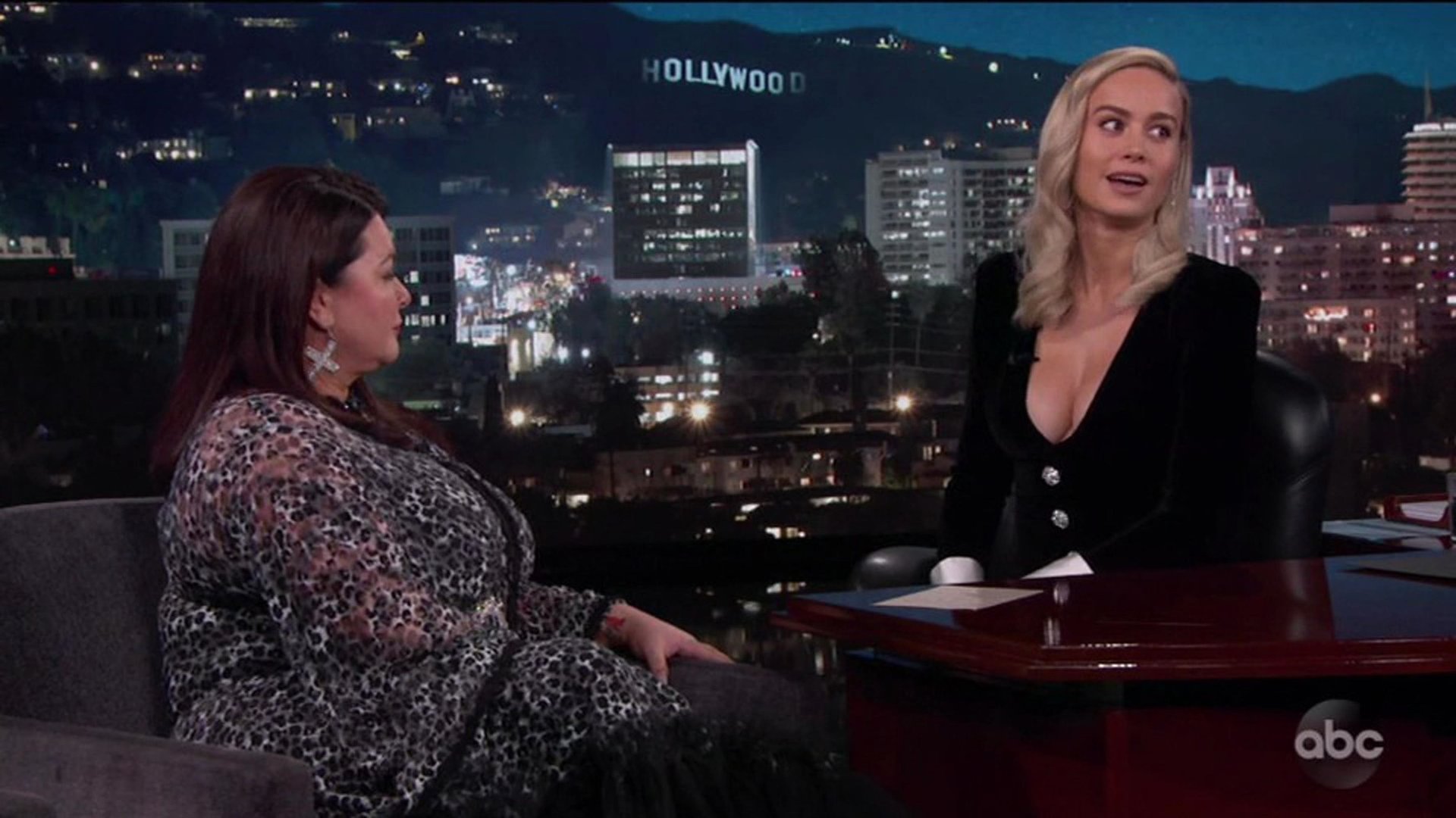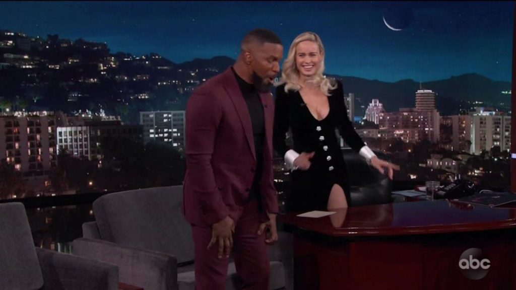 Molly a confirmé que c’était son super pouvoir, ce qui a poussé Brie à pointer sa robe en plaisantant : « Je t’ai facilité la tâche ! Voilà ! » Molly lui a alors dit : « Tu es un 30F, ce qui correspond à un triple D à G mais ce n’est pas ce que tu achètes. » Une Brie stupéfaite a répondu : « Je ne l’achète pas ! » Molly a ajouté : « Tu achètes plutôt des 34D, » ce à quoi Brie a répliqué : « Oh mon dieu ! » Molly lui a ensuite demandé : « C’est ce que tu achètes ? » et la star a confirmé : « Oui ! » Après que Molly s’est plainte que « personne en Amérique ne connaît les tailles de soutien-gorge », Brie a sorti une photo de Taylor Swift dans le nouveau film Cats et a dit : « J’ai un défi pour toi. Quelle est la taille de soutien-gorge de celle-ci ? » Molly a répondu en riant : « Elle est un peu plus petite, elle est D. » Brie, qui avait plaisanté sur le nouveau film Cats dans le monologue d’ouverture de l’émission, a demandé : « Tu prends en compte la fourrure ? » ce à quoi Molly a répondu : « Oh oui. » Également dans l’émission, Brie a interviewé son co-vedette de Just Mercy, Jamie Foxx, qui a aussi commenté son look en lui disant : « Tu es incroyable, tu es magnifique ! »