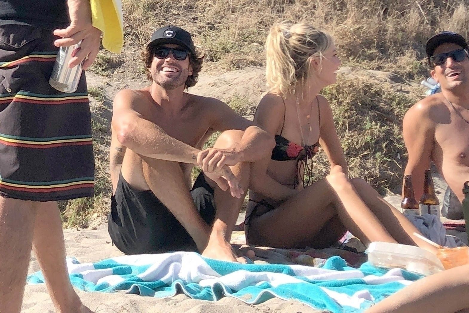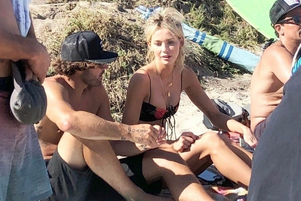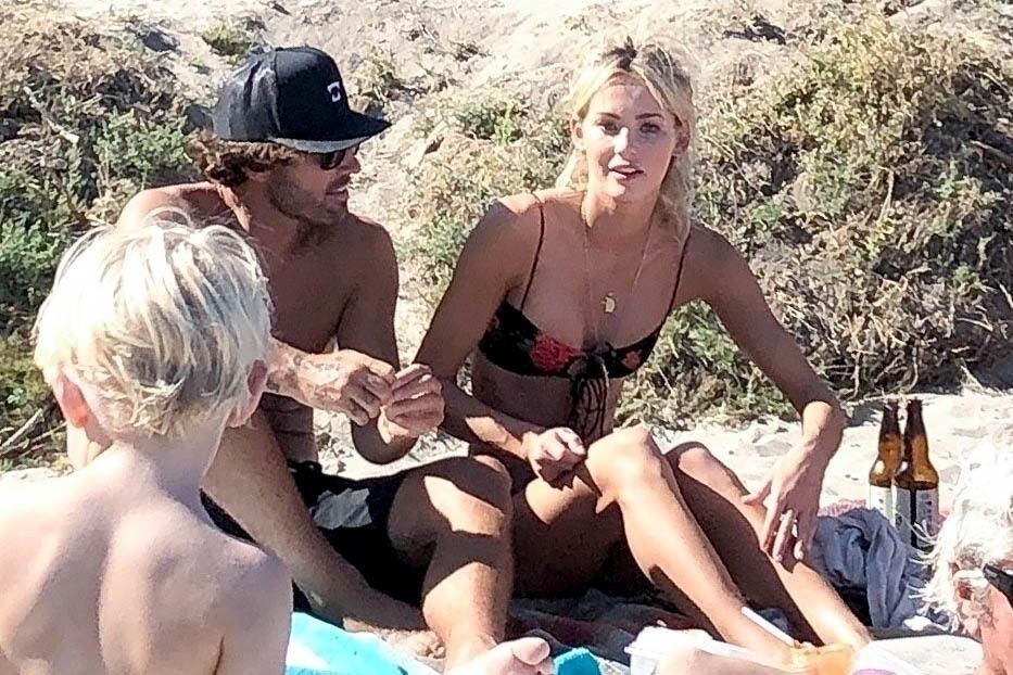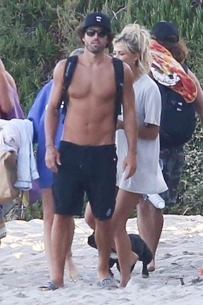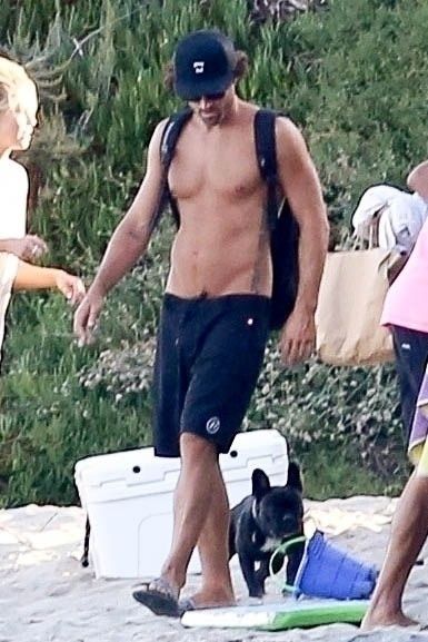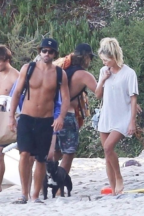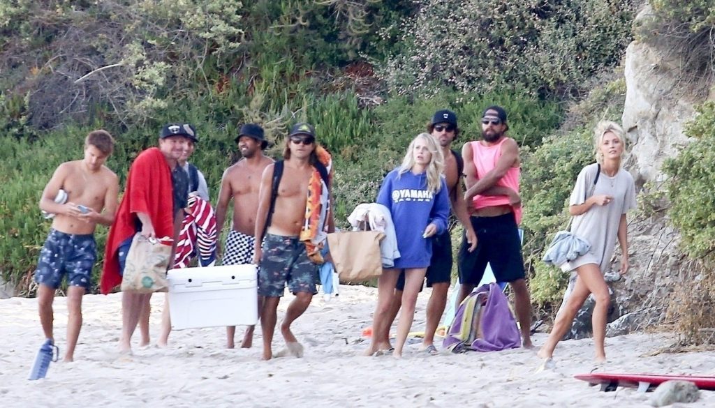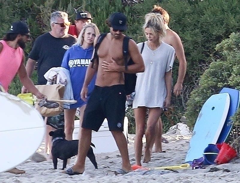 Reality TV Star Brody Jenner passe la journée à se détendre sur la plage avec des amis et une inconnue blonde et brune à Malibu. Le charmant mondain exhibait ses abdos sculptés en marchant torse nu sur la plage avec ses amis.