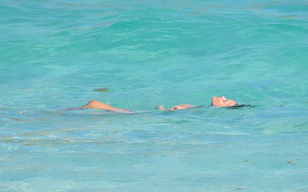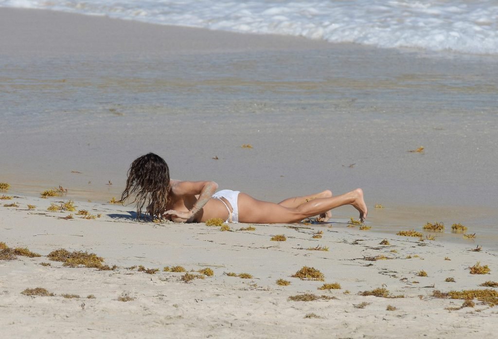 Toutes les photos topless sont prises de côté, évitant peut-être le plan frontal parce que son torse avant n'est pas aussi en forme que son torse arrière.