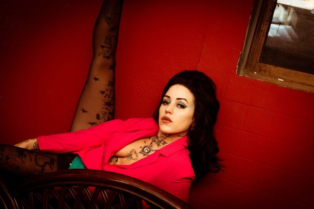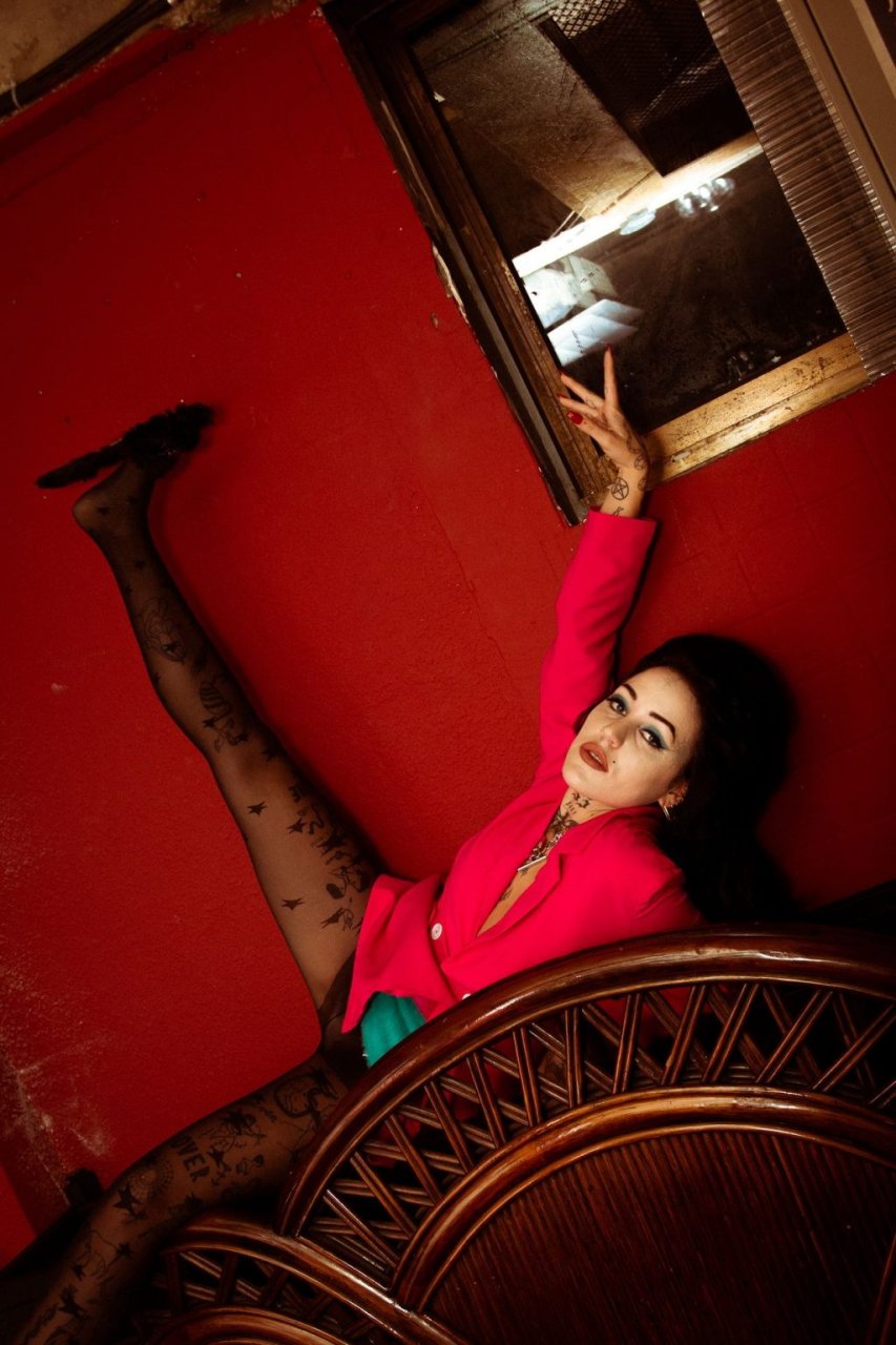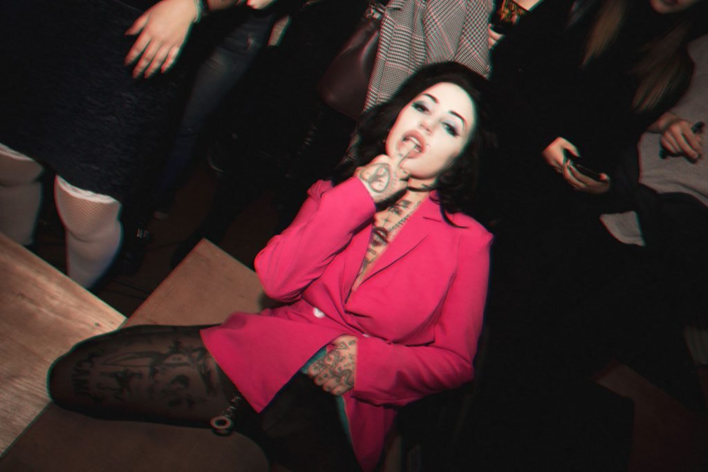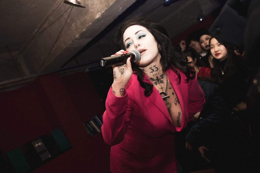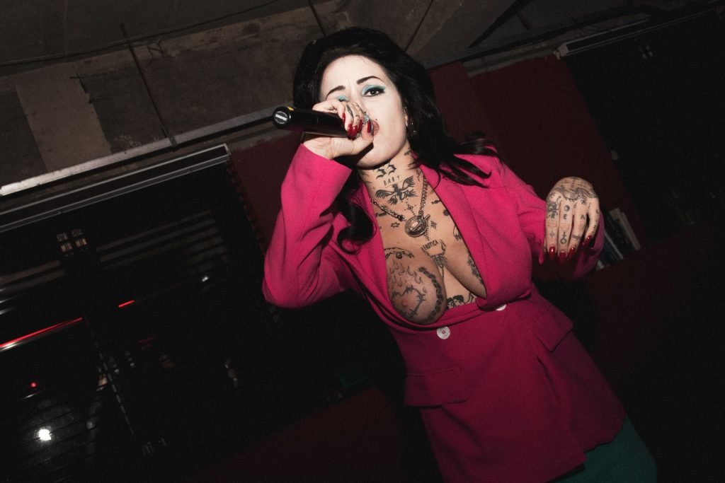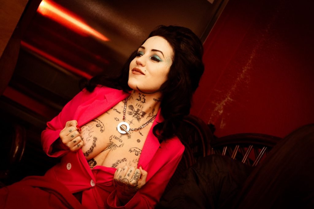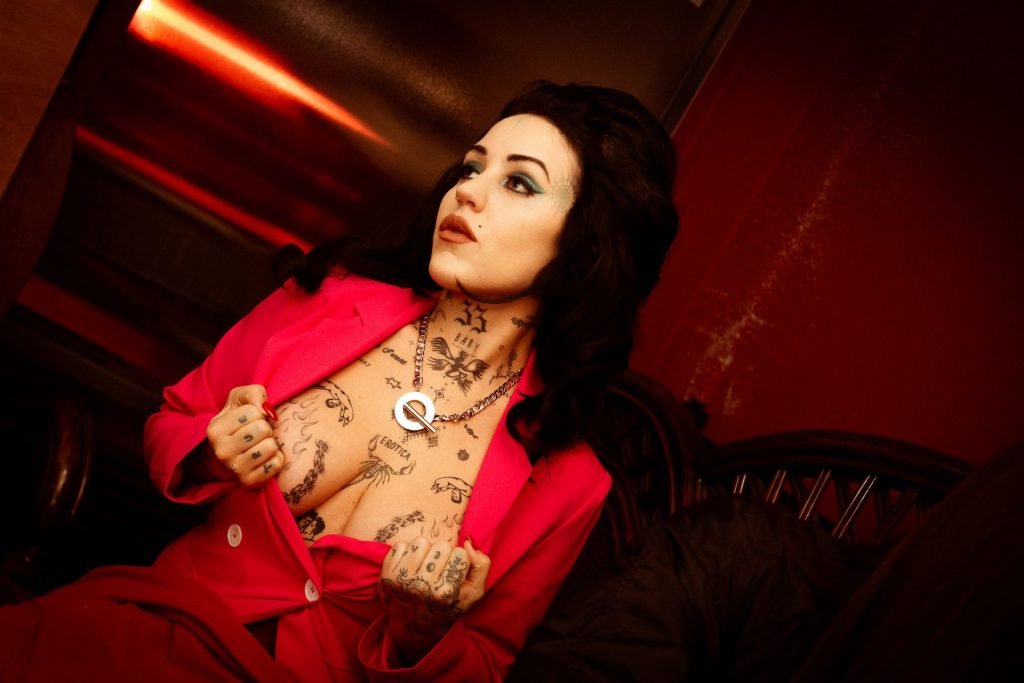 Un artiste à succès et très en vue, sans aucun doute, à en juger par le lieu - un sous-sol - et les légions de fans présents. Quant à la poitrine, je ne peux pas dire à quoi elle ressemble ; les tatouages font vraiment un bon travail pour la cacher.