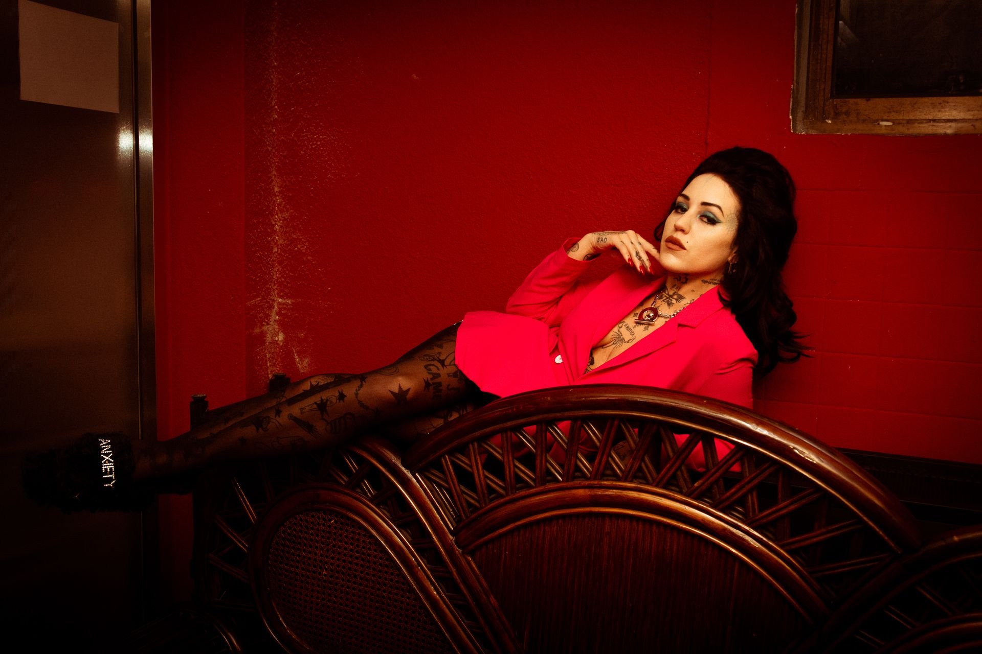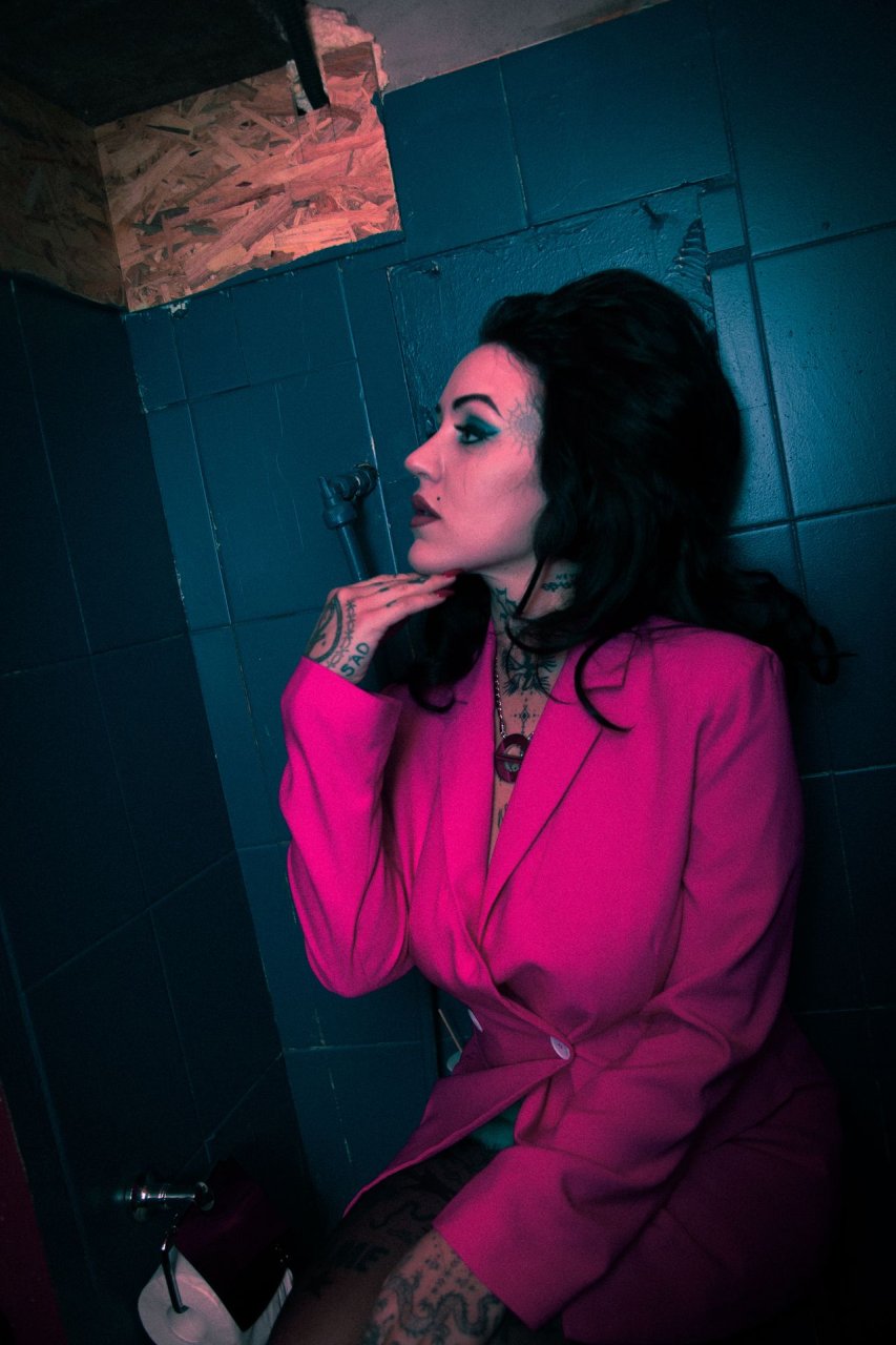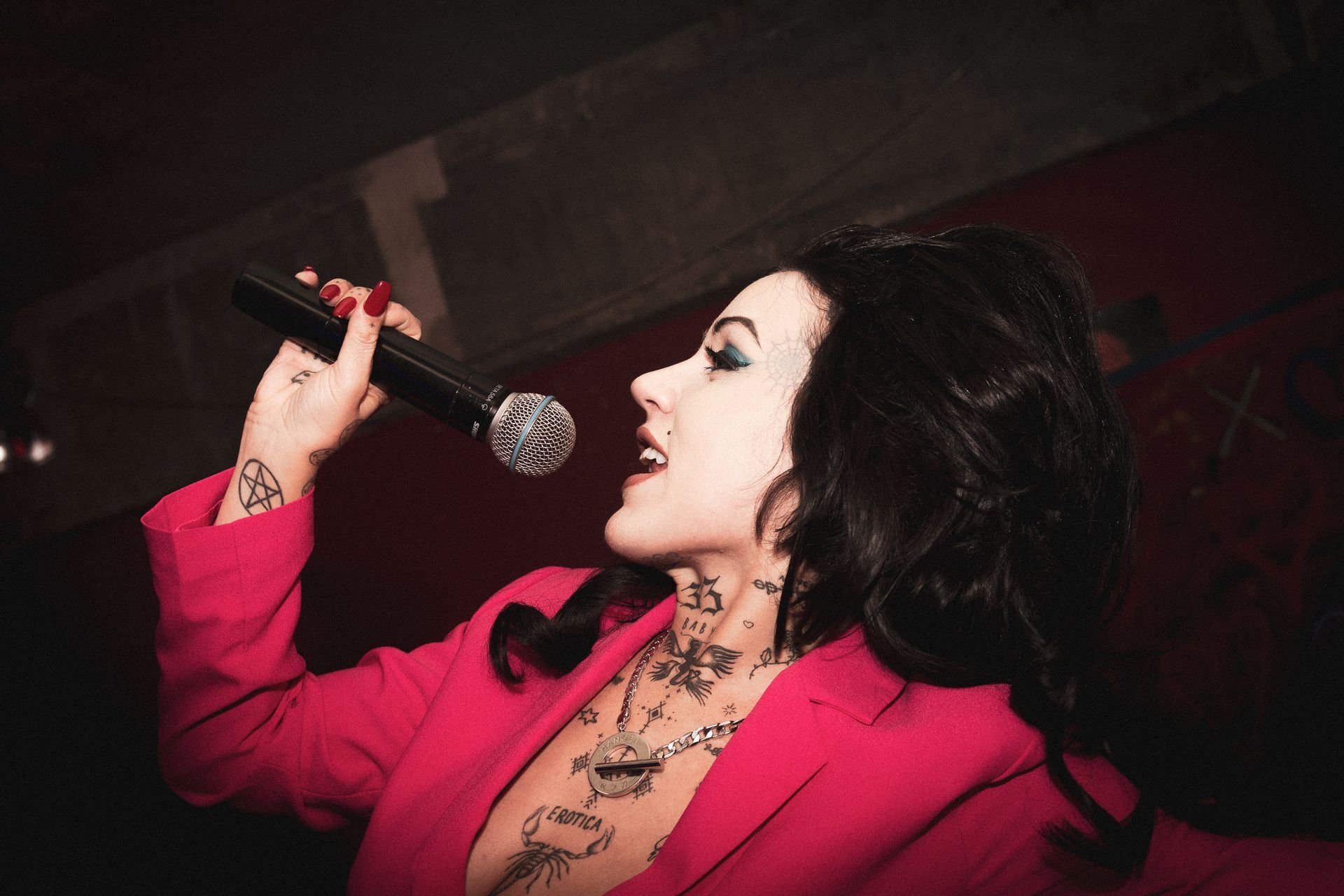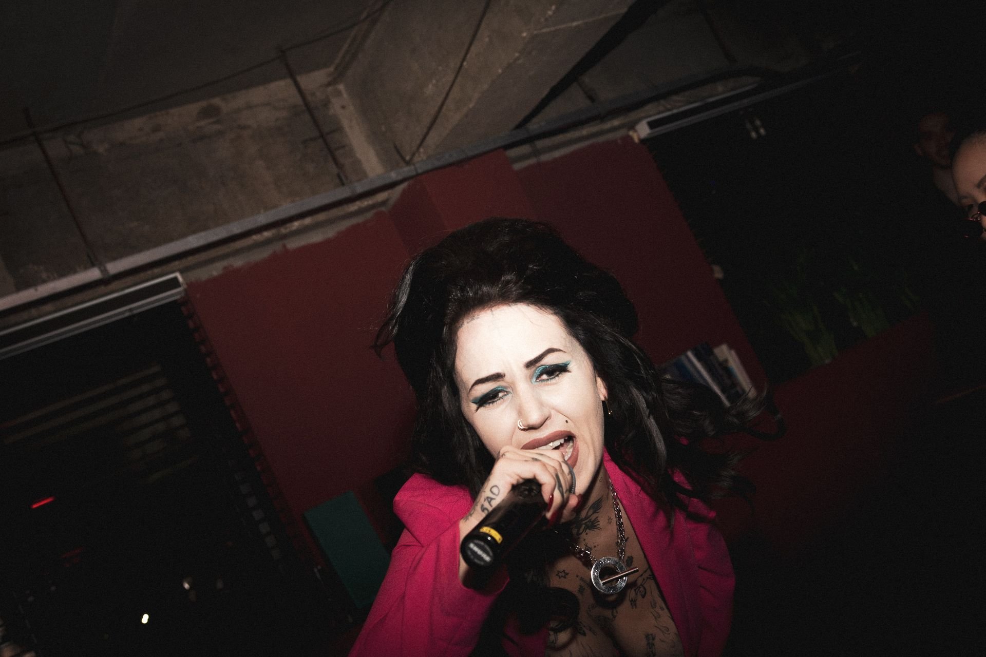 Un artiste à succès et très en vue, sans aucun doute, à en juger par le lieu - un sous-sol - et les légions de fans présents. Quant à la poitrine, je ne peux pas dire à quoi elle ressemble ; les tatouages font vraiment un bon travail pour la cacher.