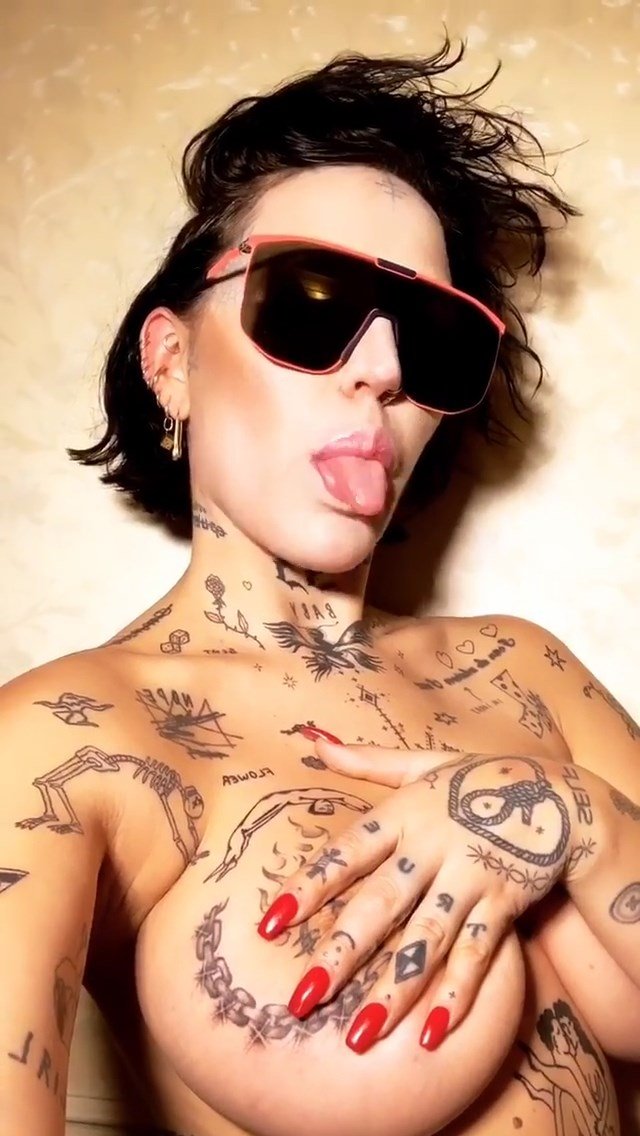 La chanteuse/mannequin tatouée Brooke Candy est sexy en montrant ses seins dans les stories Instagram (2018). C’est une salope !