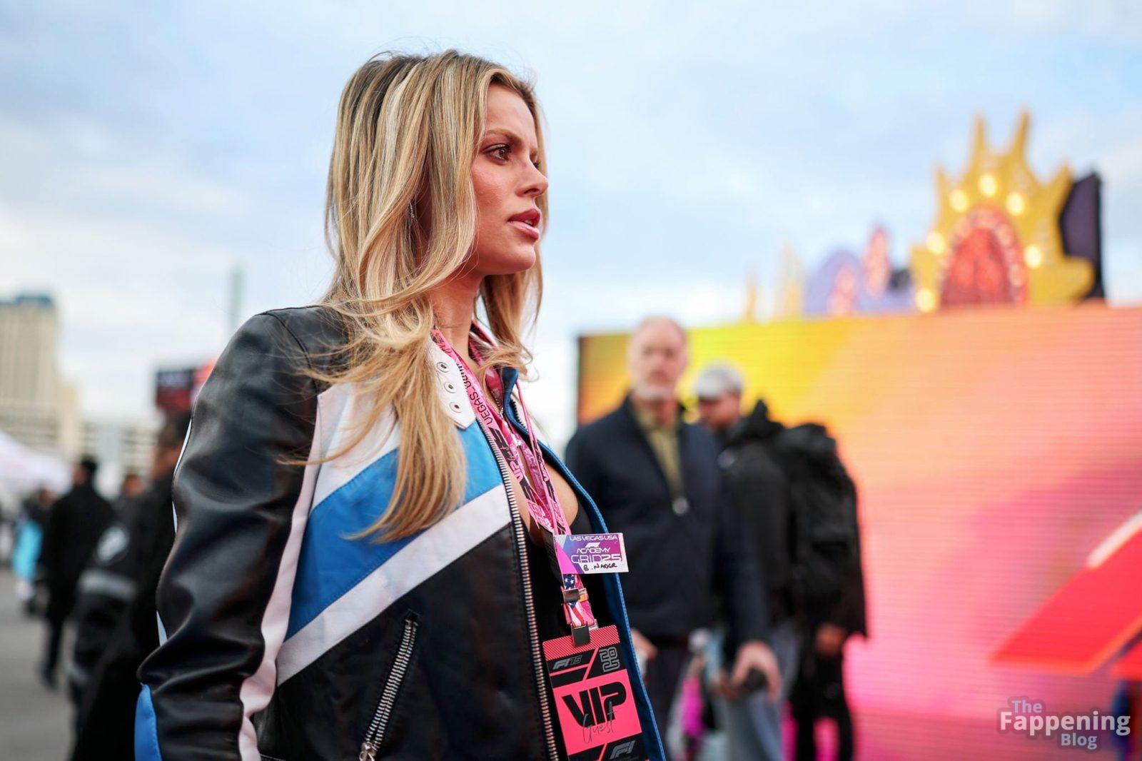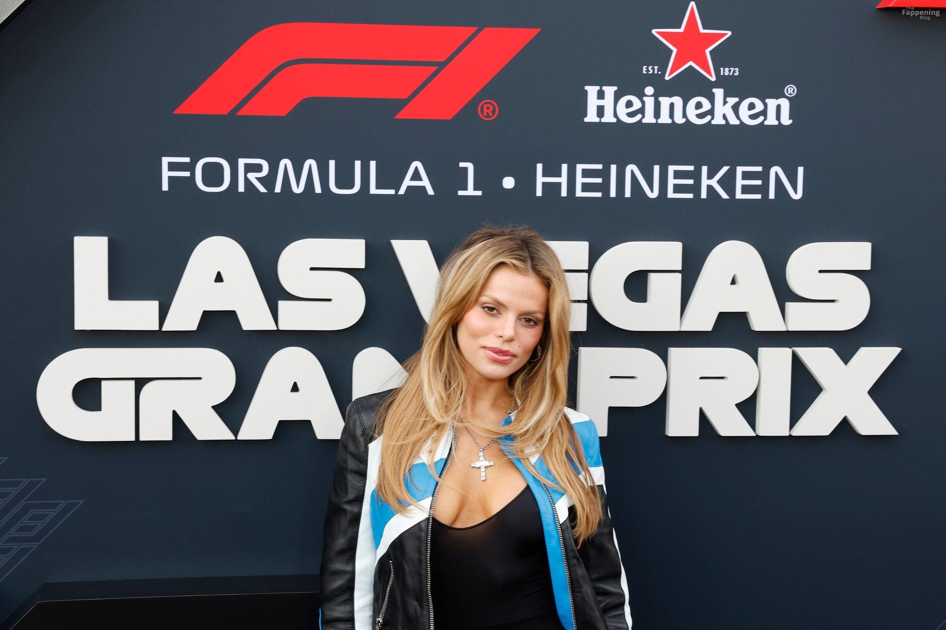 Mannequin et actrice, Brooks Nader renonce au soutien-gorge dans un body transparent lors du Grand Prix de Las Vegas au circuit du Strip de Las Vegas.