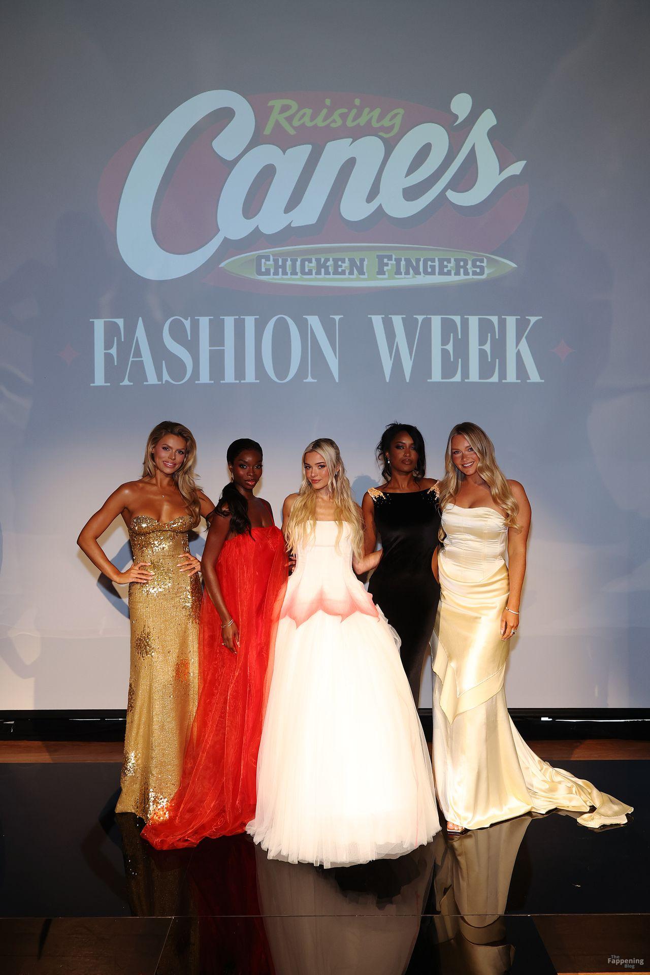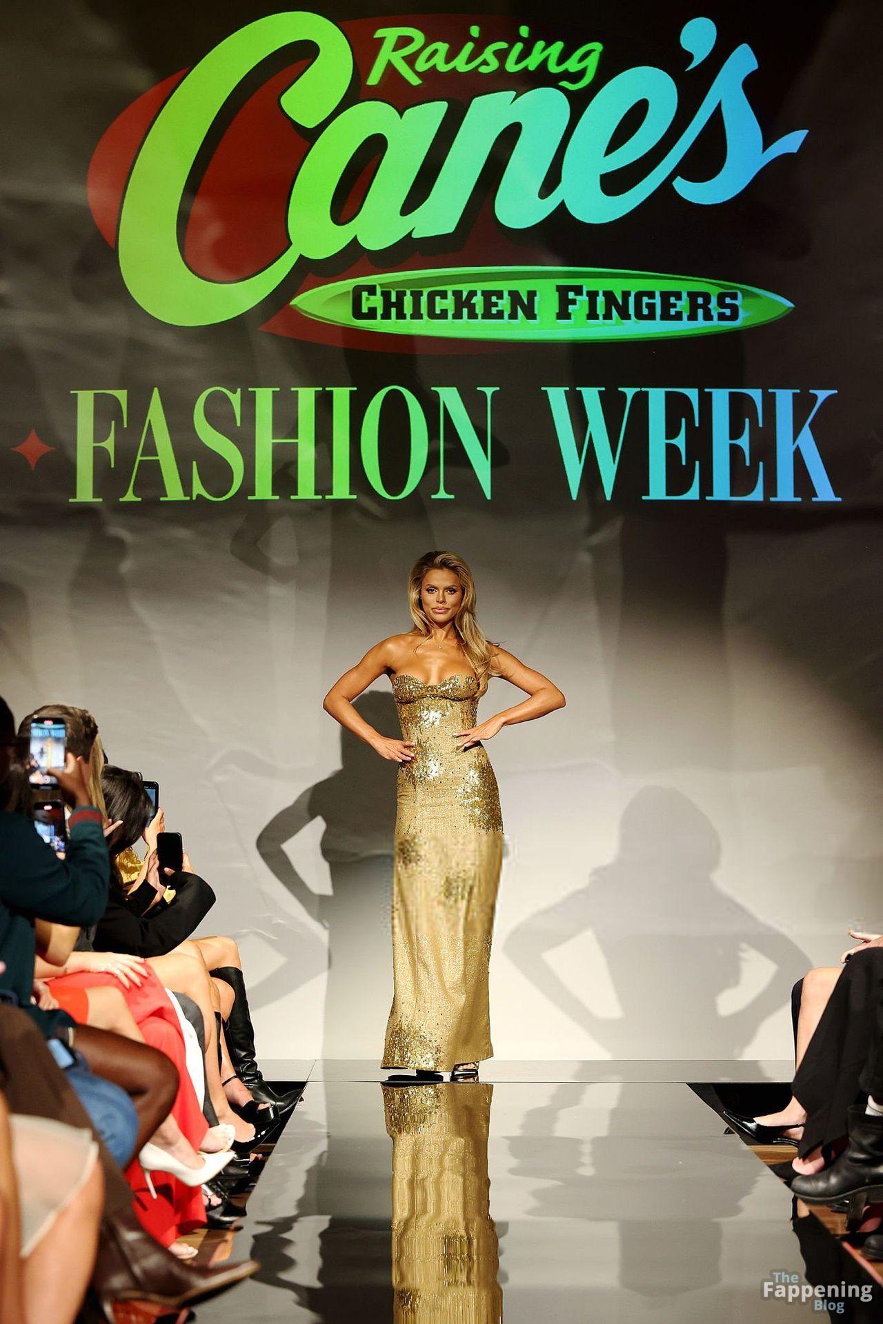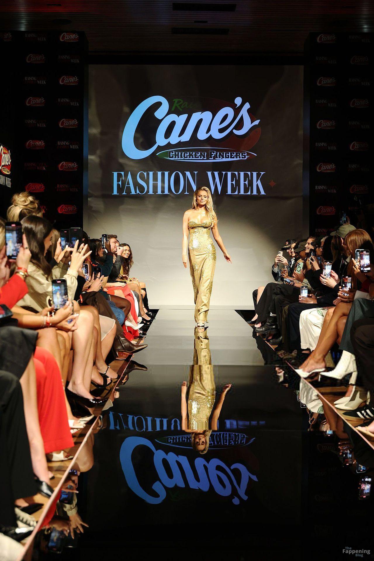 Brooks Nader montrait un décolleté impressionnant dans une robe dorée sans bretelles au défilé de mode Raisin’ Cane’s au Standard High Line à New York.