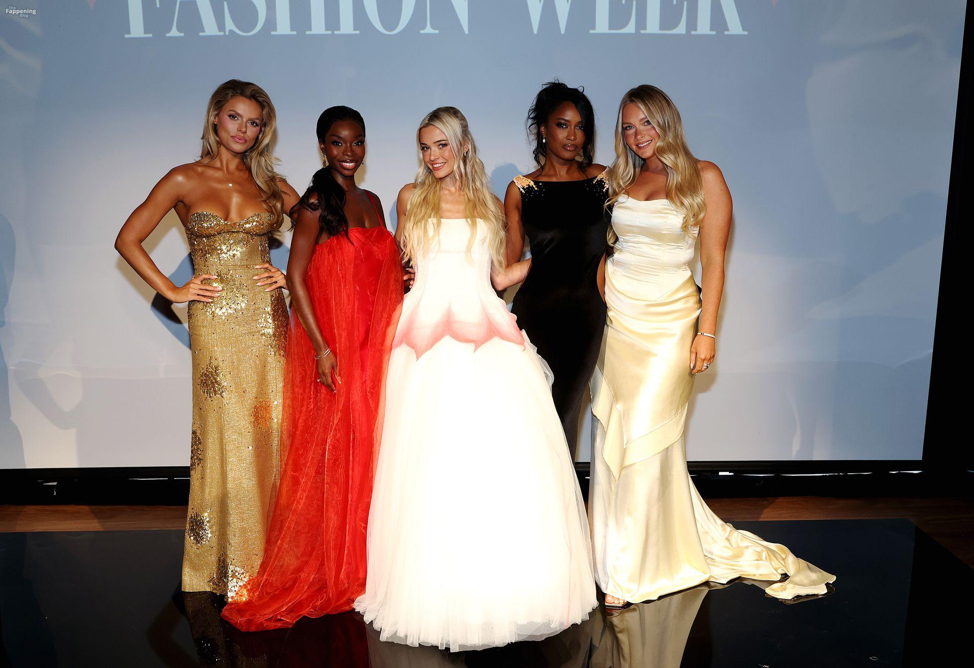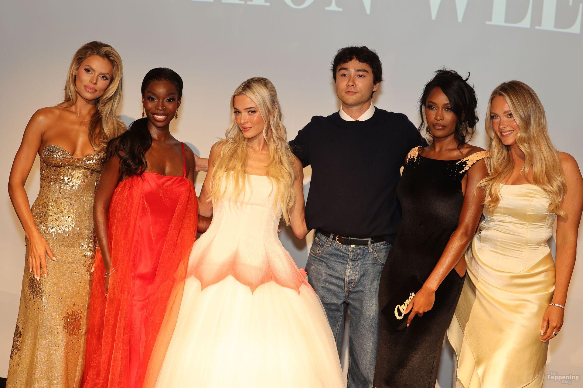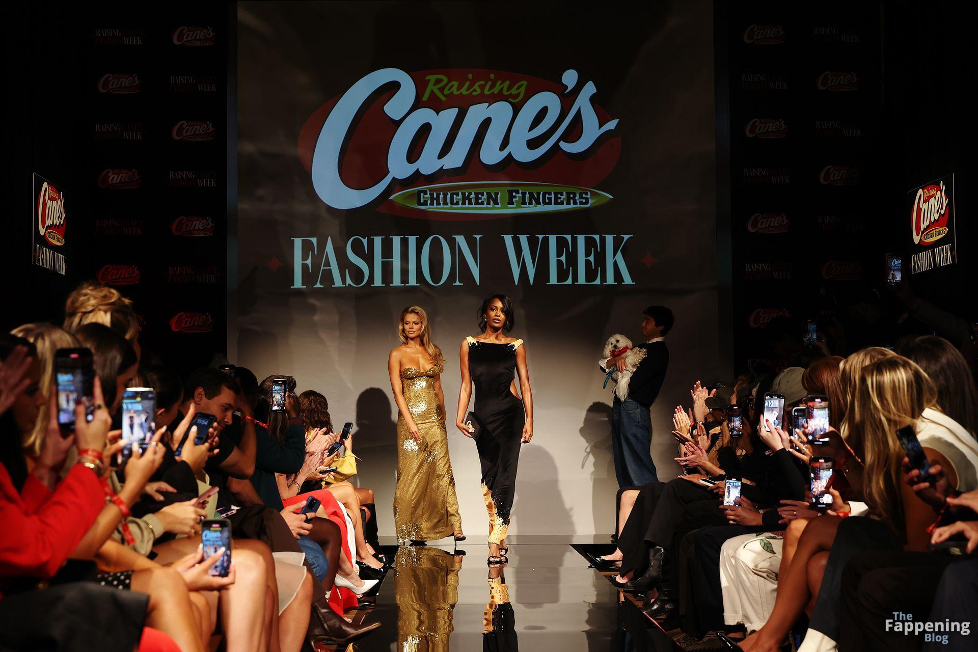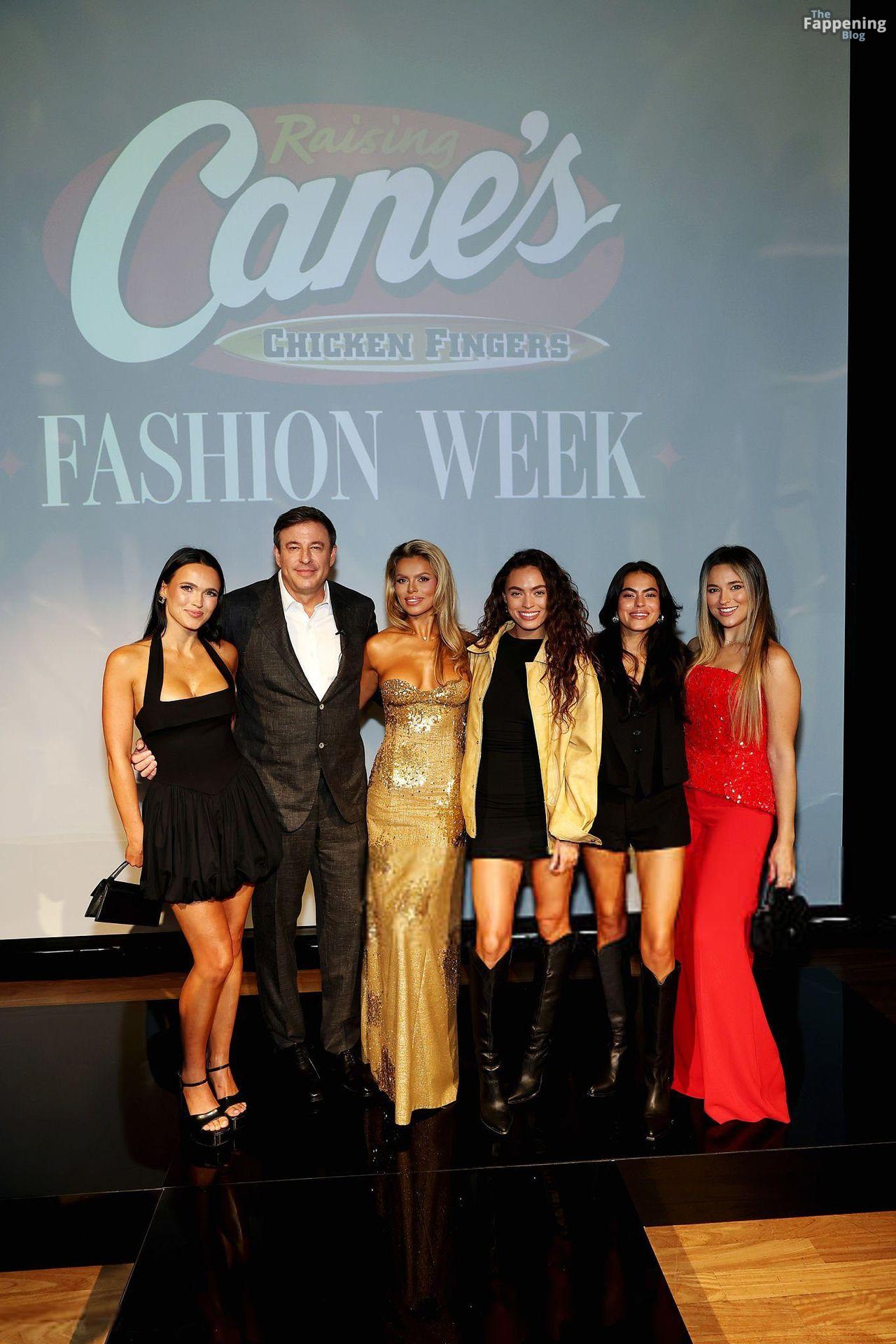Brooks Nader montrait un décolleté impressionnant dans une robe dorée sans bretelles au défilé de mode Raisin’ Cane’s au Standard High Line à New York.