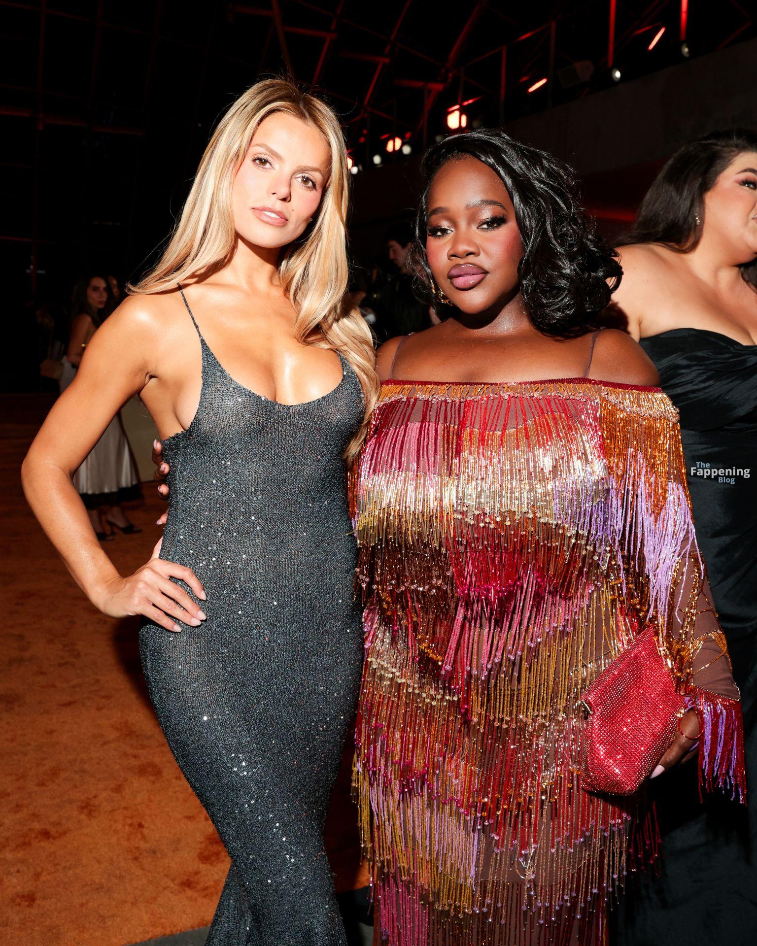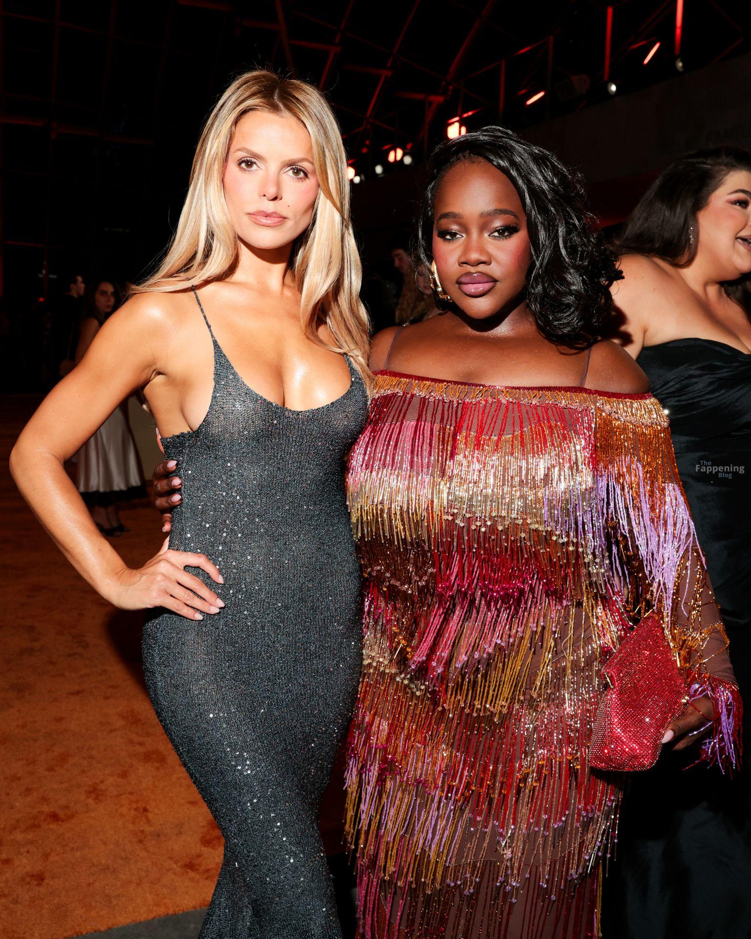 Brooks Nader porte une robe en maille moulante sans soutien-gorge alors qu’elle assiste à l’événement Clarins Célèbre l’Énergie Extra-Fermeté avec La Nuit de l’Extra au Dolby Terrace au Academy Museum of Motion Pictures à Los Angeles, Californie.