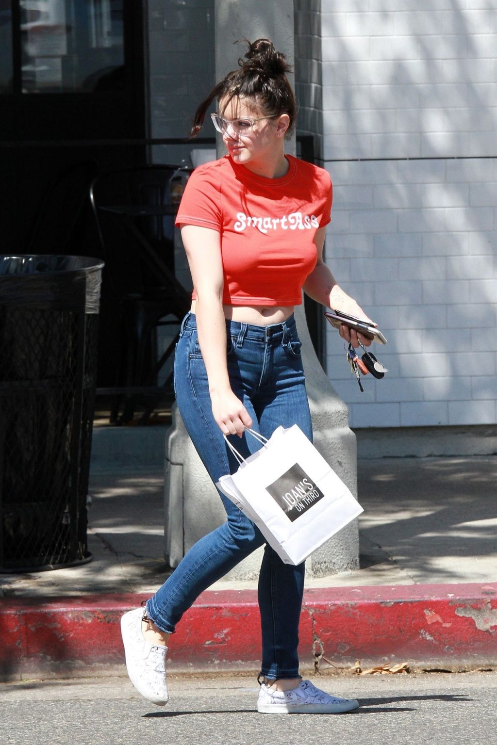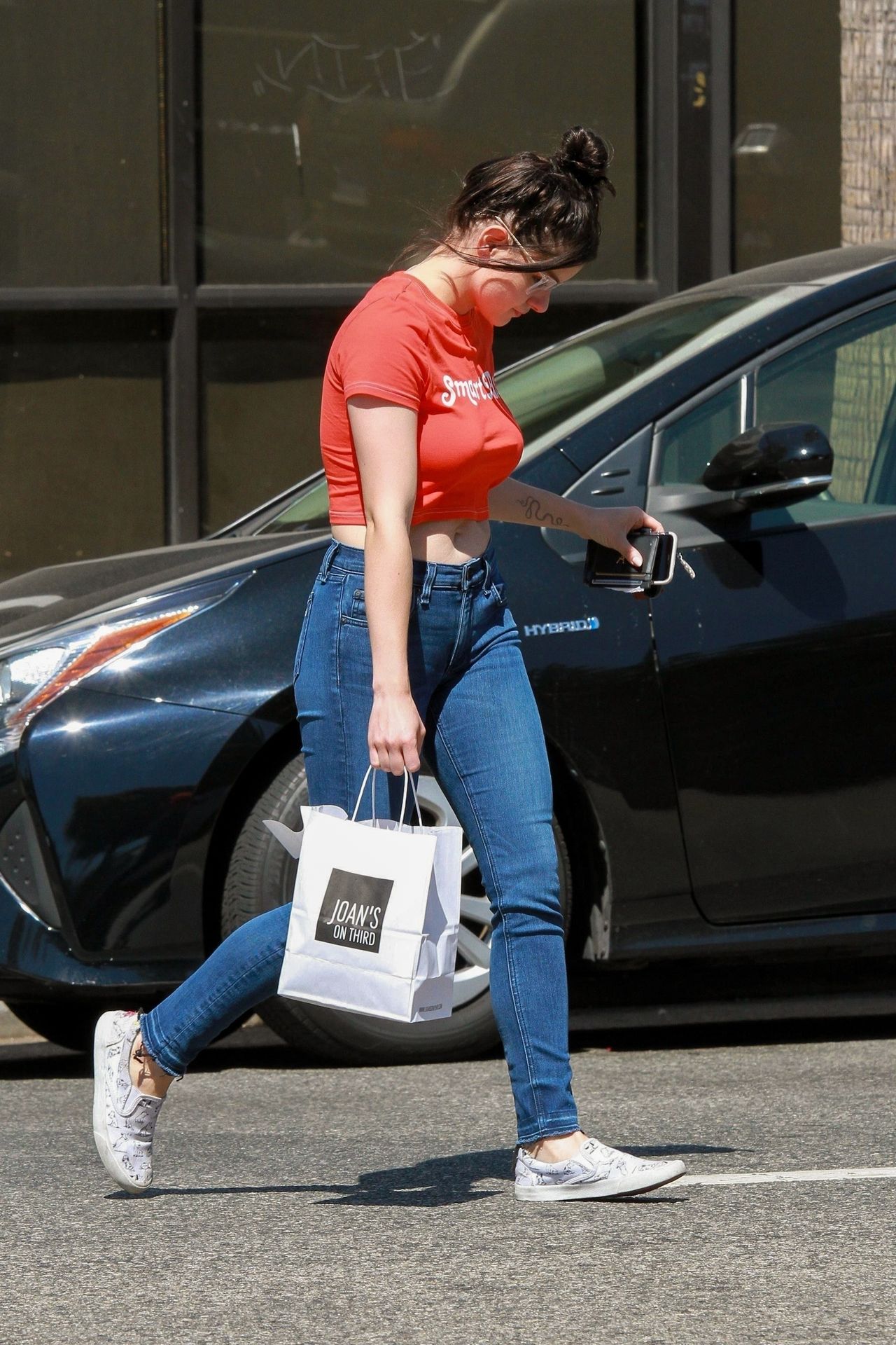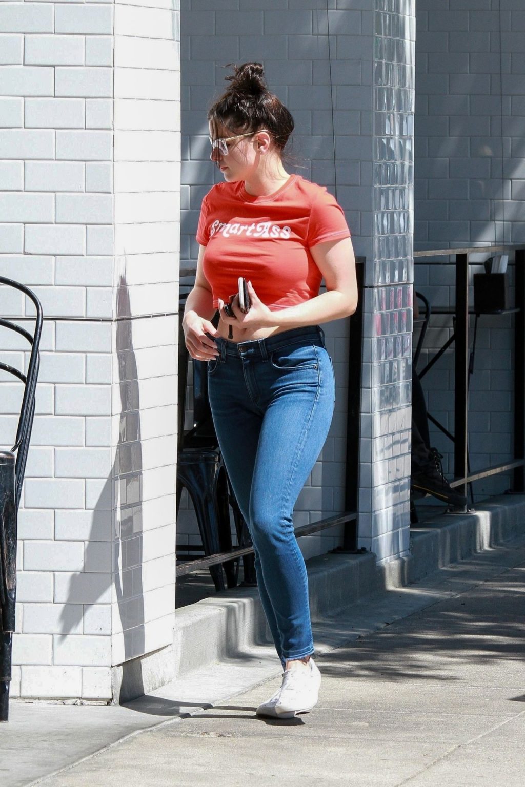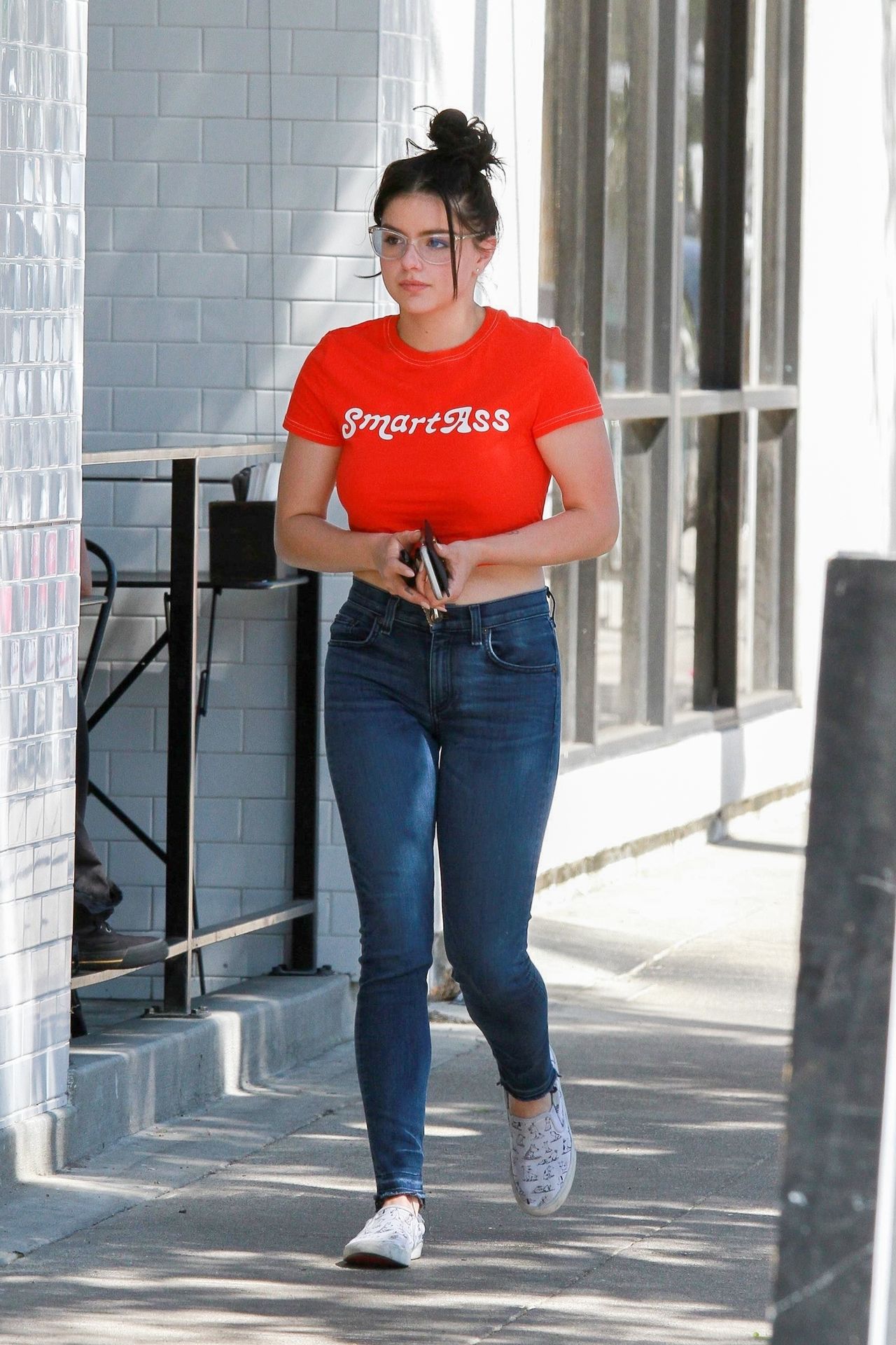 Ariel Winter a l’air mignonne et décontractée dans un crop top rouge sur lequel est écrit « Smartass », et un jean moulant alors qu’elle prend un déjeuner à emporter chez Joan’s On Third à Los Angeles, 21/08/2019.