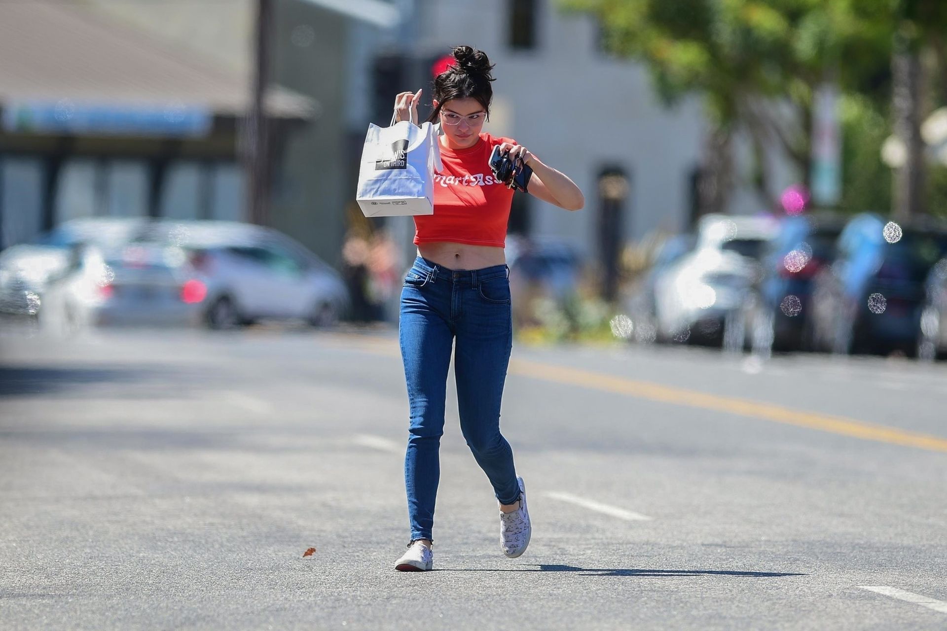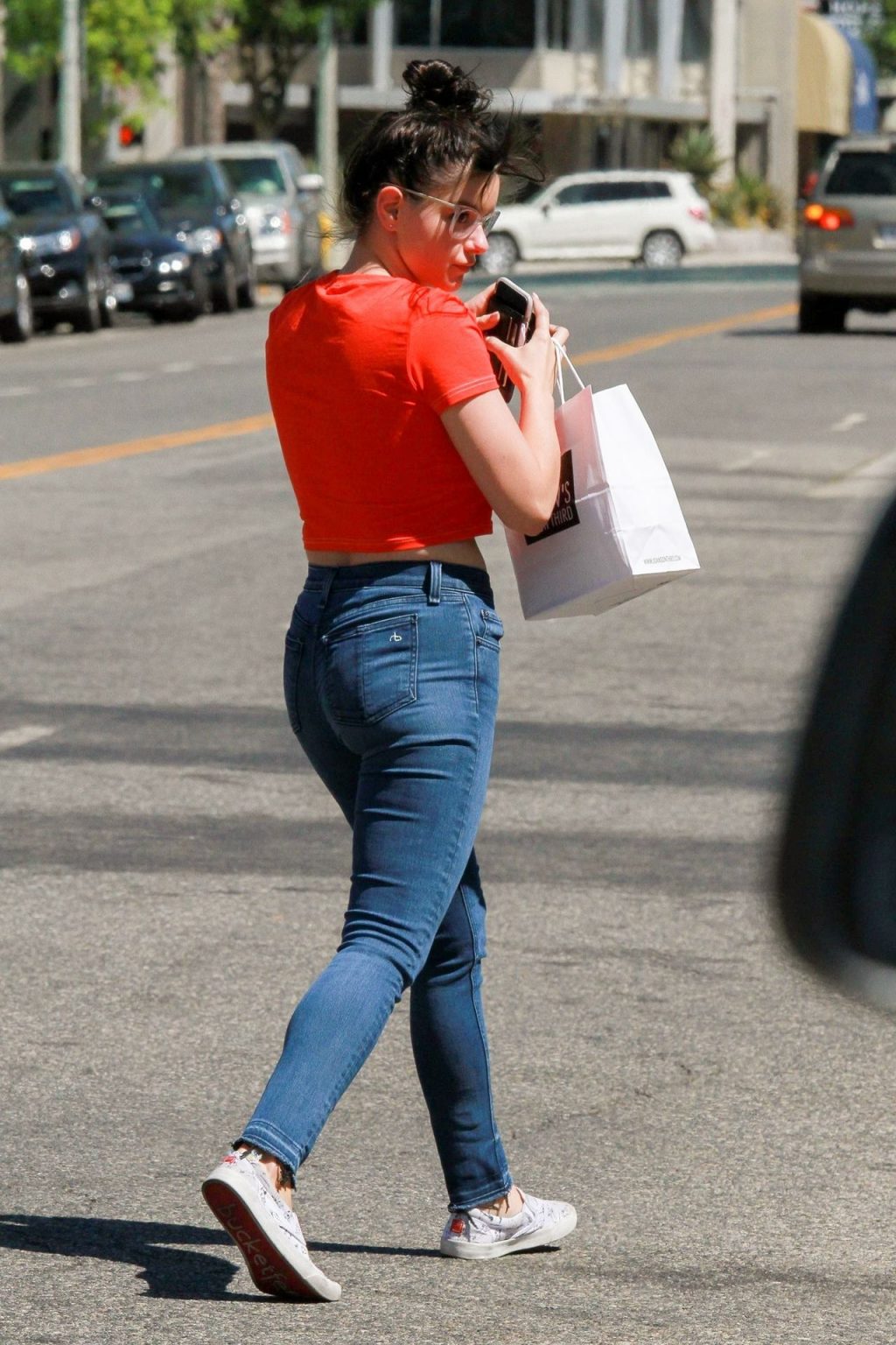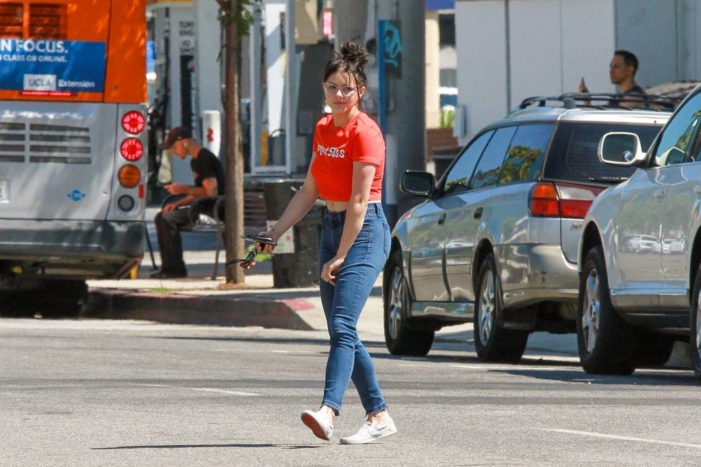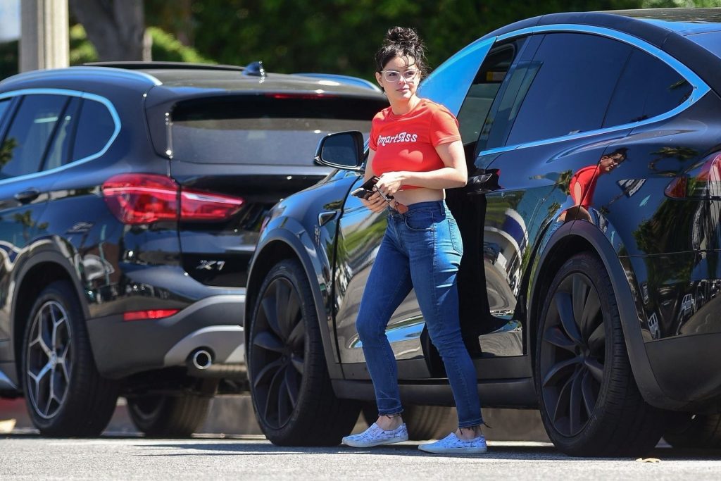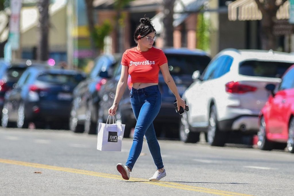 Ariel Winter a l’air mignonne et décontractée dans un crop top rouge sur lequel est écrit « Smartass », et un jean moulant alors qu’elle prend un déjeuner à emporter chez Joan’s On Third à Los Angeles, 21/08/2019.