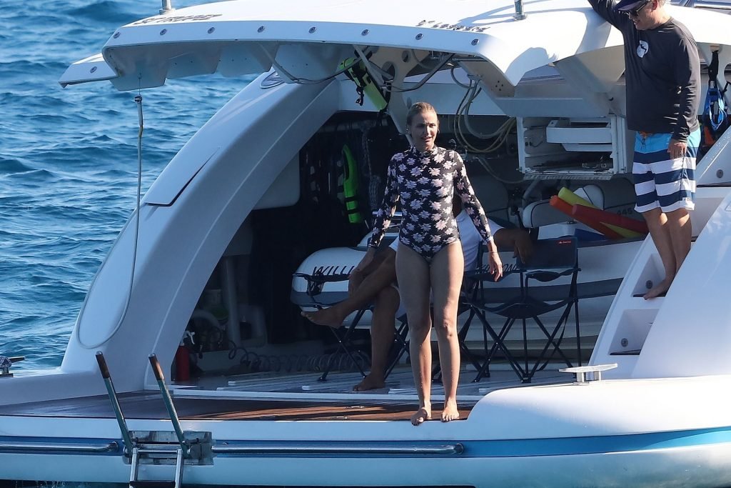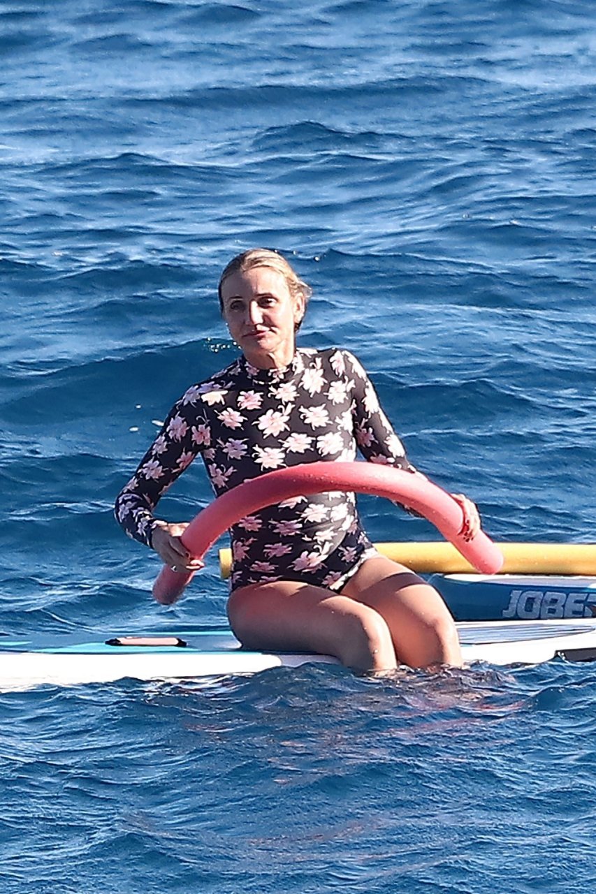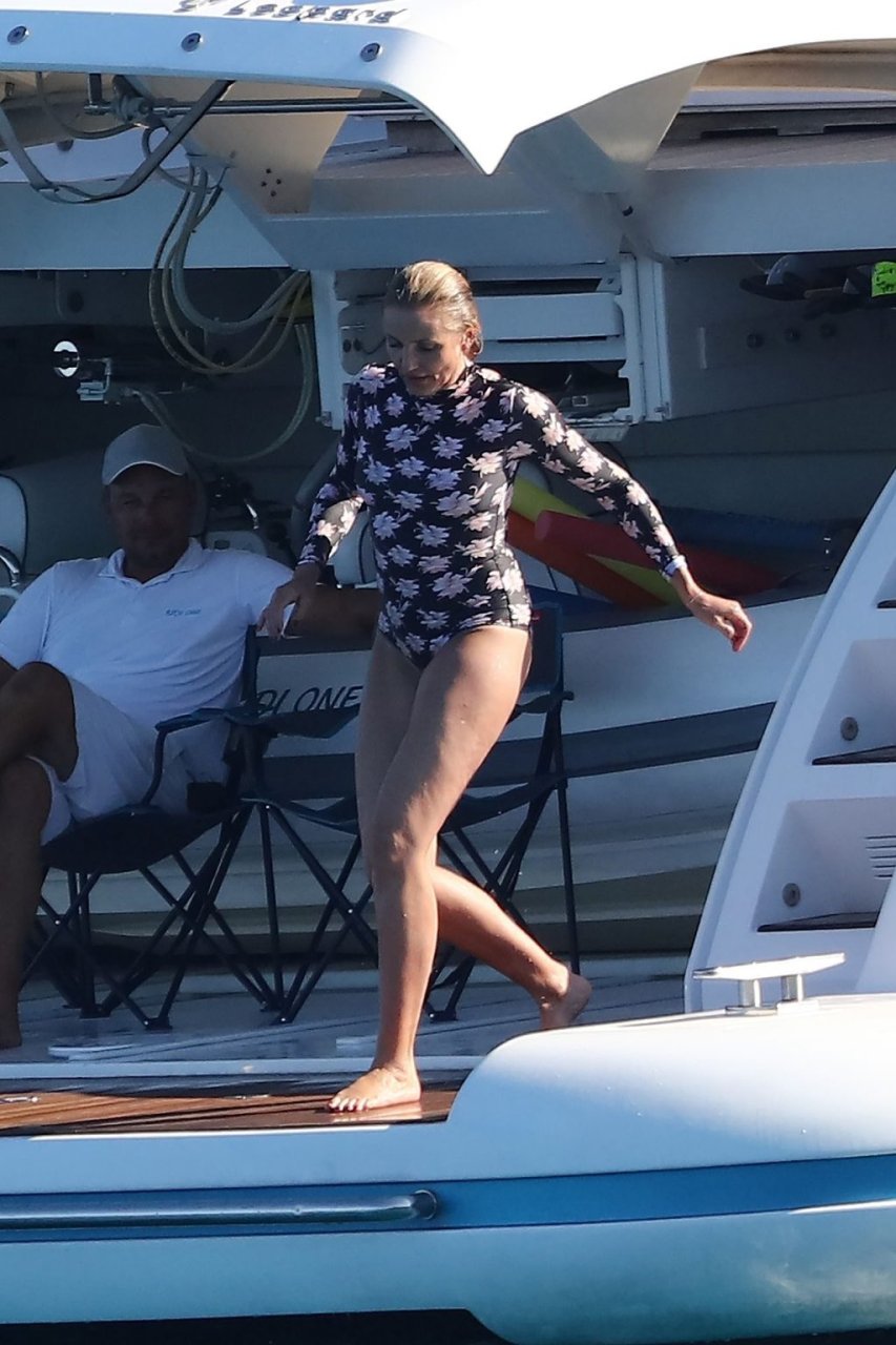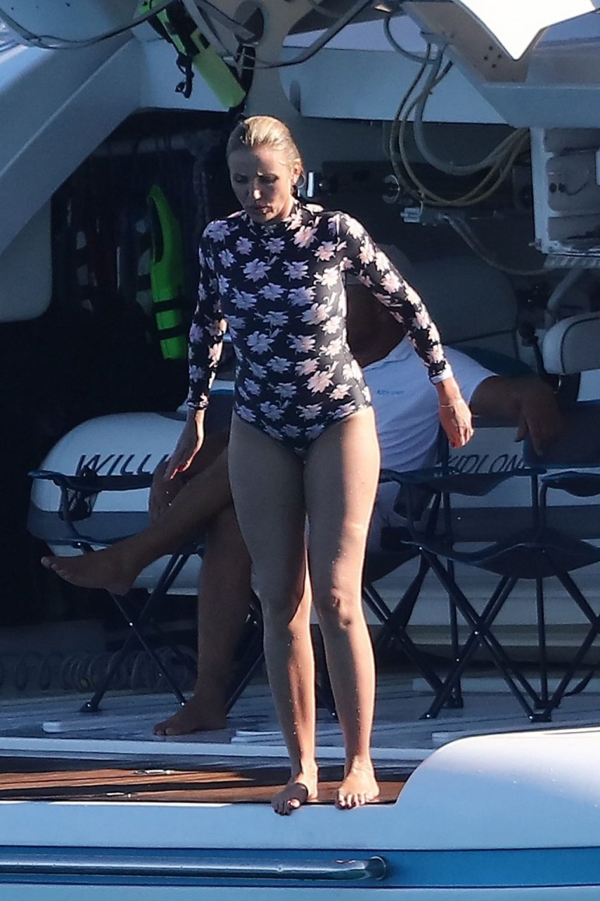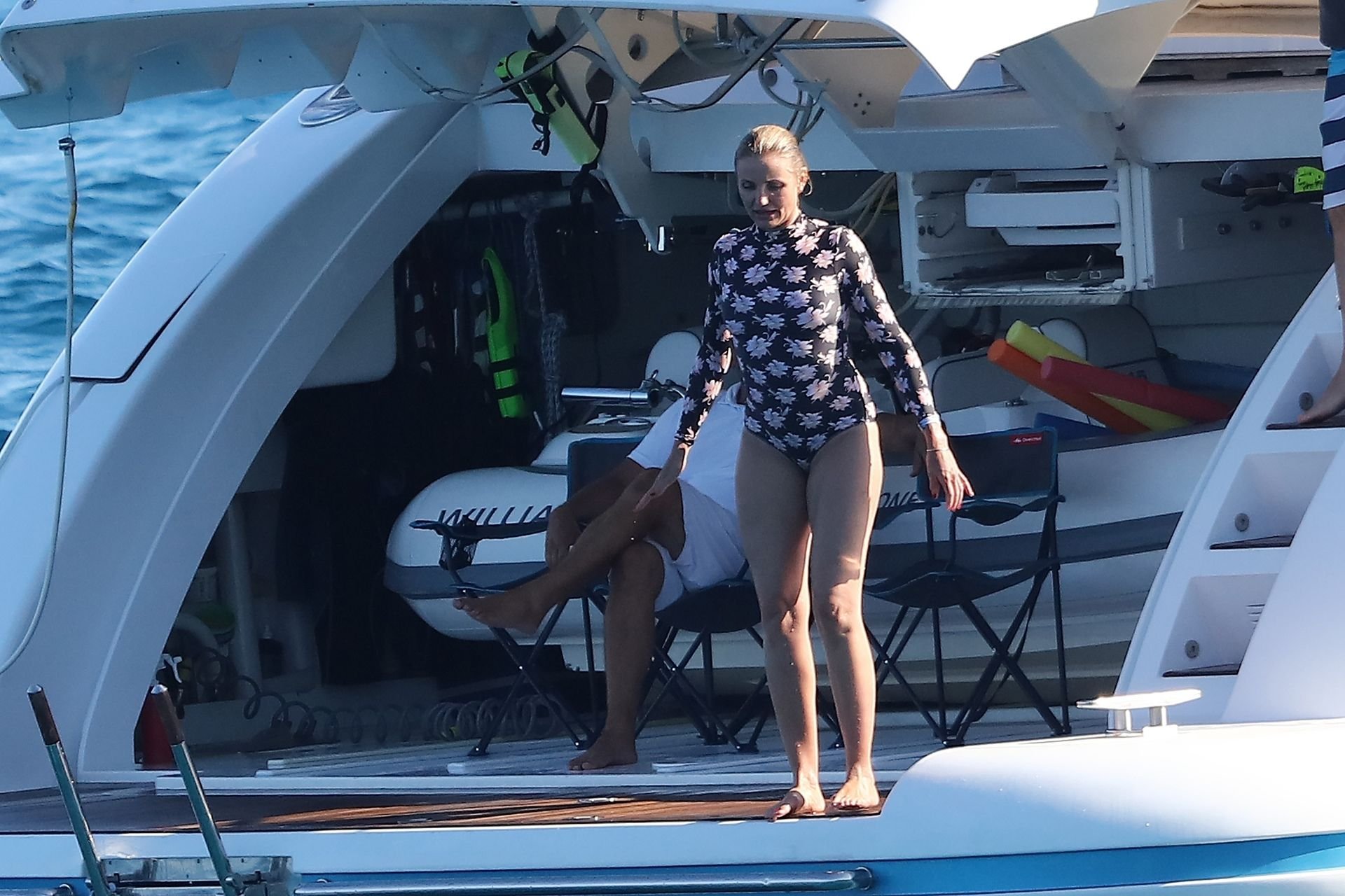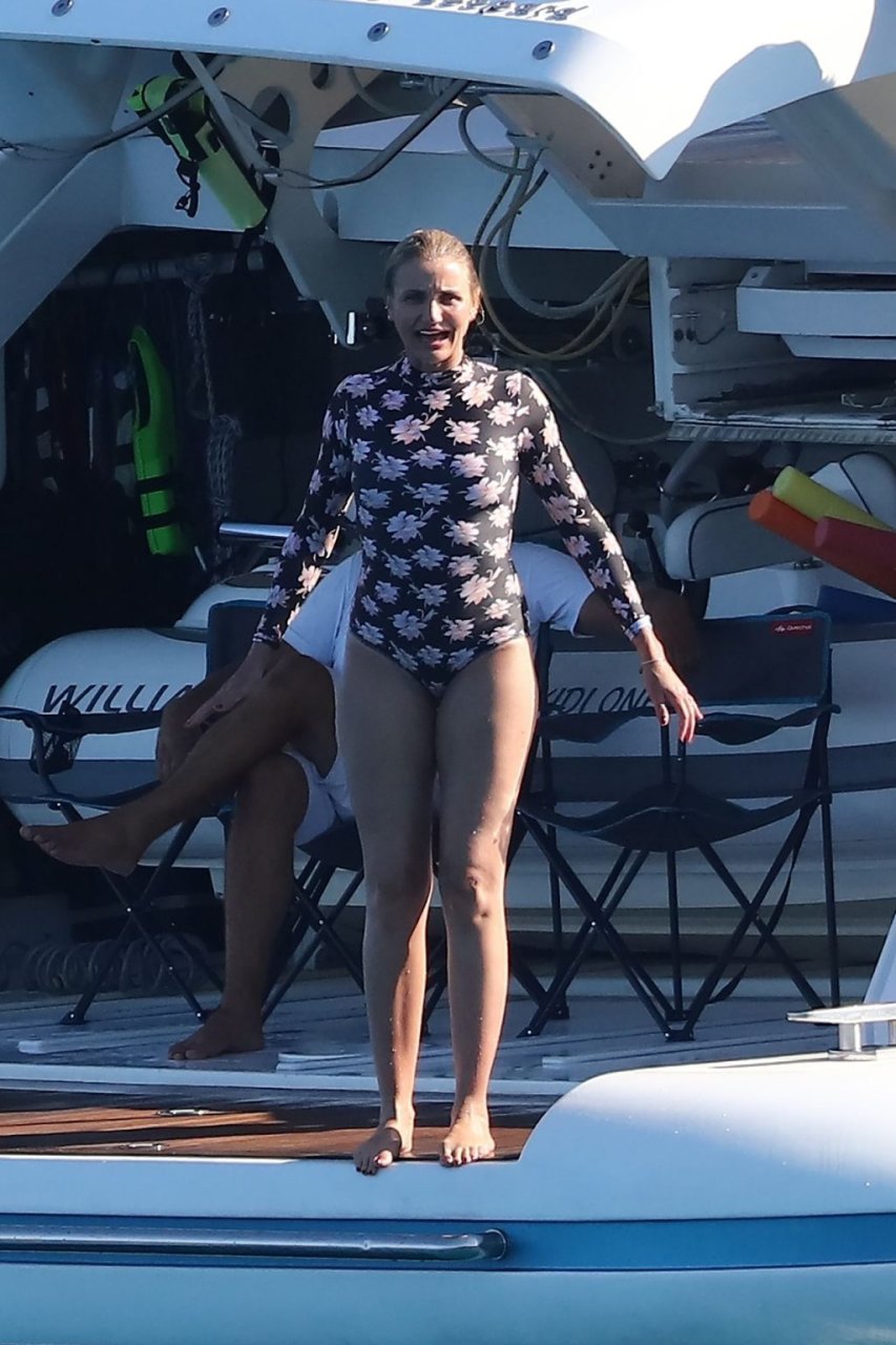 Cameron Diaz et son mari Benji Madden profitent au maximum de leurs vacances à Saint-Tropez, 08/08/2019. La star de Charlie’s Angels a été vue en train de plonger dans la Méditerranée dans un maillot une pièce fleuri qui mettait en valeur son corps fantastique.
