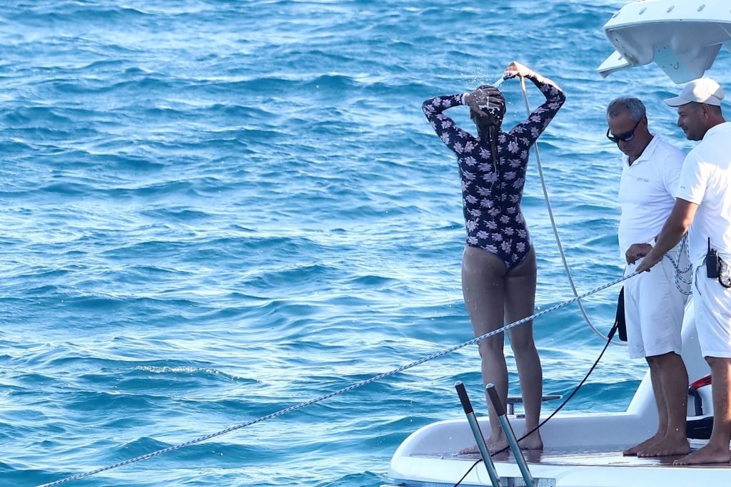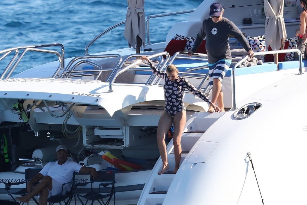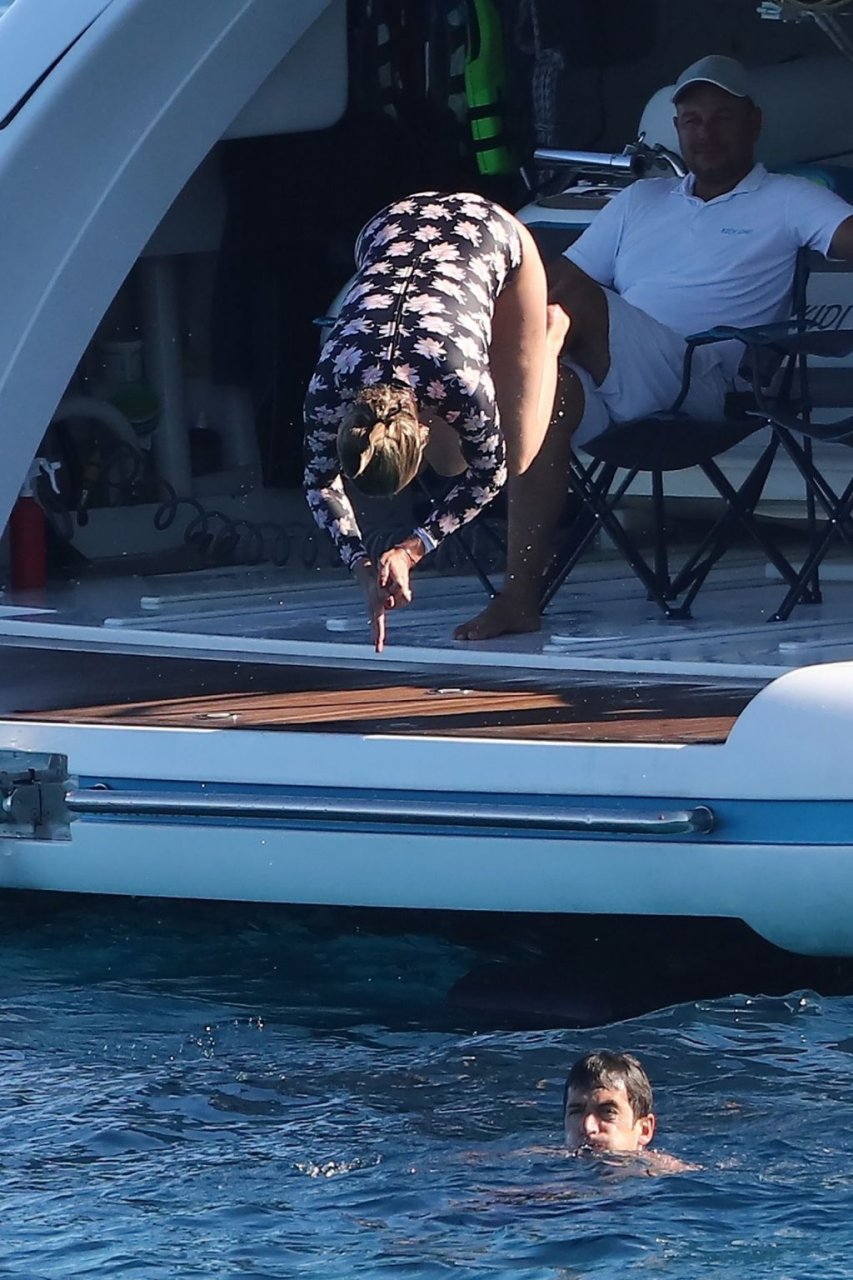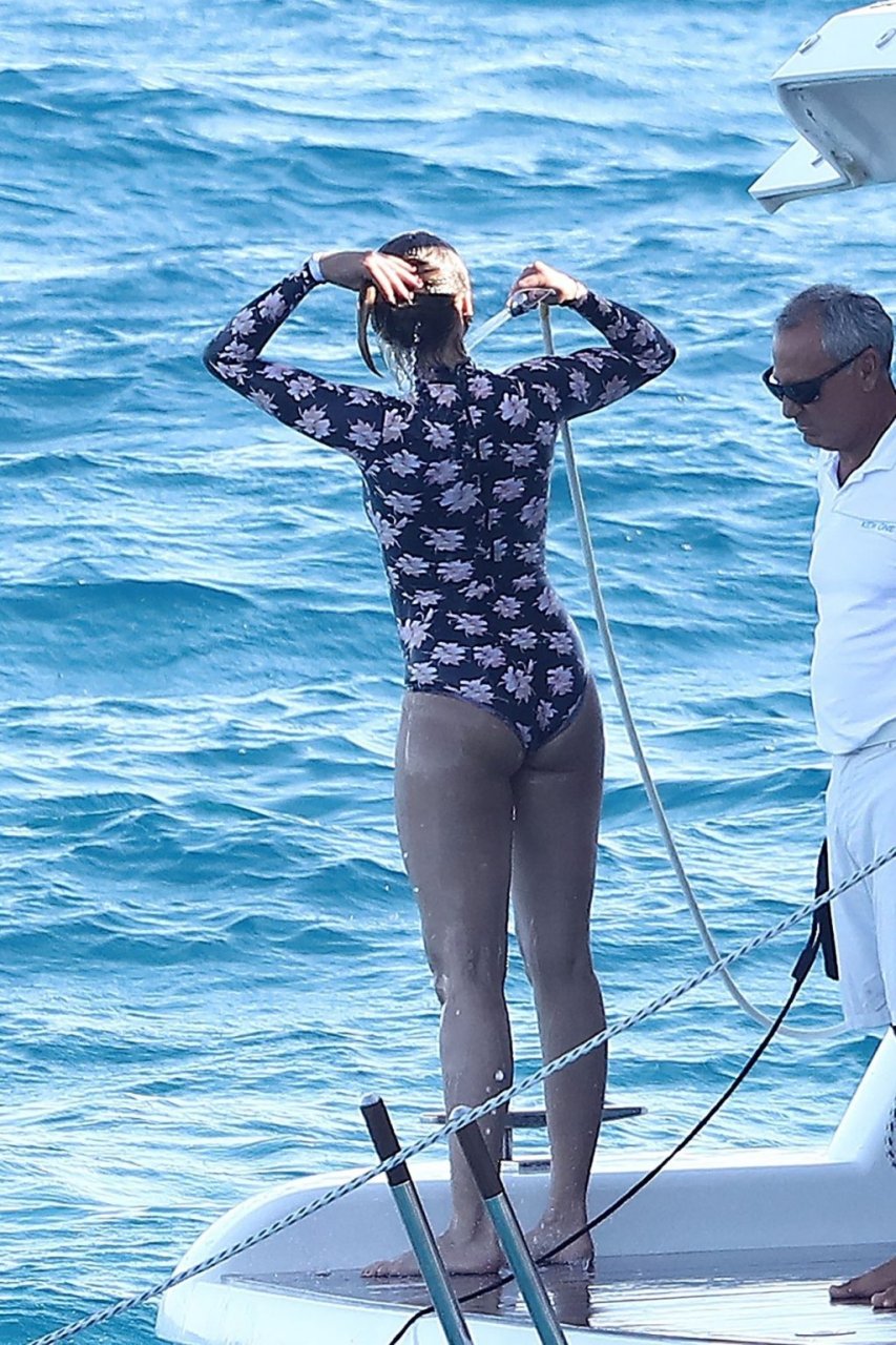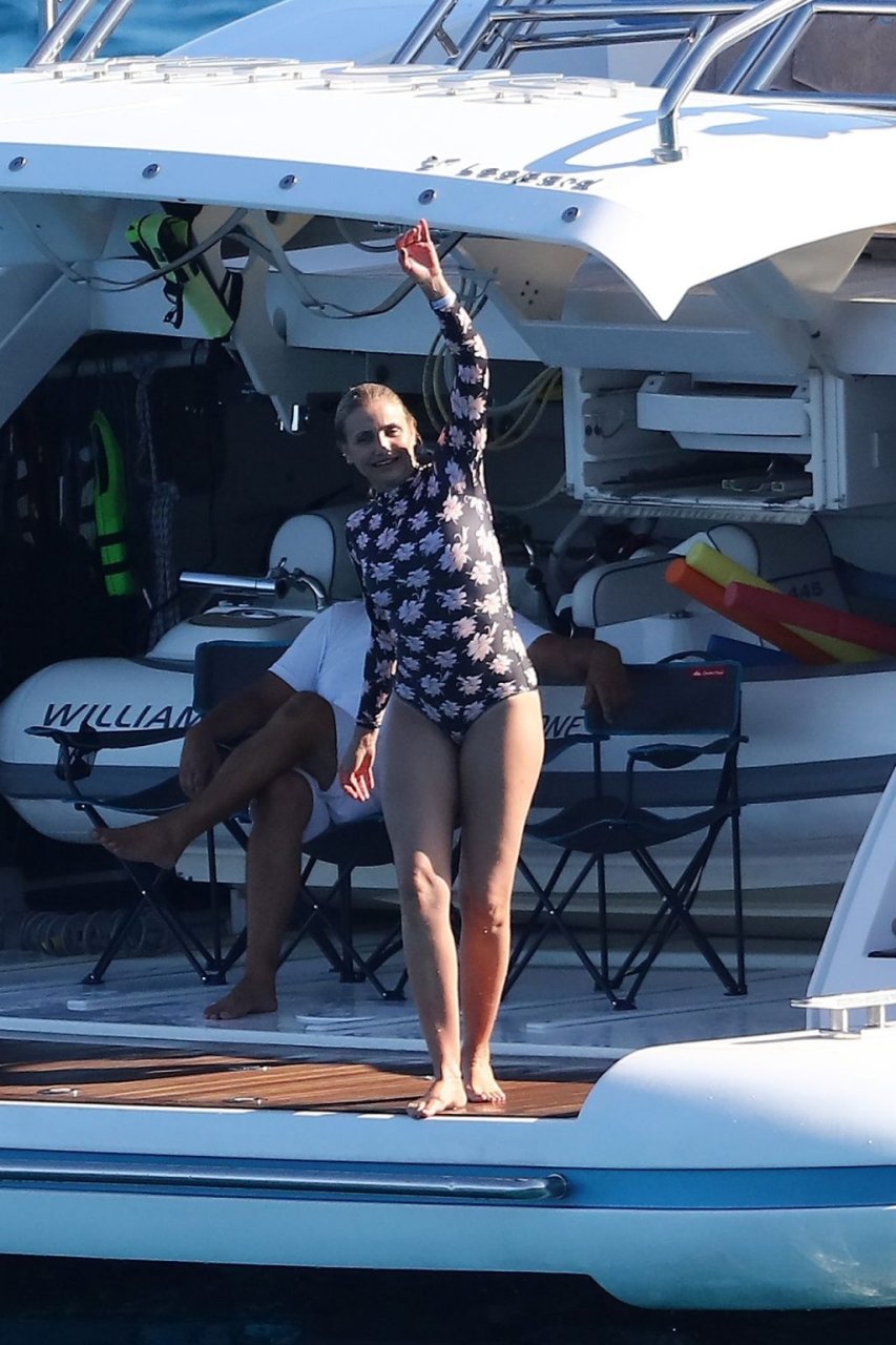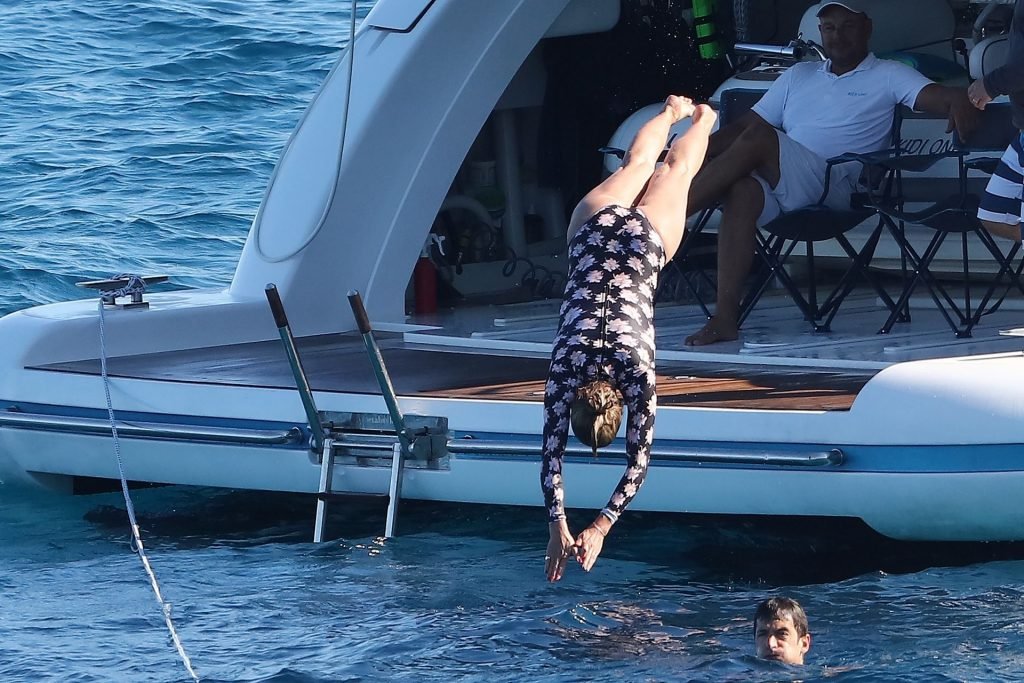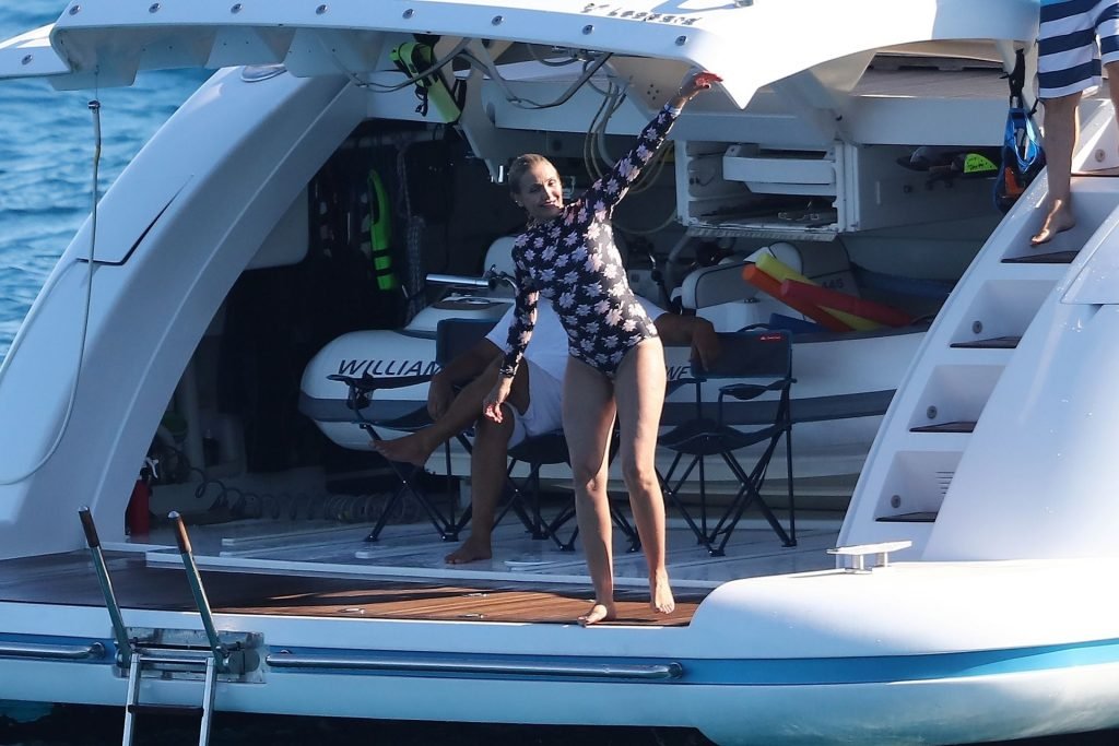 Cameron Diaz et son mari Benji Madden profitent au maximum de leurs vacances à Saint-Tropez, 08/08/2019. La star de Charlie’s Angels a été vue en train de plonger dans la Méditerranée dans un maillot une pièce fleuri qui mettait en valeur son corps fantastique.