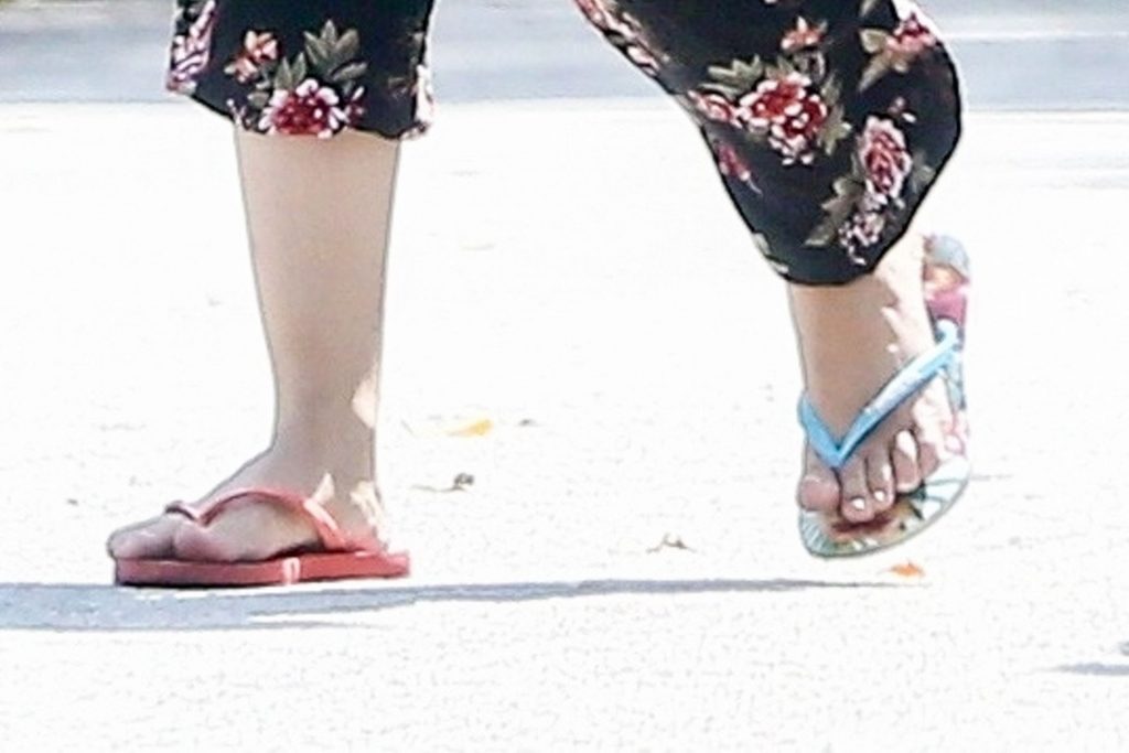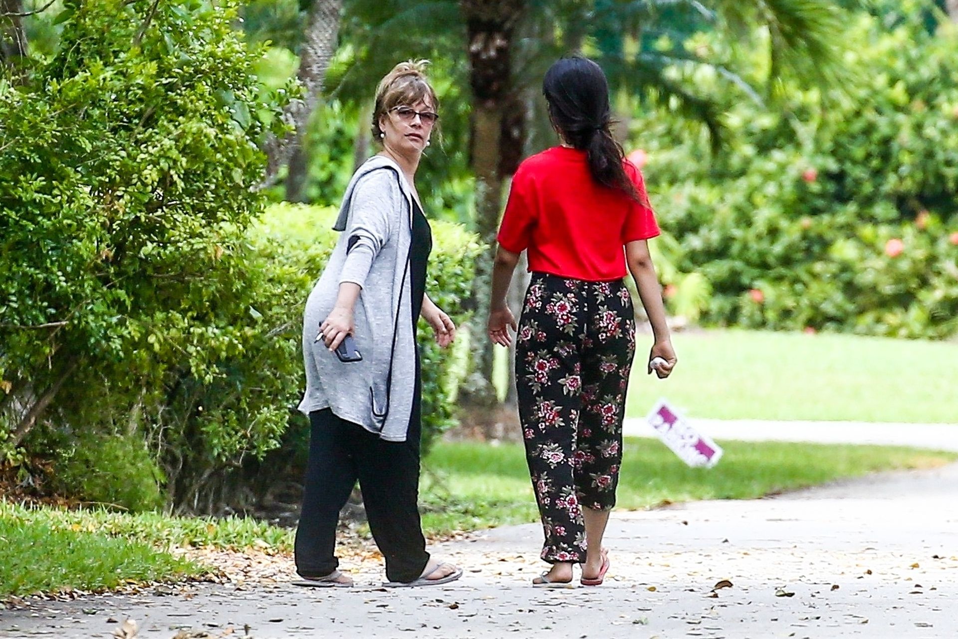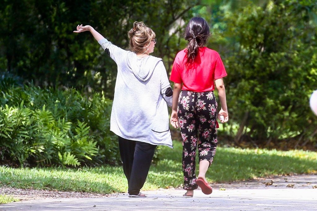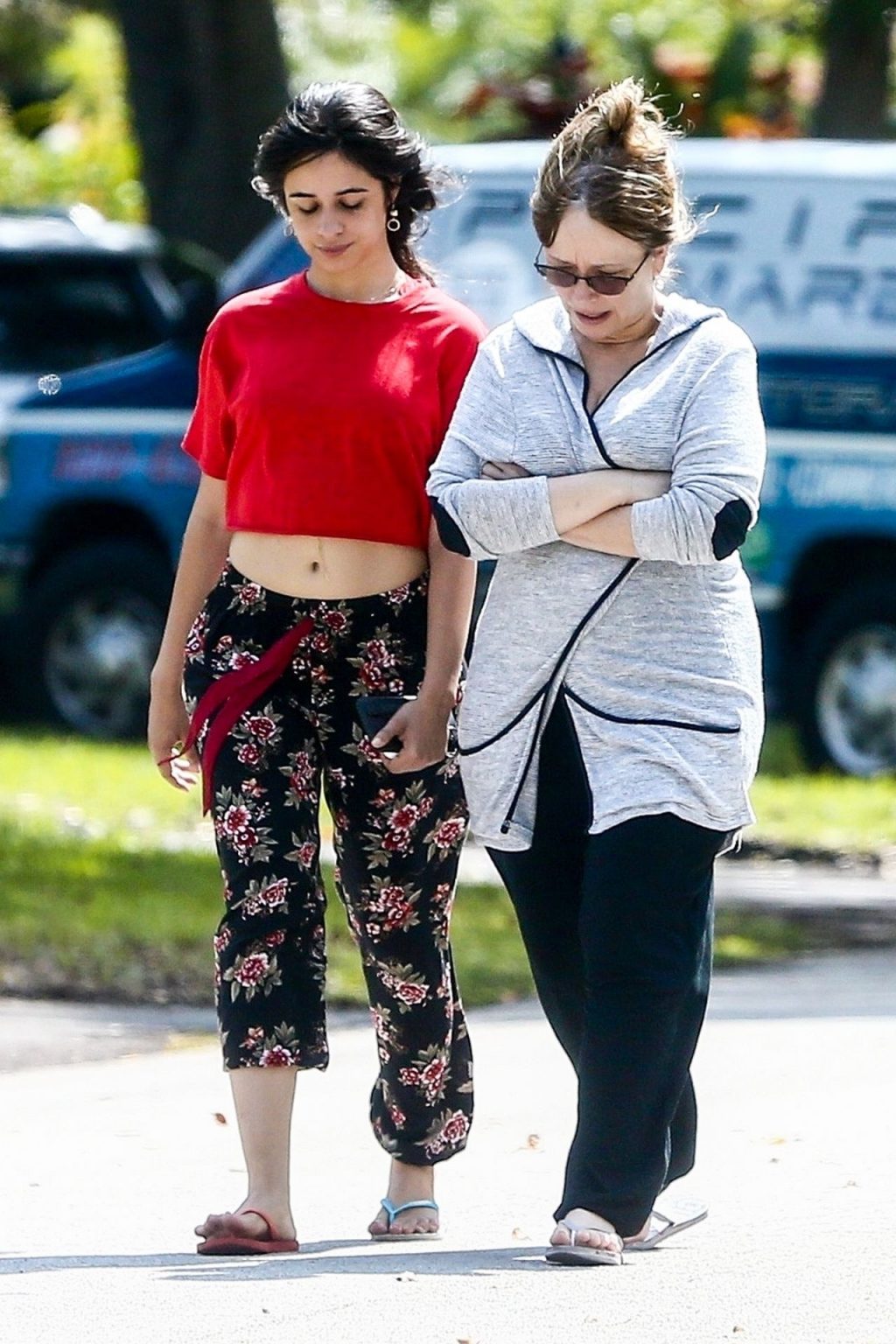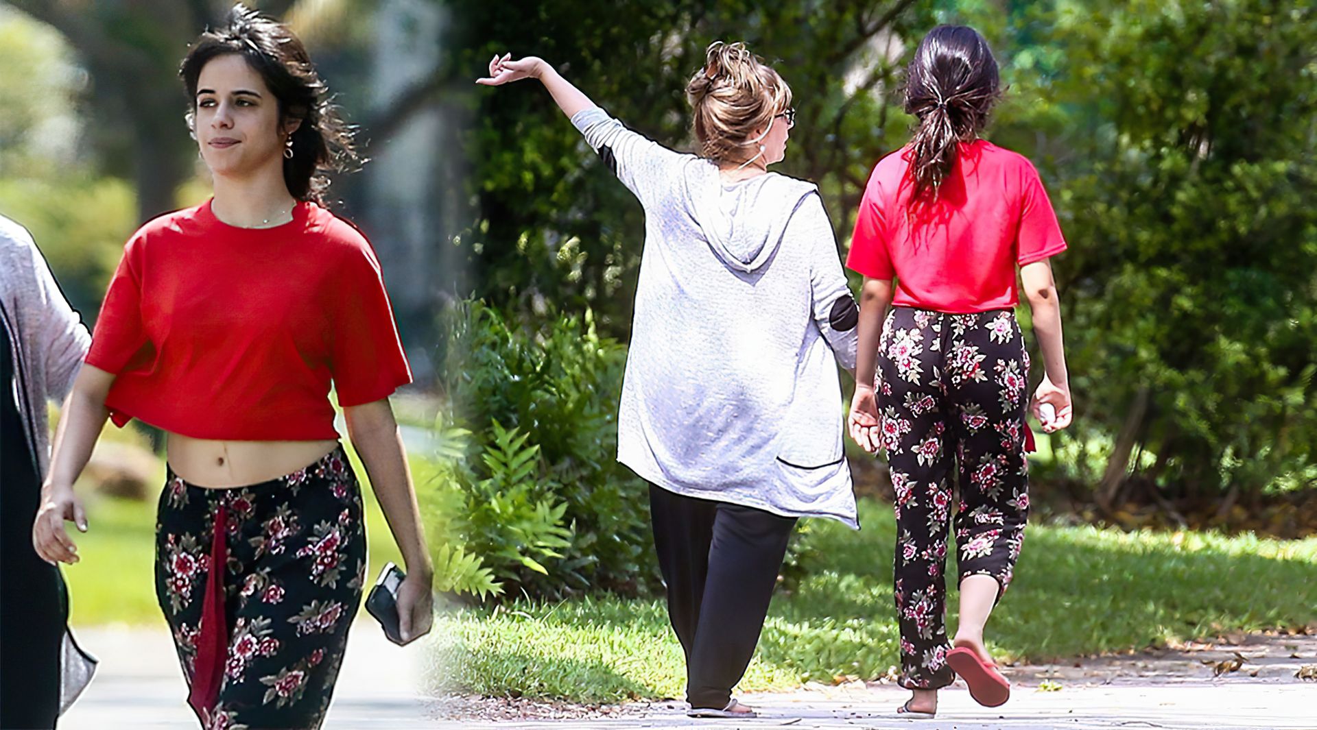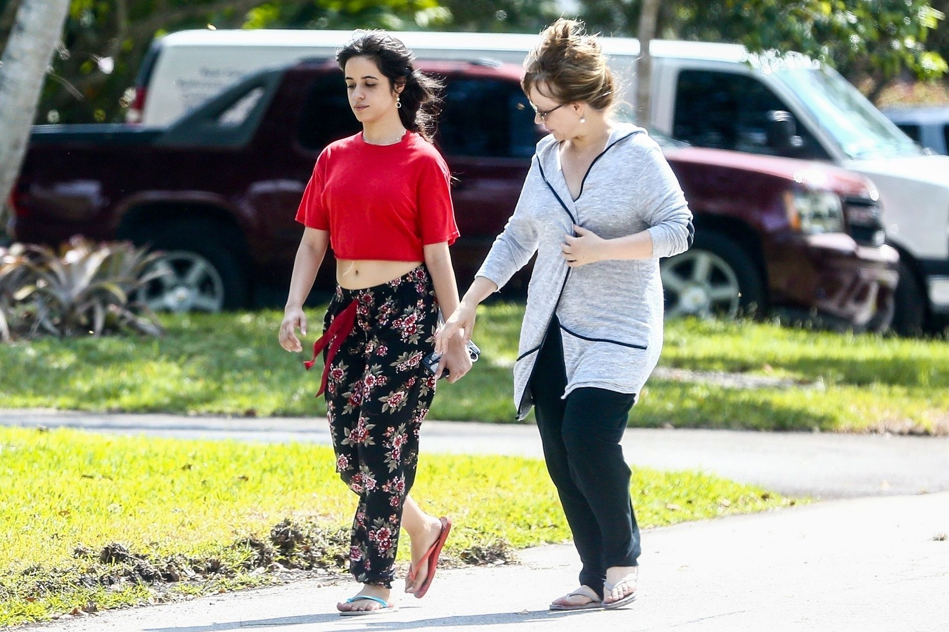 La chanteuse Camila Cabello et sa mère Sinuhe Estrabao profitent de l’air frais lors d’une promenade matinale en Floride, le 20/04/2020. Camila est sortie avec un haut rouge court et un pantalon ample à fleurs avec des tongs dépareillées.