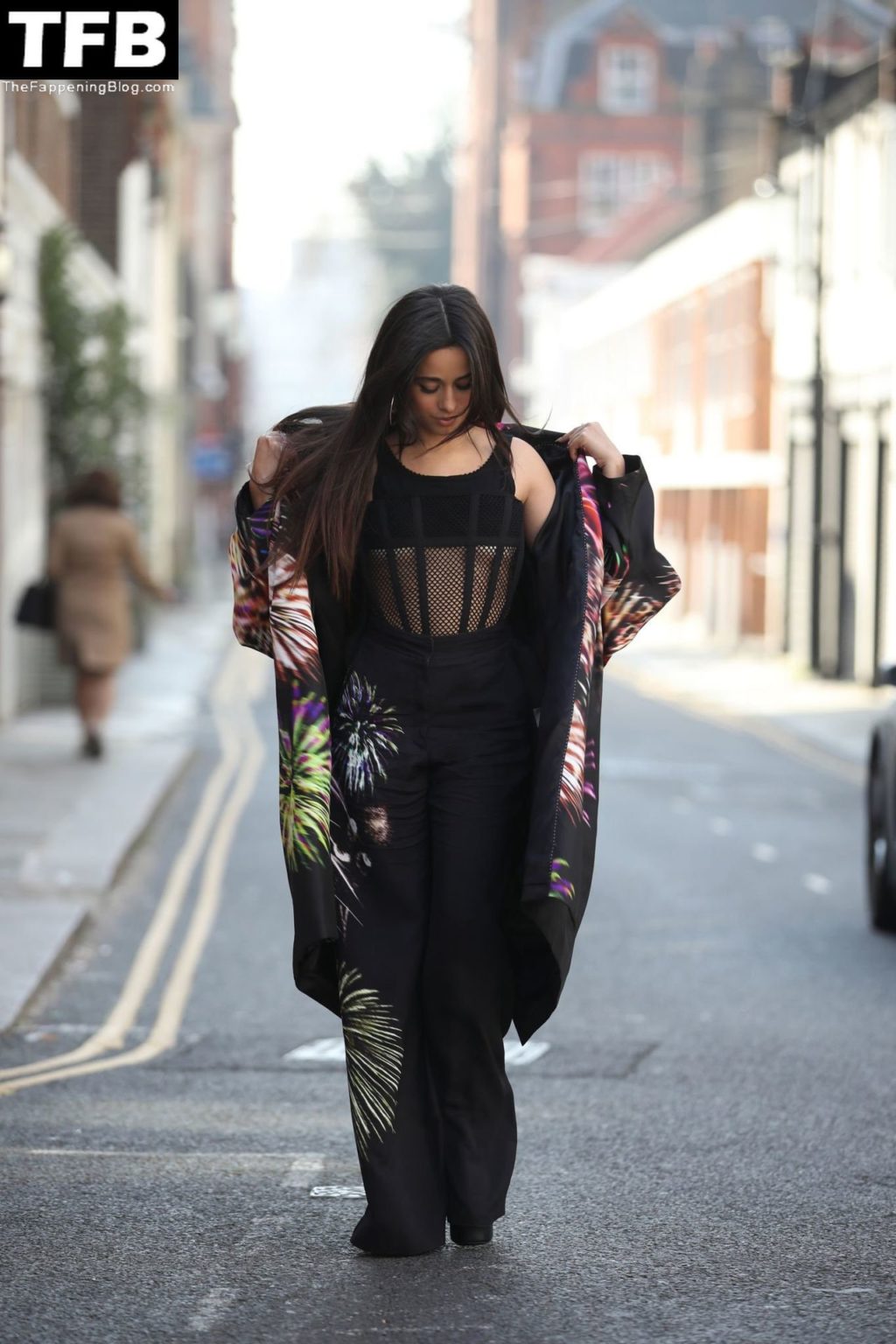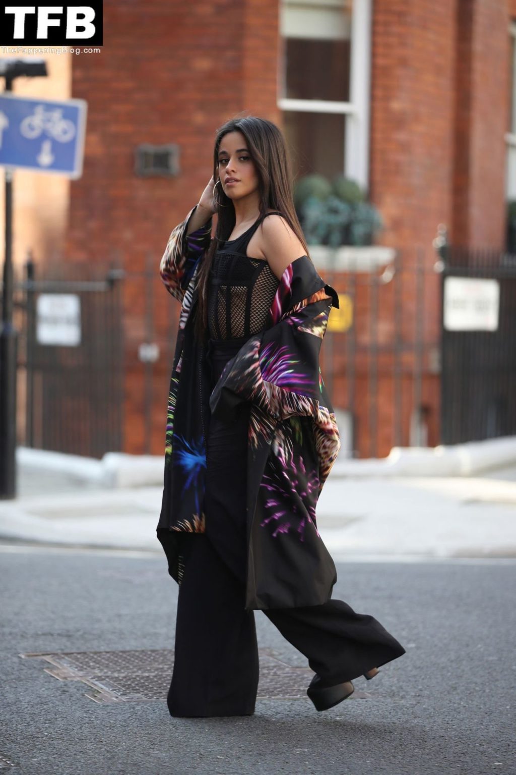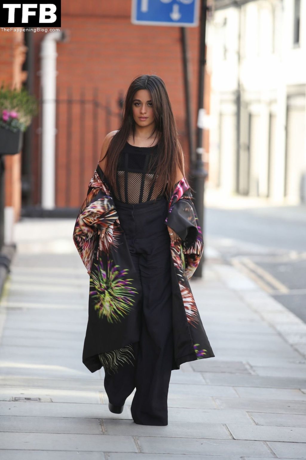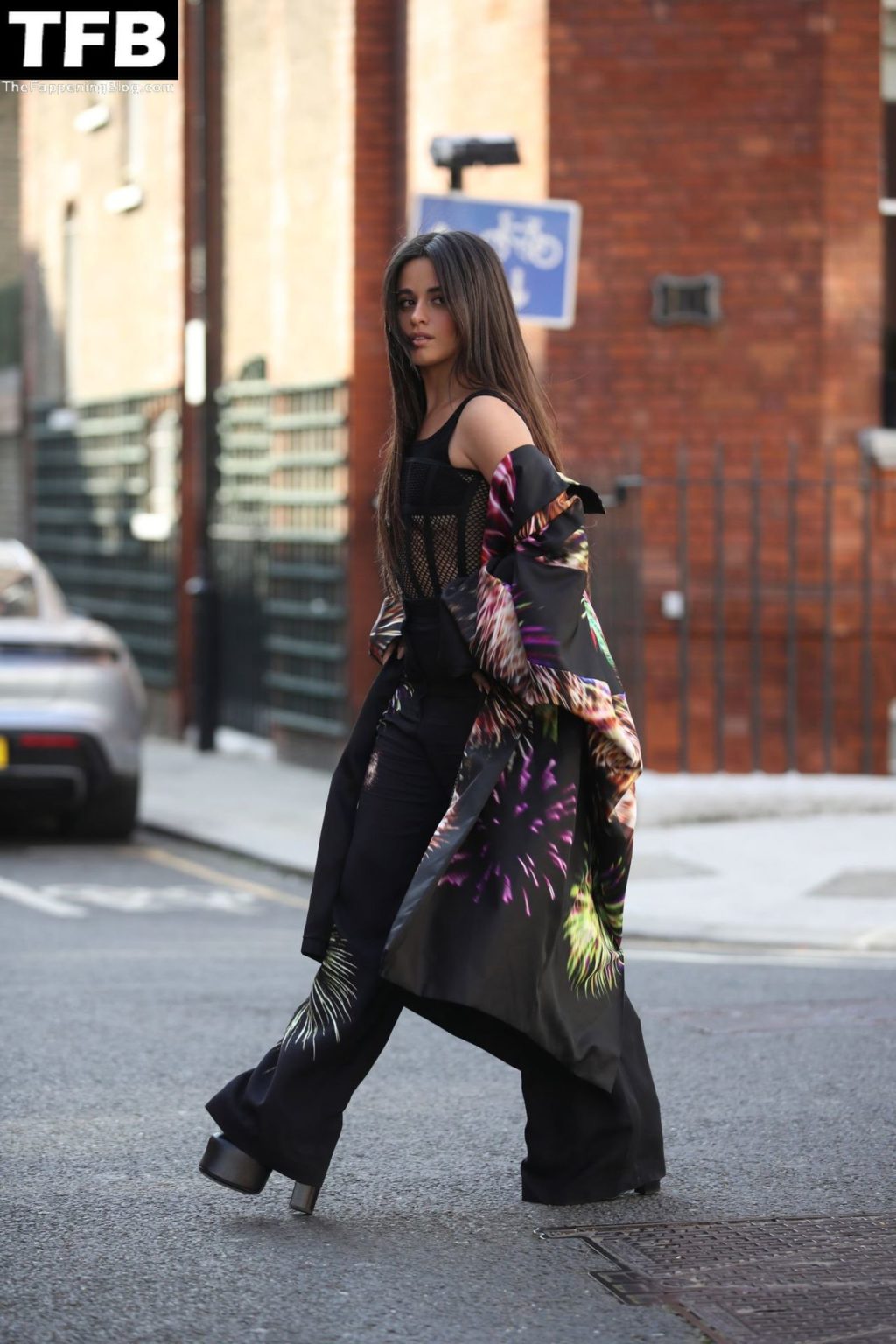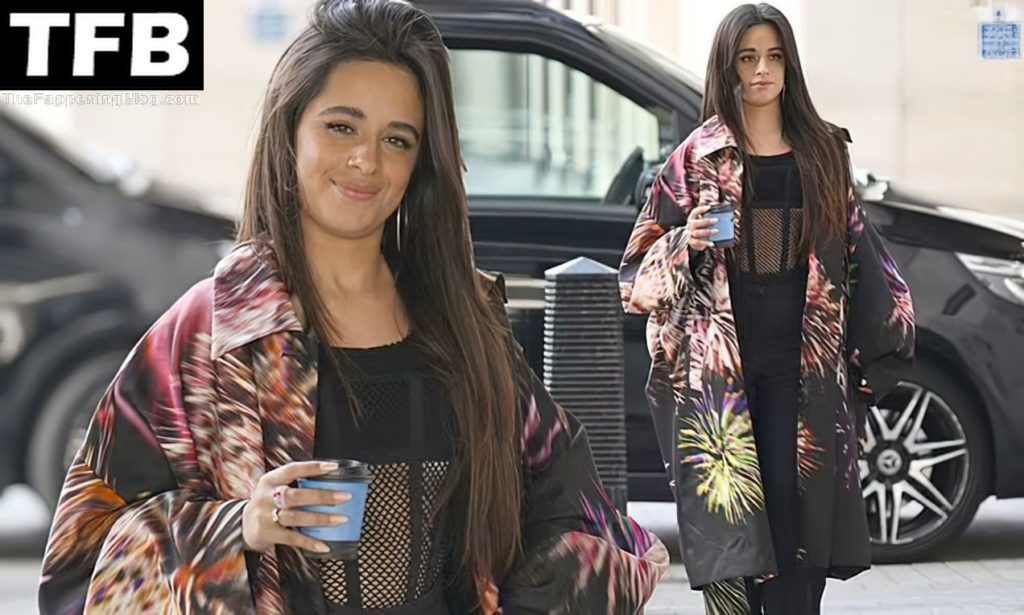 La chanteuse Camila Cabello affiche un look tendance avec un haut noir transparent et une veste multicolore à son arrivée au Radio à Londres 1 jeudi.